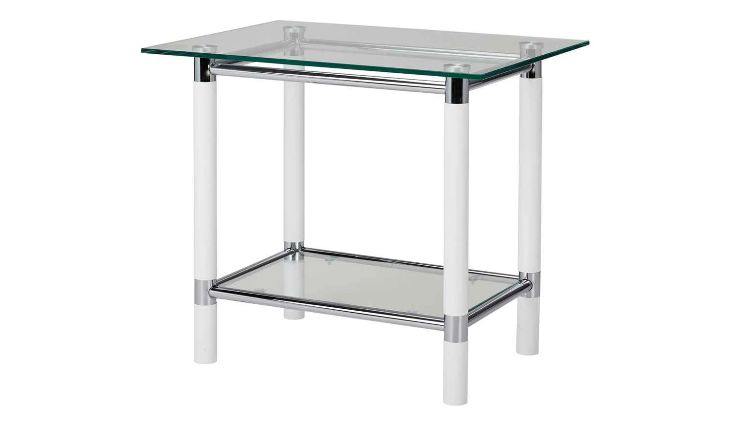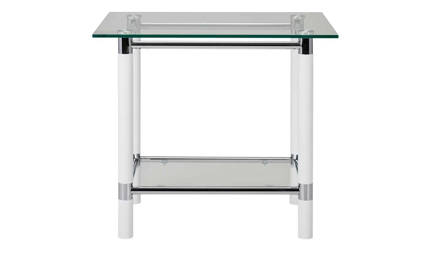 Der Beistelltisch bietet zusätzliche Stell- und Ablageflächen – und das in jedem beliebigen Raum. Dank des zeitlosen Designs können Sie ihn wunderbar mit vorhandenen Einrichtungen kombinieren. Tischplatte und Ablage bestehen aus neutralem Klarglas. Es zeichnet sich durch Robustheit aus und lässt sich leicht pflegen. Das Gestell aus Metall ist mattweiß lackiert und wird von Chromakzenten abgesetzt.