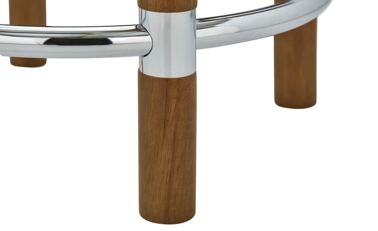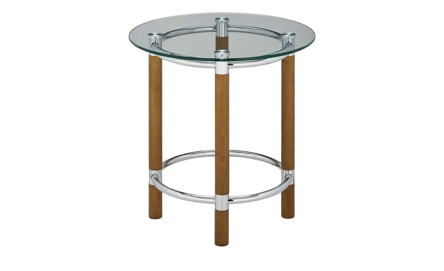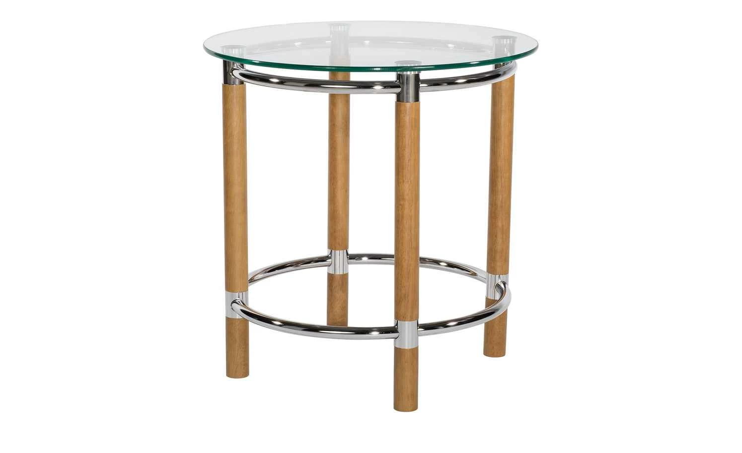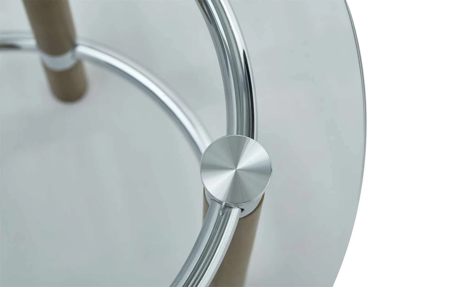 Der runde Beistelltisch besteht aus einem modernen Material-Mix: Die vier runden tabakfarbenen Holzstandbeine werden durch zwei verchromte Metallringe verstärkt. Die Tischplatte ist aus 8 mm Sicherheitsklarglas gefertigt und bietet Platz für Accessoires oder Blumenarrangements.