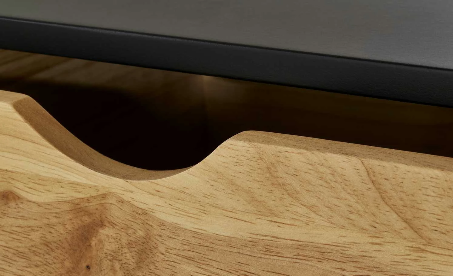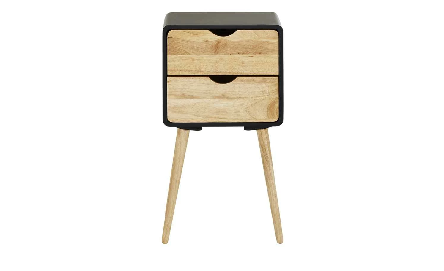 Der Beistelltisch Cassarina hat ein frisches, modernes Scandi-Design. Front und Gestell bestehen aus naturbelassenem Gummibaum. Der Tischplatte und Korpus setzen sich in Schwarz ab. Sie sind lackiert. Cassarina bietet – neben der Ablagefläche der Tischplatte – Stauraum in zwei Schubladen.