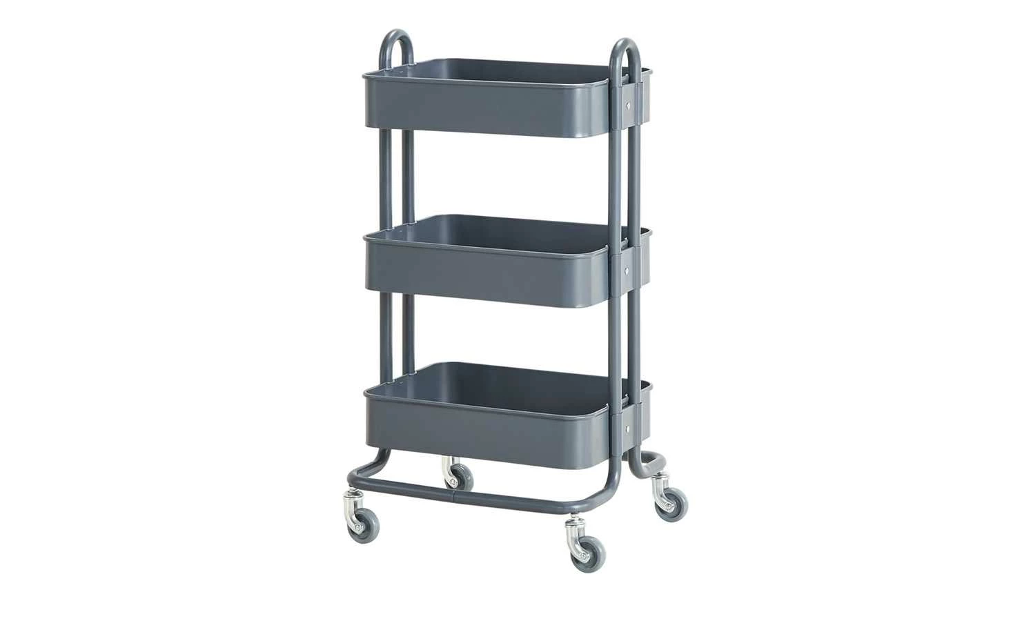 Richtig praktisch ist der Beistelltisch Grigio. Durch die Rollen können Sie ihn dorthin rollen, wo Sie ihn benötigen. Grigio verfügt über drei Ablagen mit einem erhöhten Rand. Ablagen und Gestell sind aus lackiertem Metall.