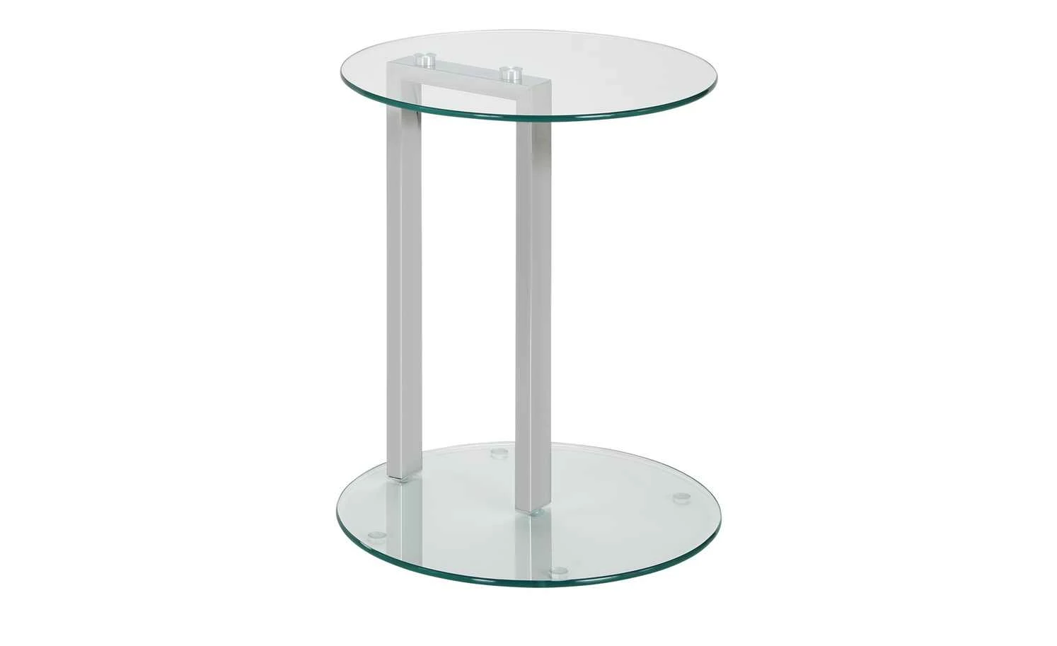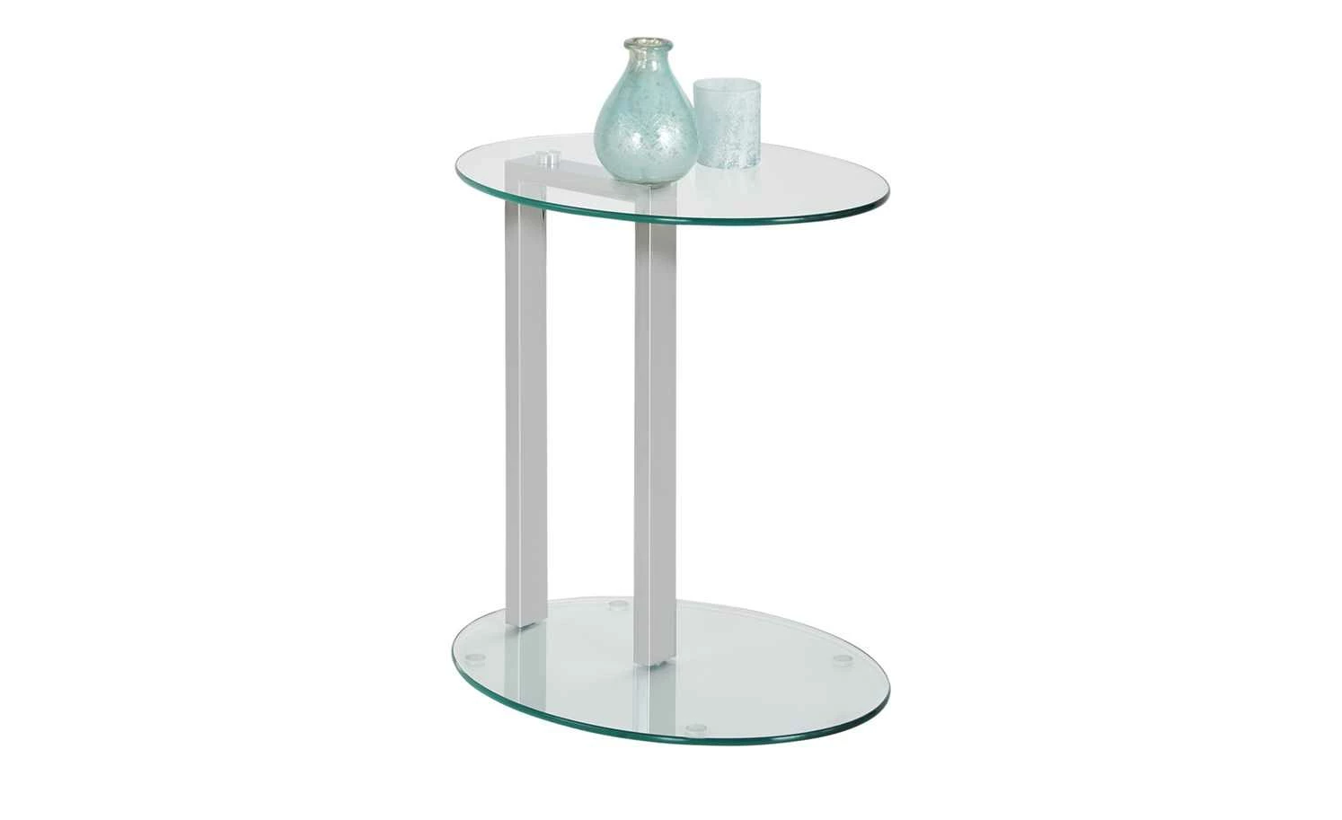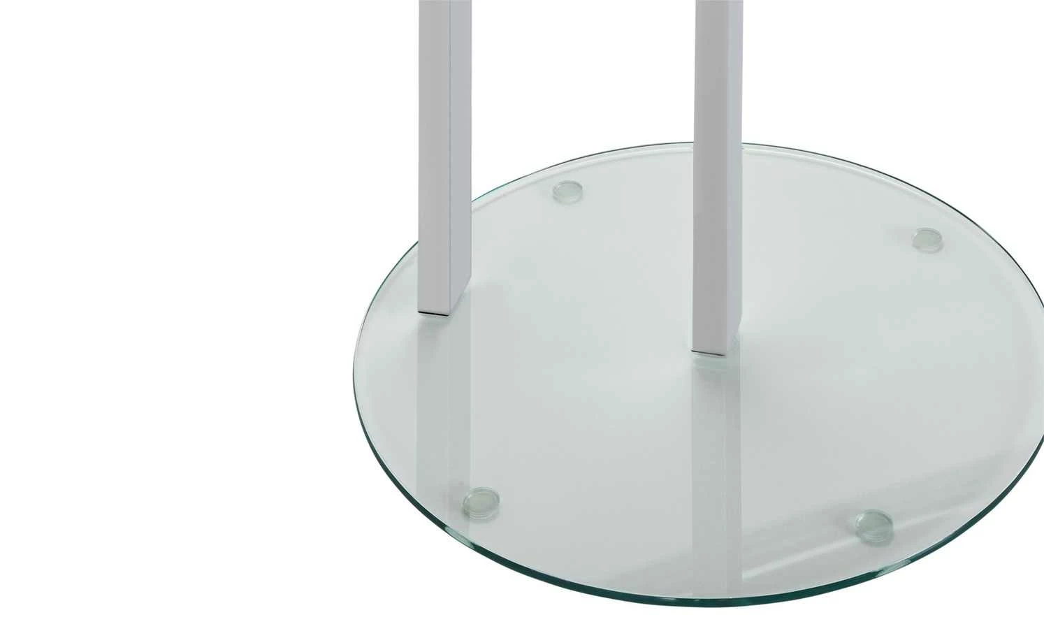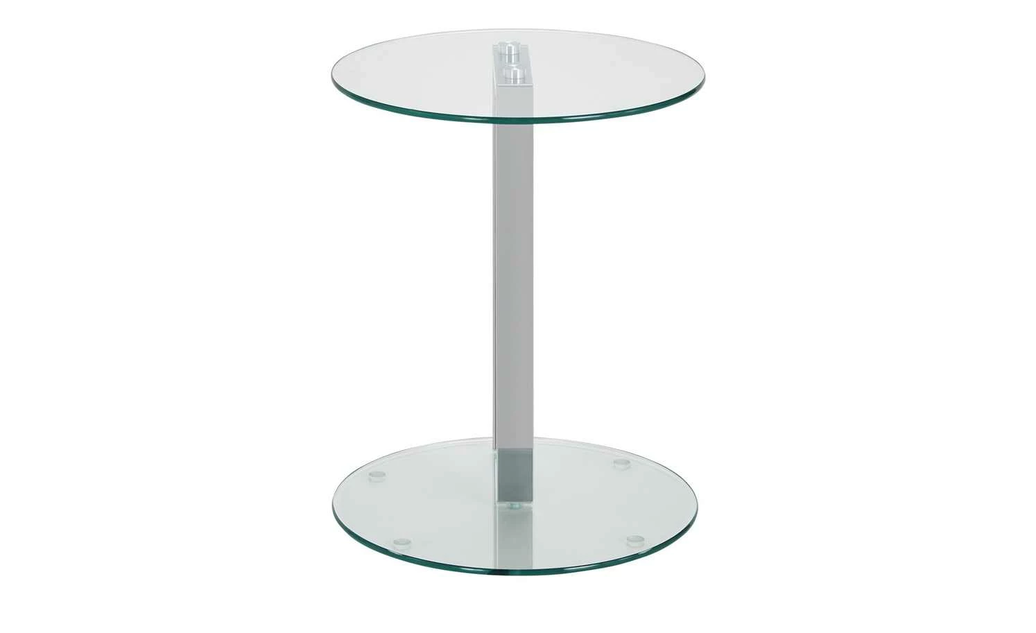 Hanau ist ein dekorativer kleiner Beistelltisch. Er macht im Wohnraum eine ebenso gute Figur wie in Flur oder Wintergarten. Im Schlafzimmer kann Hanau auch als Nachttischchen dienen. Tischplatte und Fuß sind aus Glas. Wobei für die Tischplatte ein Sicherheitsglas verwendet wurde. Es ist besonders robust. Staub und Flecken können Sie leicht wegwischen. Das Säulengestell ist aus verchromtem Stahl.