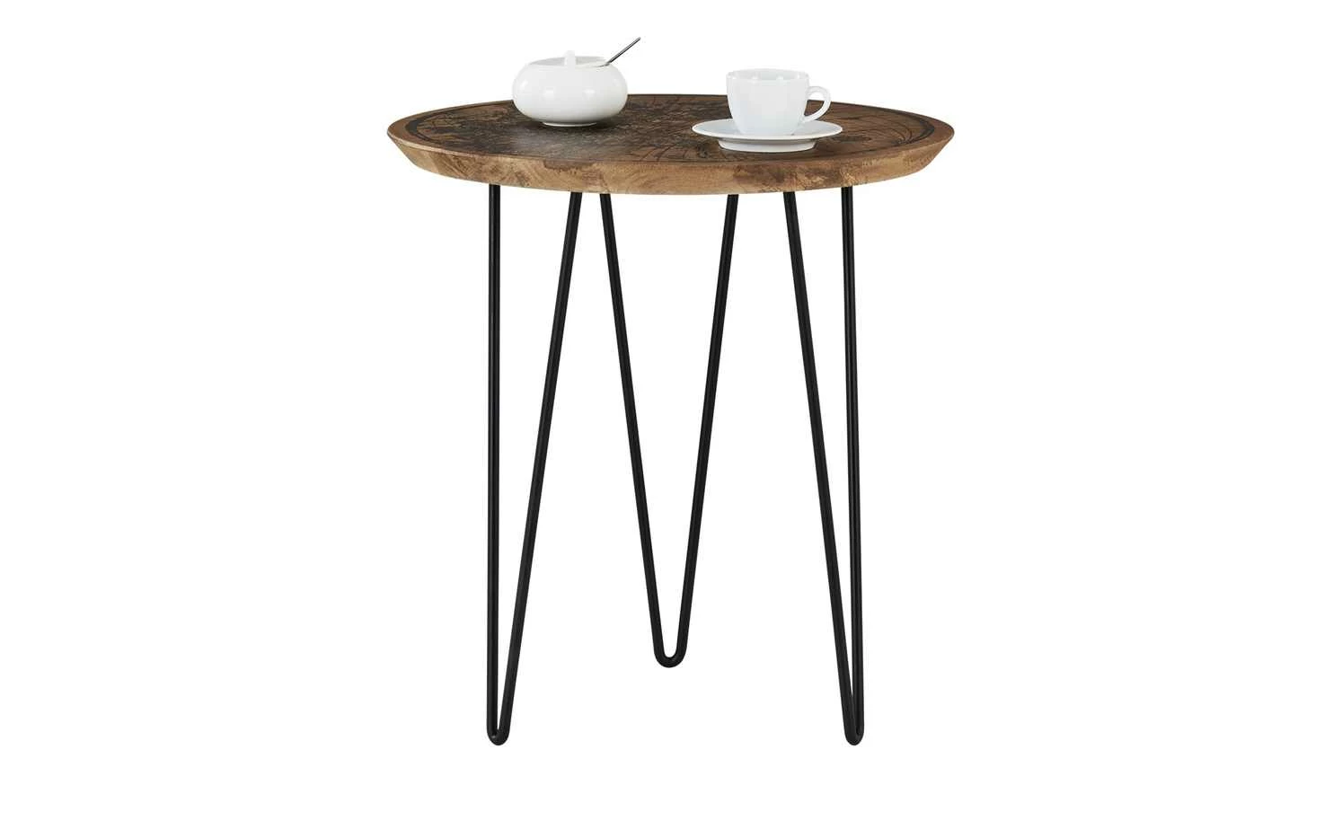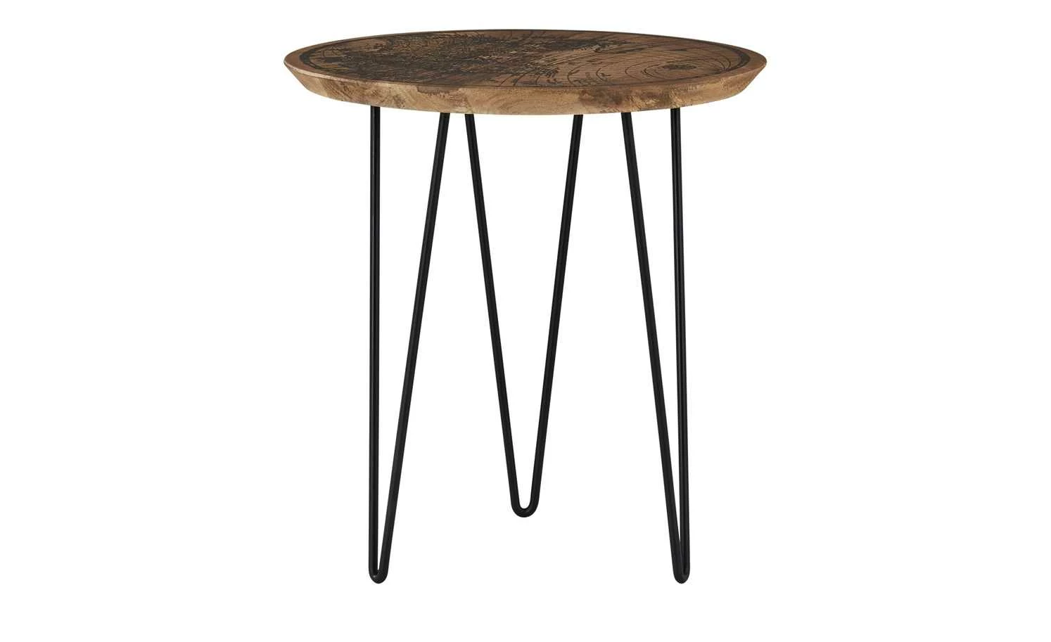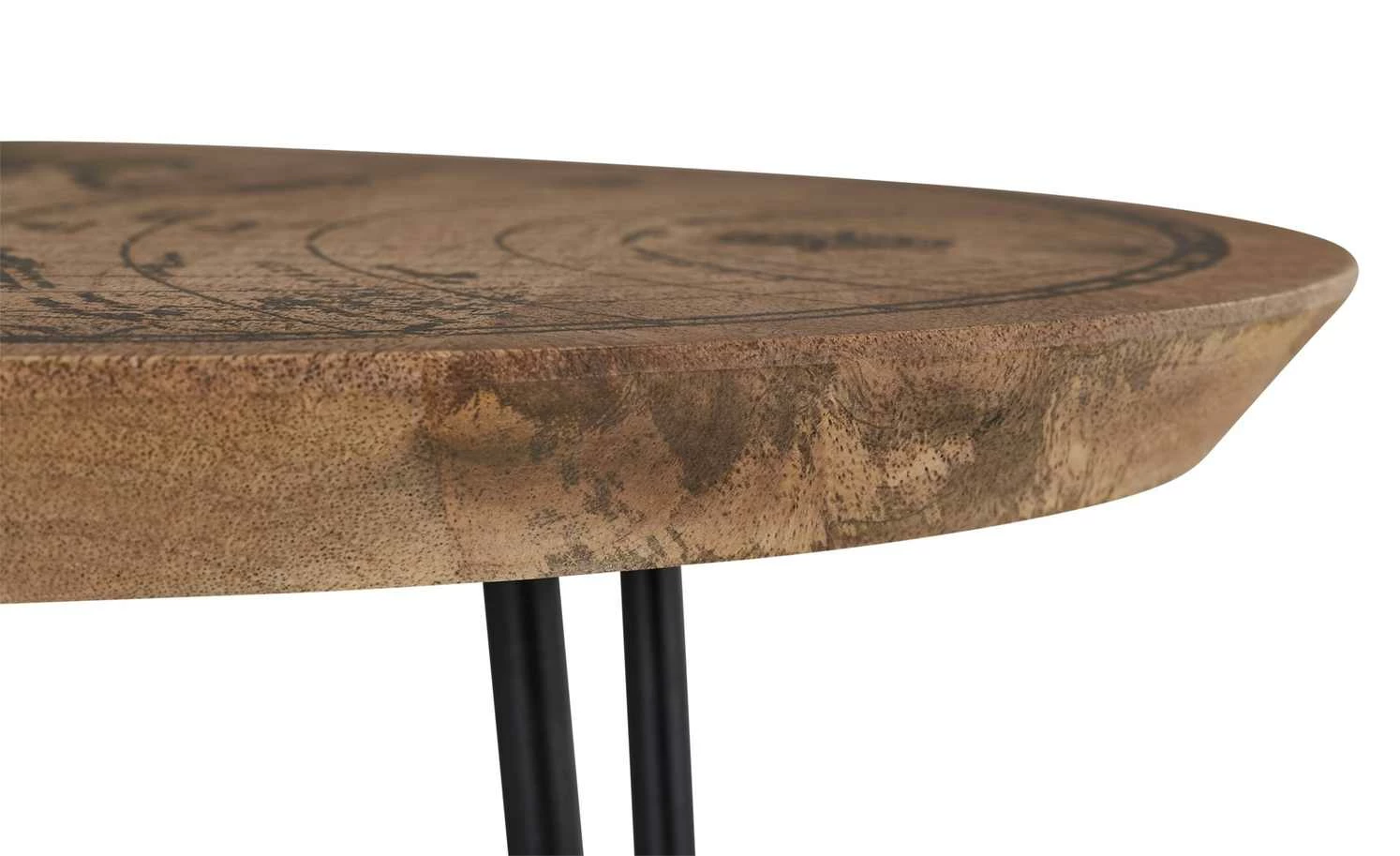 Eyecatcher des Beistelltisches Piazza: die Tischplatte. Sie ist mit einer Weltkarte bedruckt – komplett mit Breiten- und Längengraden und nautischer Rose. Die Tischplatte selbst besteht aus massivem Mangoholz und ist gebeizt und anschließend lackiert worden. Die drei Tischbeine sind aus Metall gefertigt.