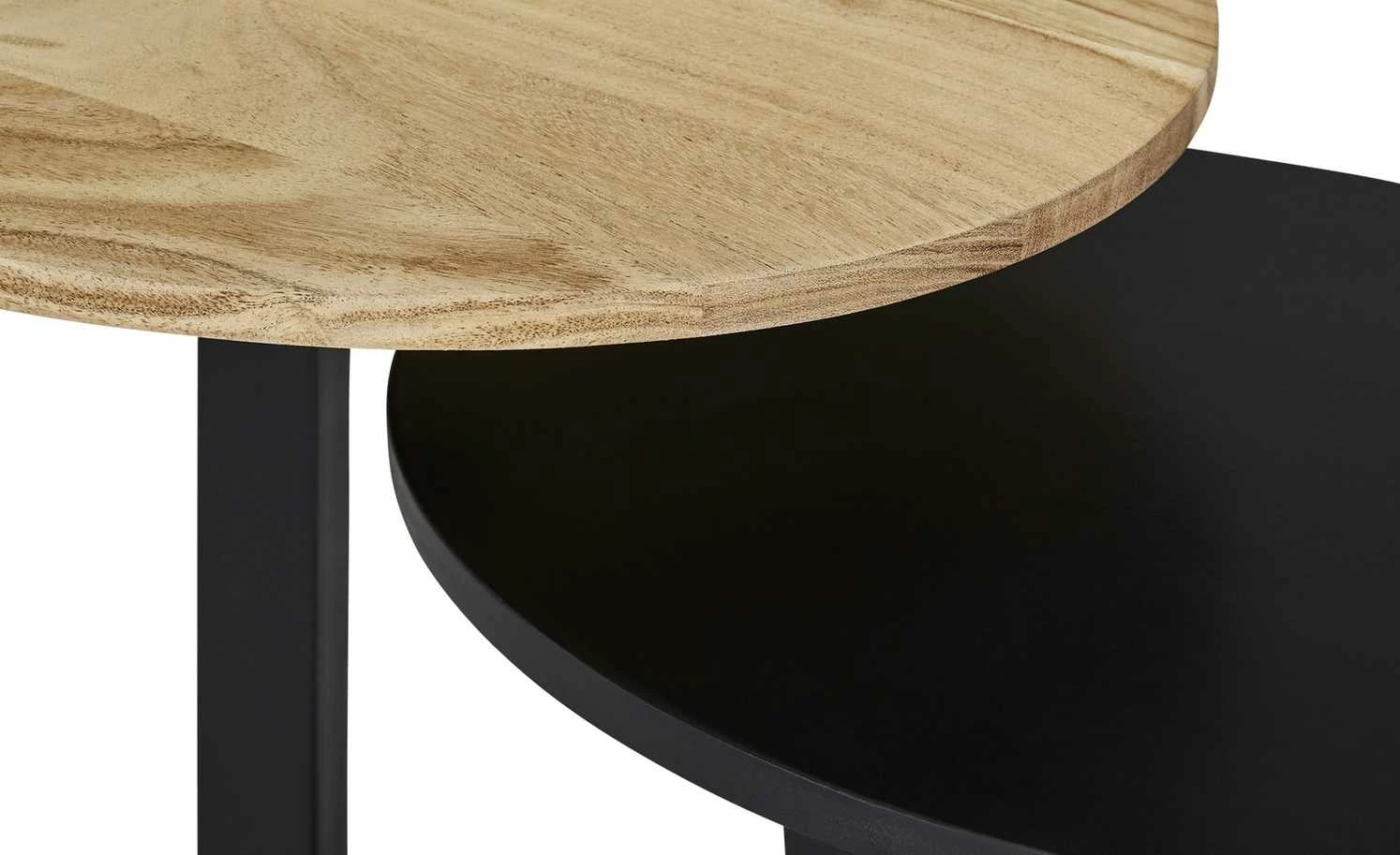 Der Beistelltisch Place greift den beliebten urbanen Loft-Stil gekonnt auf. Hier setzt schwarzes Metall einen bewussten Kontrast zu gebeiztem Akazienholz. Gleich zwei runde, leicht versetzte Ablageflächen stehen Ihnen zur Verfügung. Die obere Tischplatte wirkt durch das gebeizte Akazien-Massivholz hell und freundlich. Die untere ist ebenso wie das Gestell schwarz gehalten und wirkt als Kontrast-Part. Alle Oberflächen sind zum Schutz lackiert und dadurch pflegeleicht. Der Beistelltisch Place kann in diverse Raumkonzepte integriert werden.