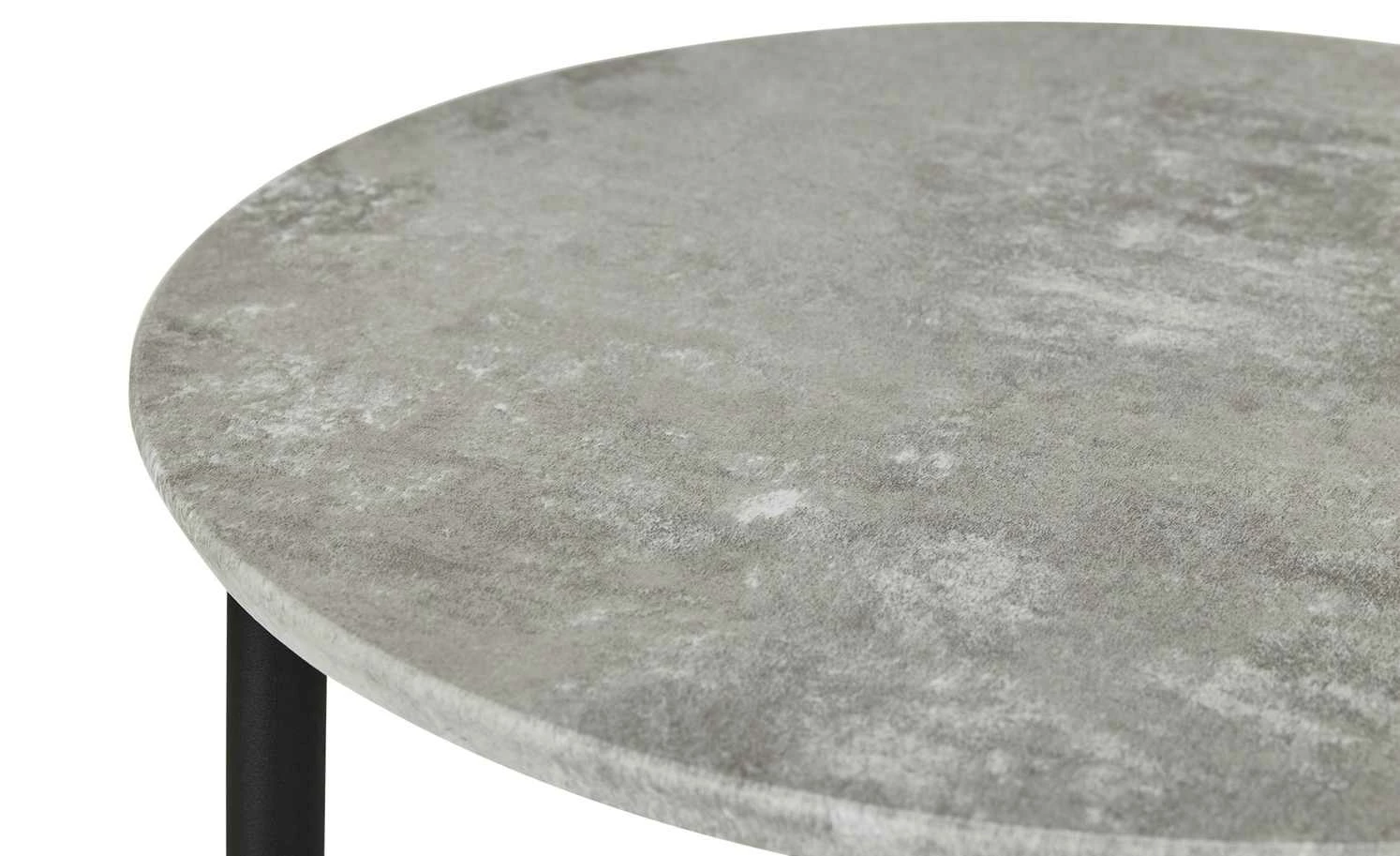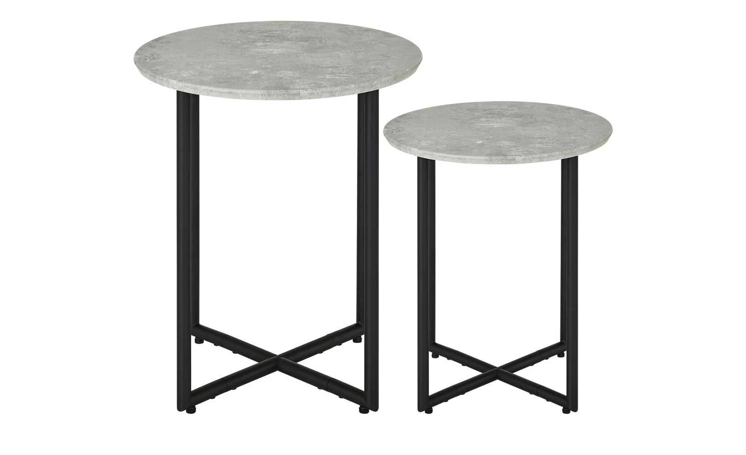 Die beiden Beistelltisch Anik ergänzen sich perfekt. Der kleine Tisch kann teilweise unter den großen Tisch geschoben werden, aber Sie können die beiden auch gerne einzeln platzieren. Ganz wie Sie mögen. Die Tischplatten sind rund und haben ein modernes Beton-Dekor (Nachbildung). Es wird vom schwarzen Kufengestell abgesetzt. Es ist pulverbeschichtet und hat ein mattes Finish.