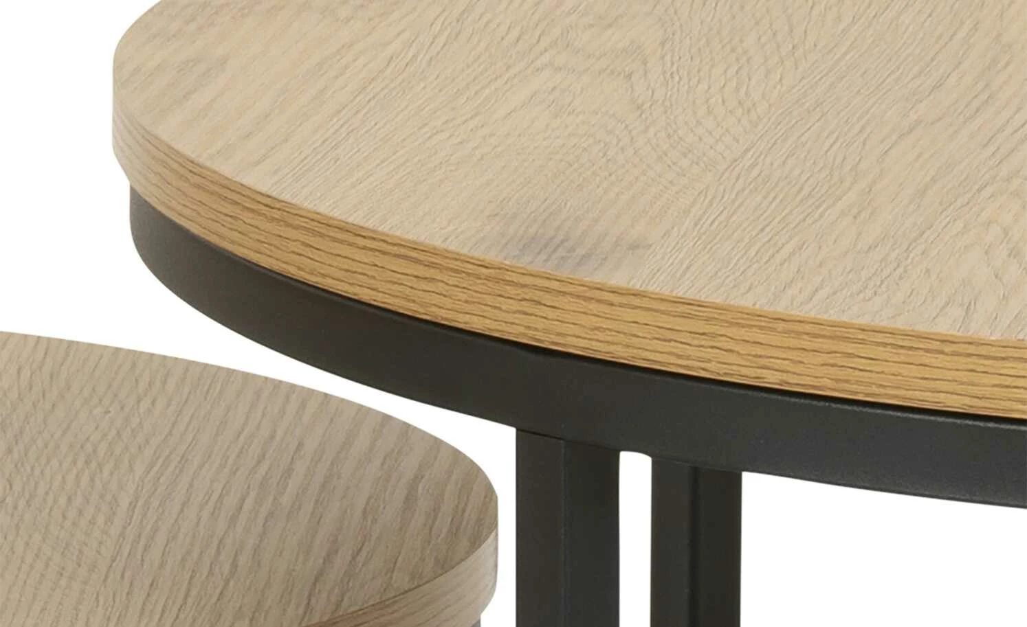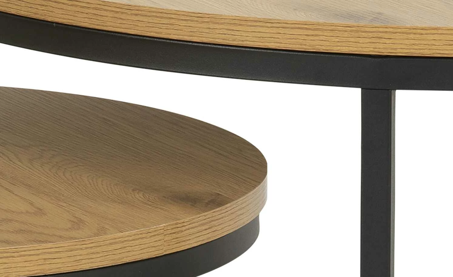 Diese beiden Couchtische erinnern an den beliebten Industrial-Style, der zu nahezu allen Einrichtungskonzepten passt. Schwarzes, pulverbeschichtetes Metall und runde Tischplatten in attraktiver Wildeichen-Optik sind das Markenzeichen der beiden Couchtische. Platzieren Sie die Tische direkt nebeneinander oder leicht versetzt und gestalten Sie Ihre Wohnlandschaft ganz nach Ihren Wünschen.