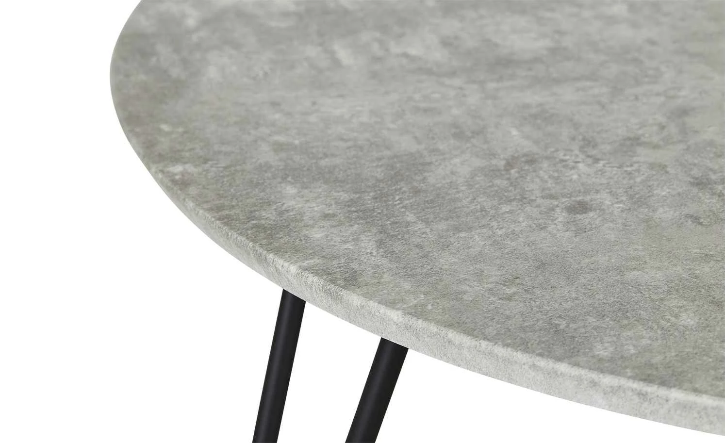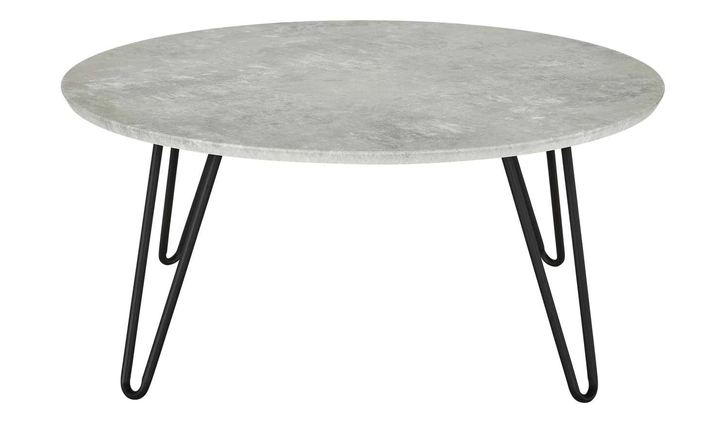 Angus ist ein Couchtisch mit modernem Gesamtlook. Die runde Tischplatte hat ein Dekor in Beton (Nachbildung). Die vier Tischbeine setzen sich davon in Schwarz ab. Sie sind offen und luftig gestaltet. Durch das stabile Metall sorgen sie dabei aber für einen soliden Stand.
