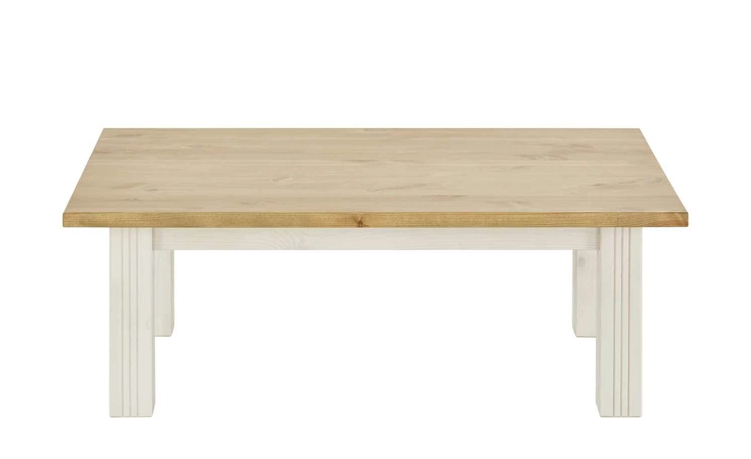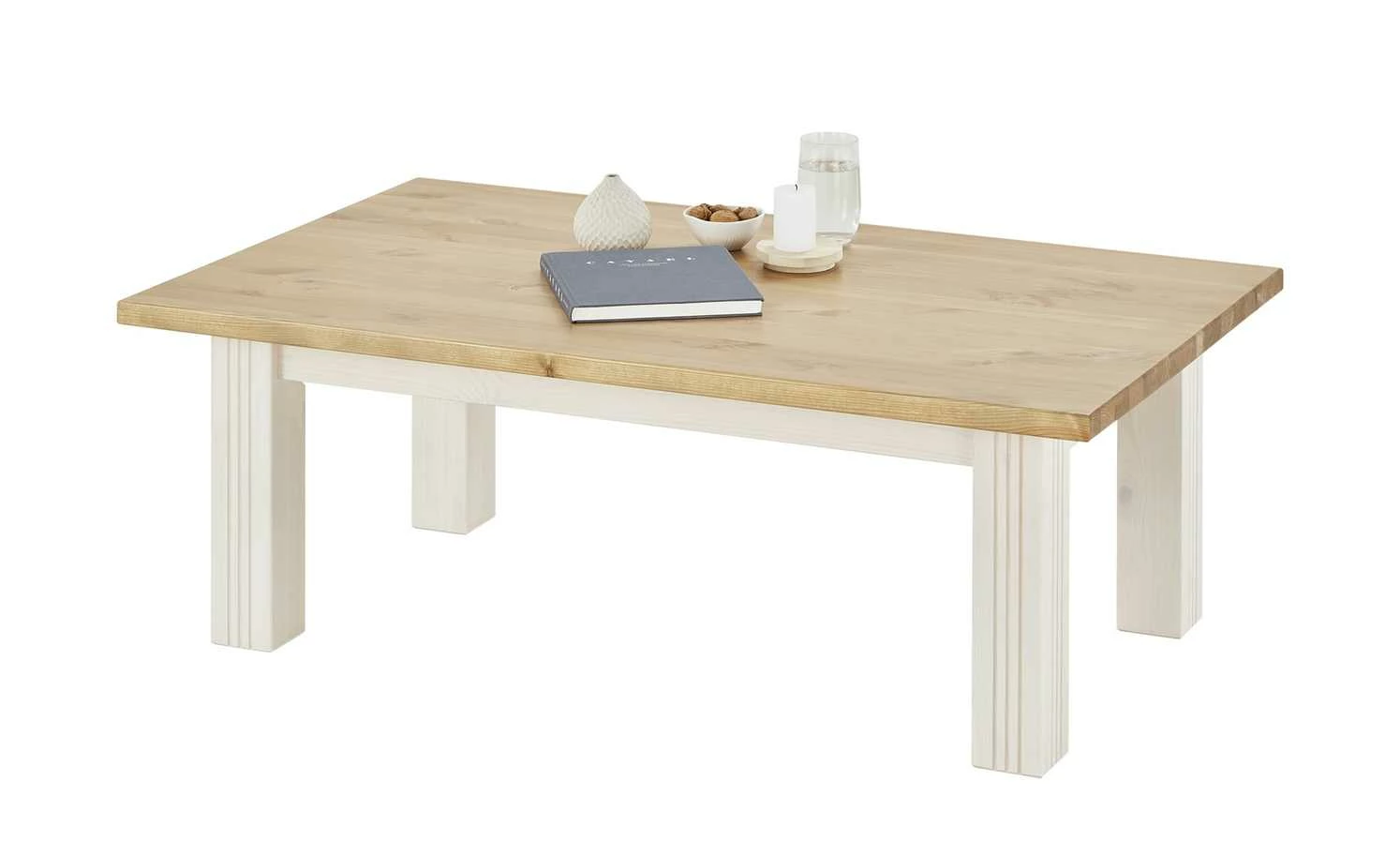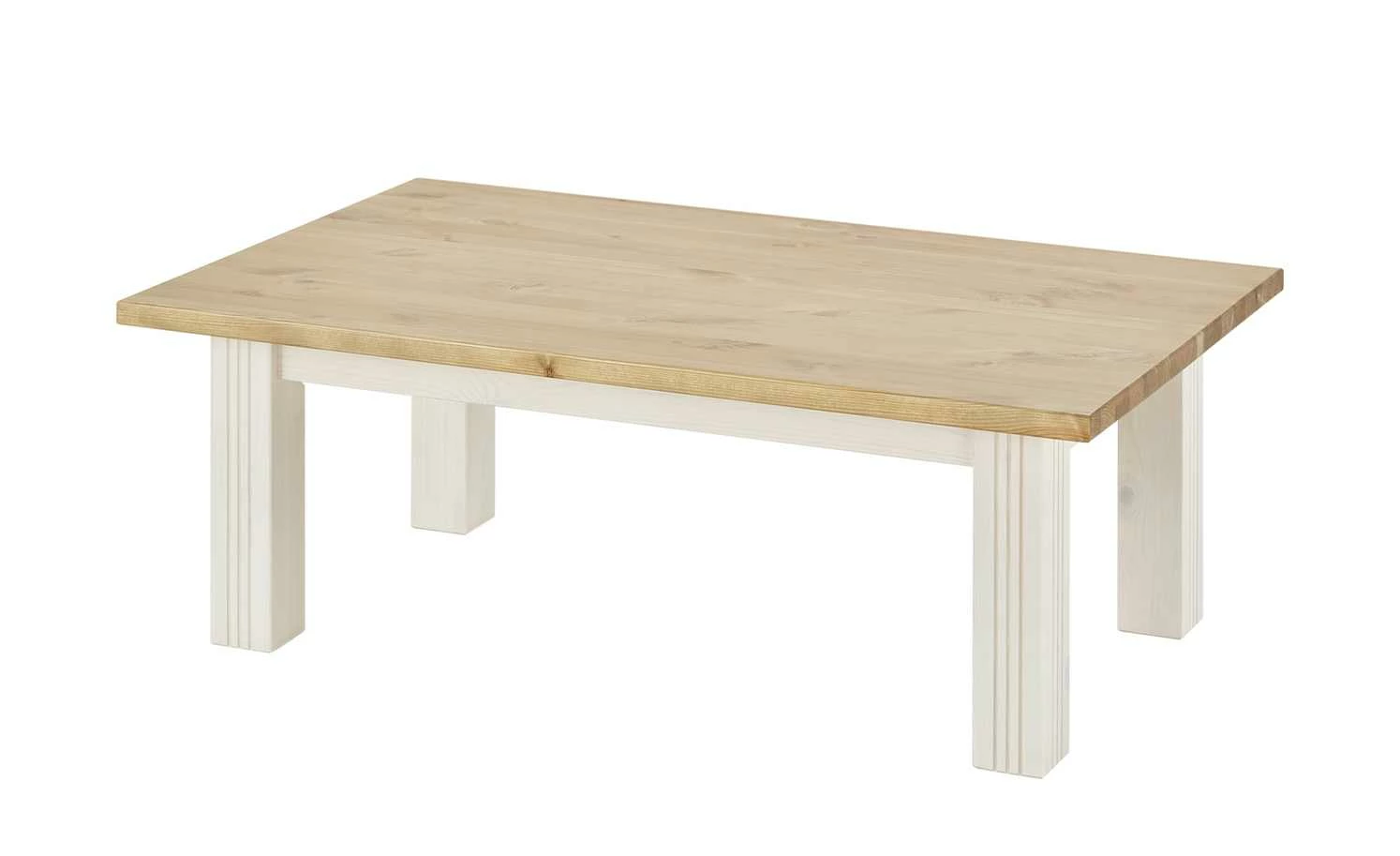 Der rustikale Couchtisch im Landhausstil ergänzt die Möbelserie Bornholm perfekt, kann durch sein attraktives Design aber auch mit anderen Wohnstilen kombiniert werden. Der Tisch ist aus massivem Kiefernholz gefertigt und somit sehr stabil und langlebig. Das weiß gewachste Tischgestell setzt sich kontrastreich von der antikfarben lackierten Tischplatte ab.
