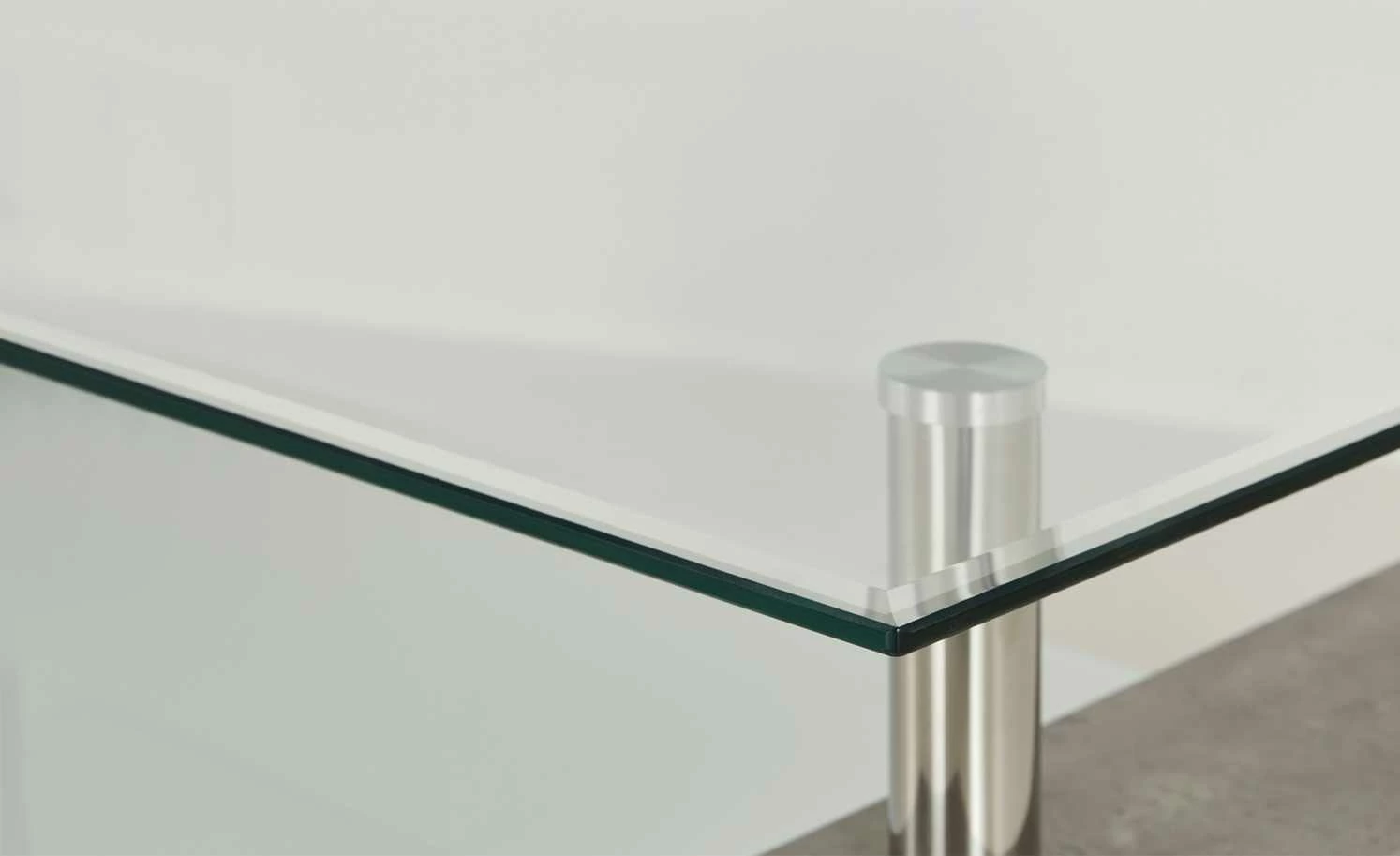 - Mehr zum Material: Ablageplatte: Glas satiniert, Absetzungen aus poliertem Edelstahl, Tischplatte: Klarglas