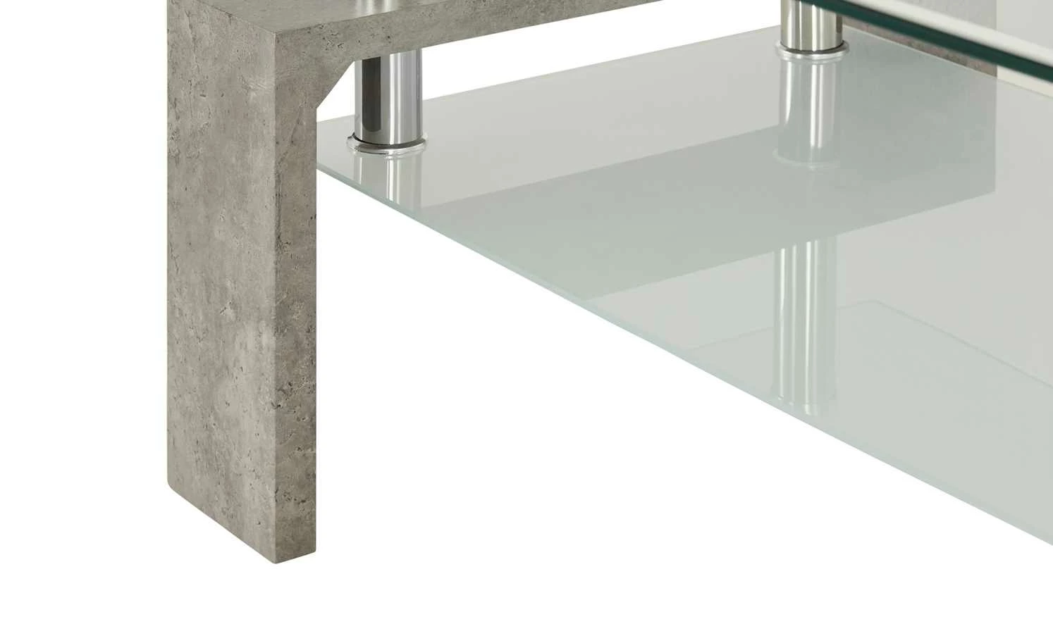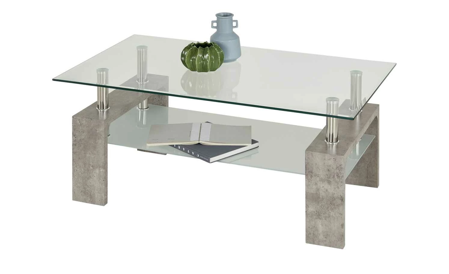 Ein modernes, gradliniges Design macht den Couchtisch Elba zum Highlight des Wohnzimmers. Das Gestell hat eine auffällige Betonoptik. Durch die beschichtete Oberfläche ist es strapazierfähig. Die zylinderförmigen Absetzungen sind aus Edelstahl und poliert. So setzen sie sich vom Gestell ab. Die eckige Tischplatte aus Klarglas verfügt über einen Facettenschliff am Rand. Durch die Verwendung von Glas ist die Tischplatte besonders pflegeleicht. Etwaige Flecken brauchen Sie einfach nur mit einem feuchten Tuch abzuwischen. Elba hat außerdem eine Ablage, auf der Sie Bücher oder Zeitschriften platzieren können. Die Ablage ist aus satiniertem Glas und setzt sich somit von der Tischplatte ab.