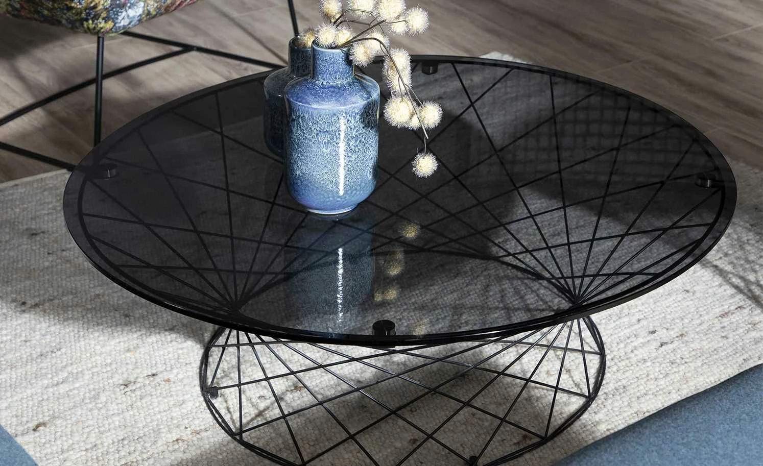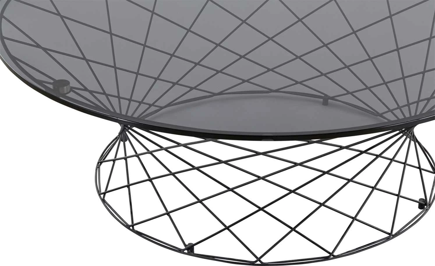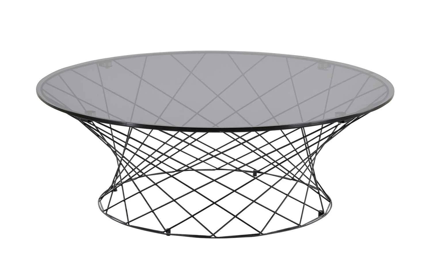 Ein Eycatcher im Industrial Style wertet jedes moderne Einrichtungskonzept auf. Wie zum Beispiel der Couchtisch Gip I. Das auffällige Gestell aus pulverbeschichtetem Metall besteht aus vielen zierlichen Streben, die sich kreuzen. Darauf liegt eine runde Tischplatte aus Sicherheitsglas. Sie hat eine graue Farbe, ist aber dennoch transparent. Dadurch gibt sie auch bei der Draufsicht den Blick auf das Design-Gestell frei.