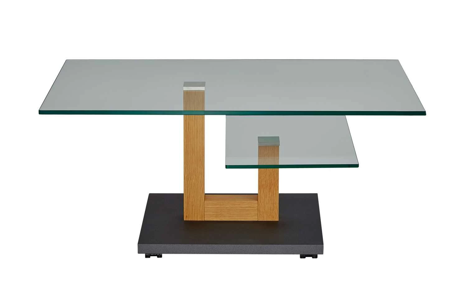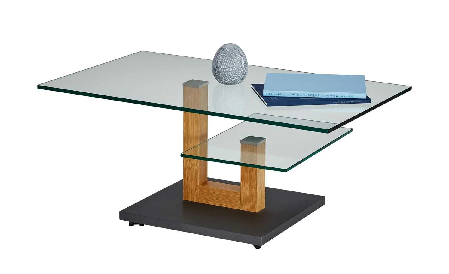 Der Couchtisch Hadar ist nicht nur attraktiv anzuschauen, sondern auch praktisch. Das macht ihn zum Highlight Ihres Wohnzimmers. Der Tisch besteht aus hochwertigen Materialien und ist mit dem Gütesiegel Made in Germany ausgezeichnet. Hadar verfügt über ein zweigeteiltes Säulengestell, dass Tischplatte und Ablage trägt. Die beiden Säulen bestehen aus massiver Eiche, sind geölt und setzen sich somit von den Glasplatten ab. Diese bestehen beide aus Klarglas und sind transparent. Einen dramatischen Kontrast stellt die Bodenplatte dar. Sie ist anthrazitfarben. Praktisch: Hadar ist mit Rollen ausgestattet und kann dadurch flexibel bewegt werden.