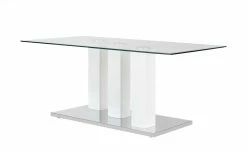 Der Couchtisch Malden hat ein modernes Design und ist stabil gearbeitet. Die Tischplatte besteht aus Klarglas. Es ist strapazierfähig und ist leicht zu reinigen. Für einen soliden Stand sorgt das Gestell, das aus drei Säulen besteht. Alle drei sind hochwertig lackiert und haben ein schönes Hochglanzfinish. Die Bodenplatte setzt sich in Silberoptik ab.