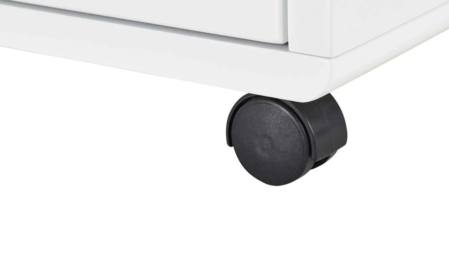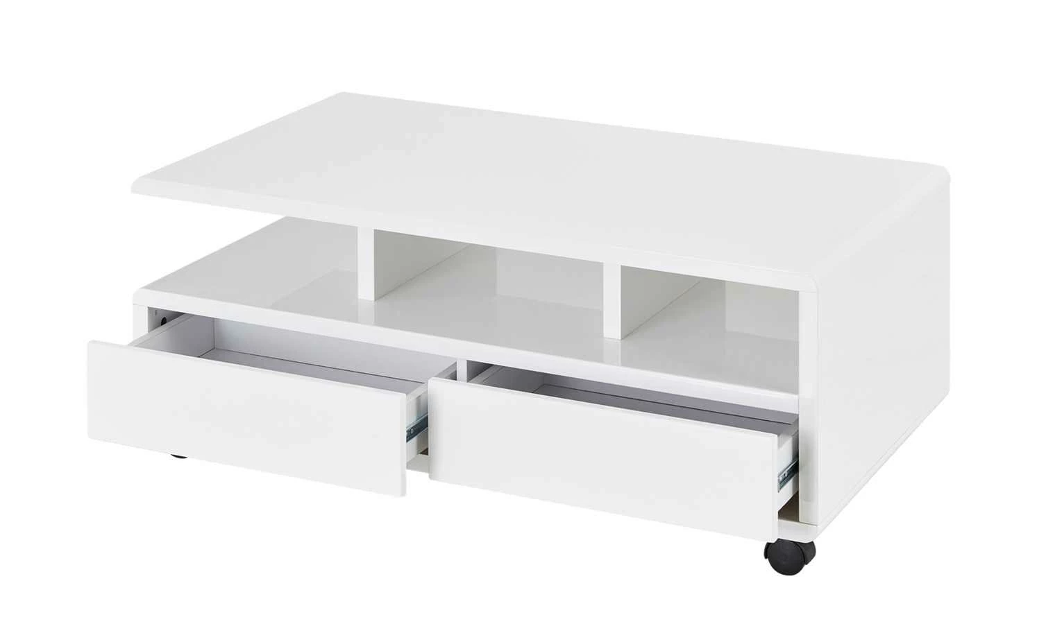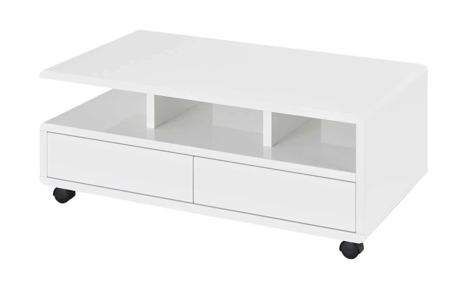 Stauraum, Tisch und flexibel beweglich – das ist der Couchtisch Maui. Unterhalb der rechteckigen Tischplatte gibt es drei offene Fächer. Weiterer Stauraum befindet sich in den beiden großen Schubladen. Sie öffnen durch die Push-to-Open-Funktion. Statt fester Füße ist der Tisch mit vier Rollen ausgestattet. Sie ermöglichen es Ihnen, den Tisch leicht zu bewegen. Das moderne Design und der lackierte Weißton machen Maui auch optisch zum Highlight.