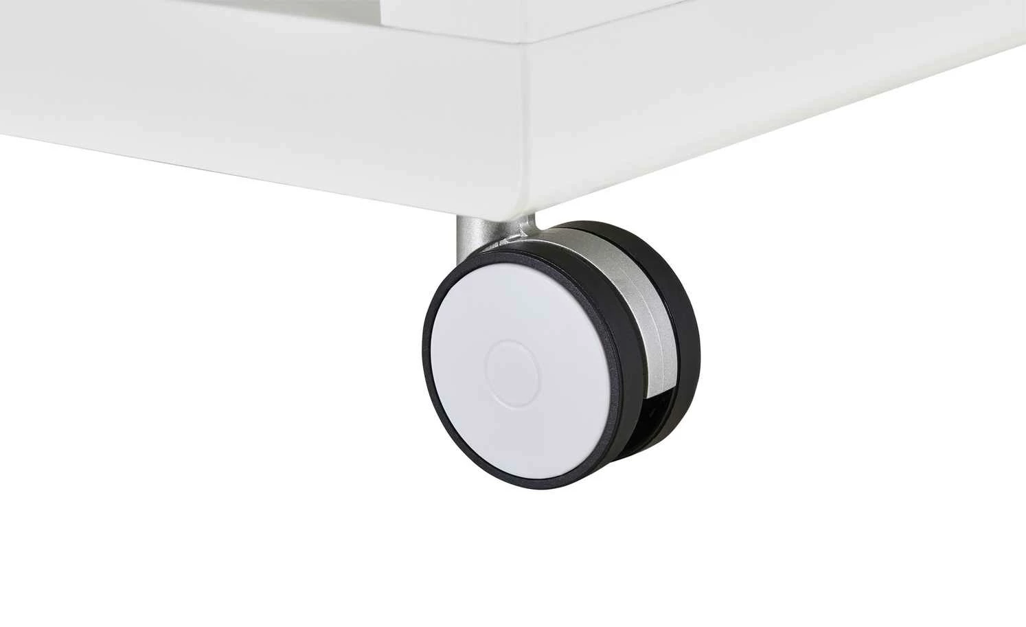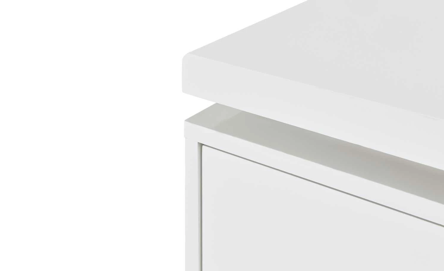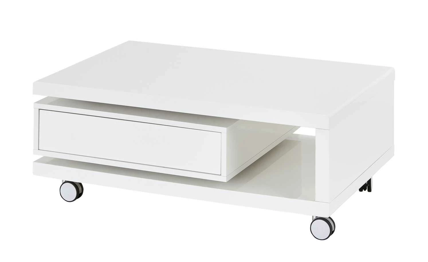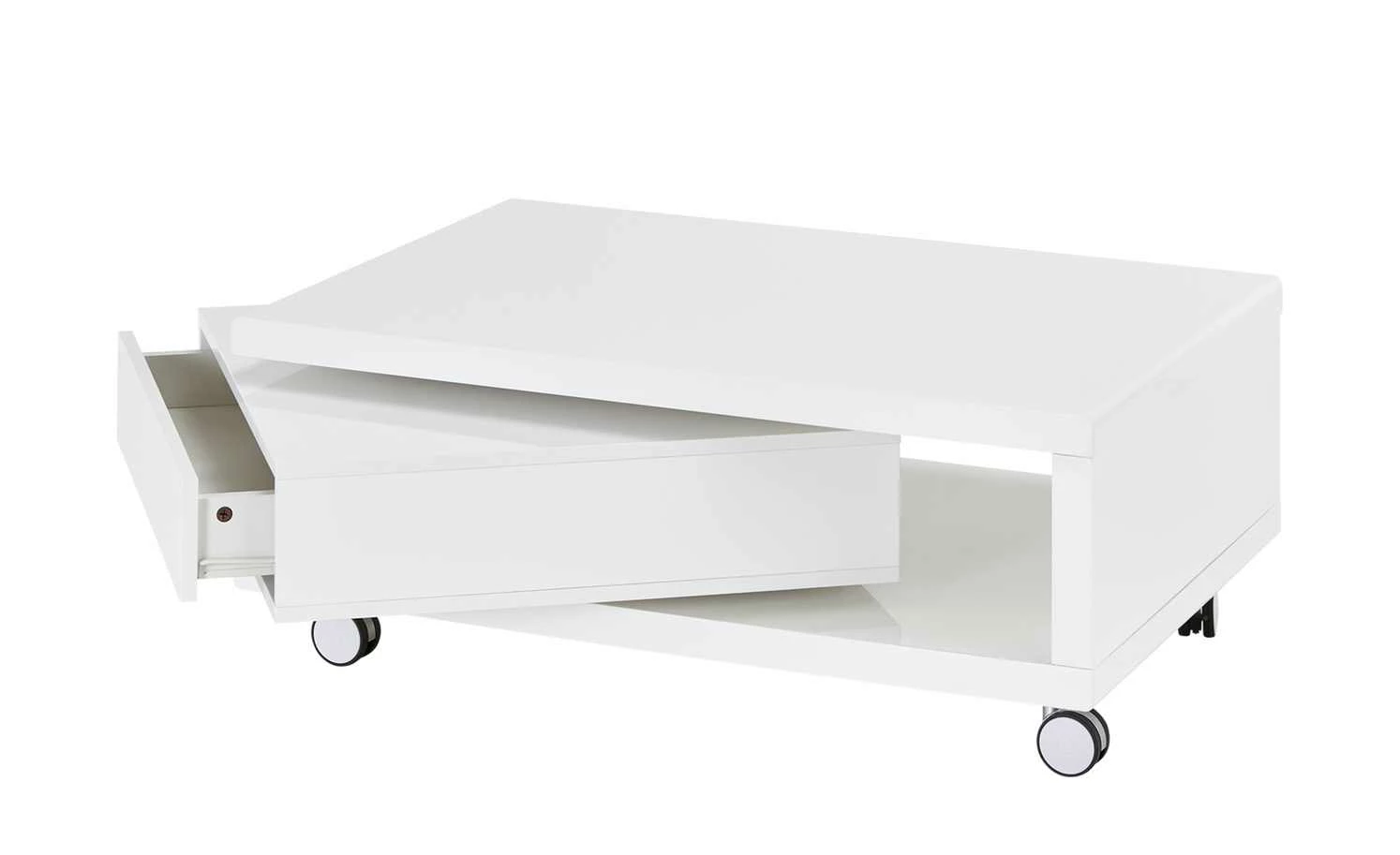 Cooles Design in Weiß und seine funktionale Ausstattung machen den Couchtisch Menorca zum Highlight. Der gesamte Tisch ist lackiert und hat ein modernes hochglänzendes Finish. Unterhalb der rechteckigen Tischplatte befindet sich ein Schubkastenelement, das sich drehen lässt. So erhalten Sie eine zusätzliche Ablagefläche. Der Schubkasten selbst ist mit einer Push-to-Open-Funktion ausgestattet und öffnet durch einen leichten Druck auf die Front. Neben dem Element befindet sich ein offenes Fach, das Sie vielseitig befüllen können. Menorca ist mit vier Rollen ausgestattet, damit Sie ihn leicht bewegen können.