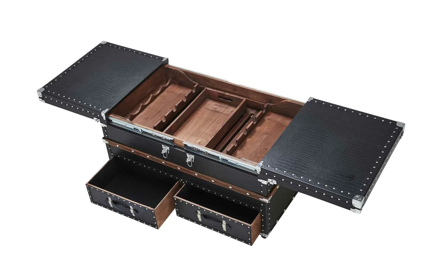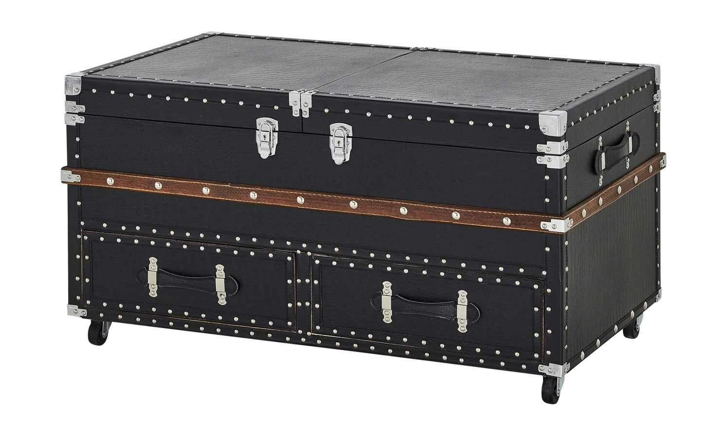 Truhe oder Couchtisch? Teramo ist beides. Der bewegliche Couchtisch im Truhendesign sieht nicht nur klasse aus, sondern bietet auch praktischen Stauraum. Teramo ist mit schwarzem Kunstleder in Kroko-Optik bezogen. Akzente aus dunkler Kiefer und helle Metallnieten verleihen ihm das gewisse Etwas. Ziehen Sie die Tischplatte auseinander: Hier finden Sie ein herausnehmbares Tablett und ein integriertes Flaschenregal mit Platz für zehn edle Tropfen. Im unteren Bereich des Couchtisches gibt es zwei Schubkästen je Seite. Verstauen Sie hier zum Beispiel Magazine und Fernsehzubehör. Dank der leichtgängigen Rollen können Sie den Truhentisch problemlos bewegen.
