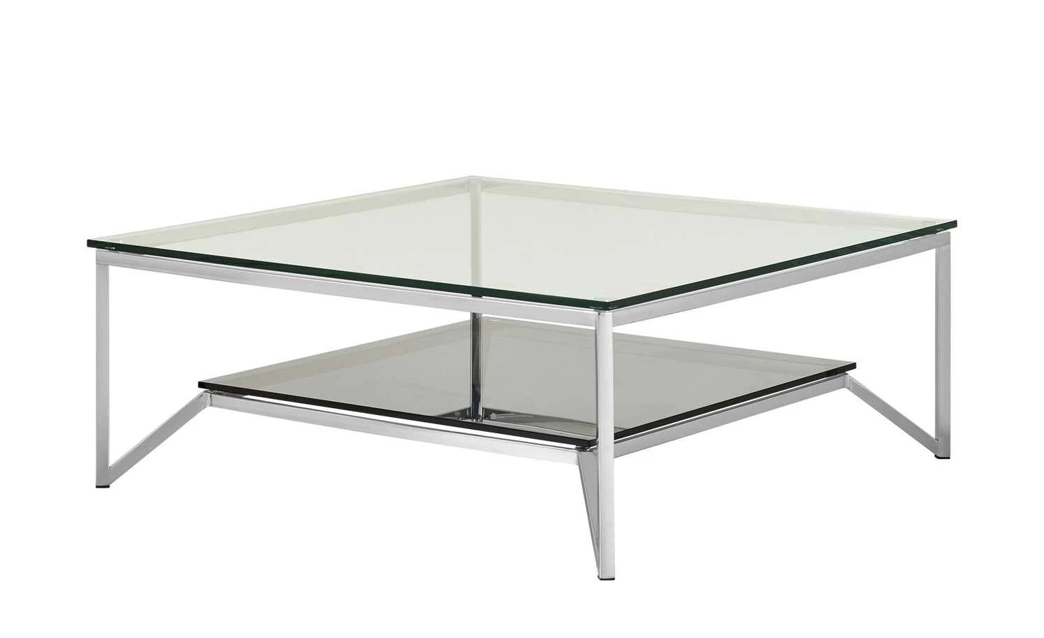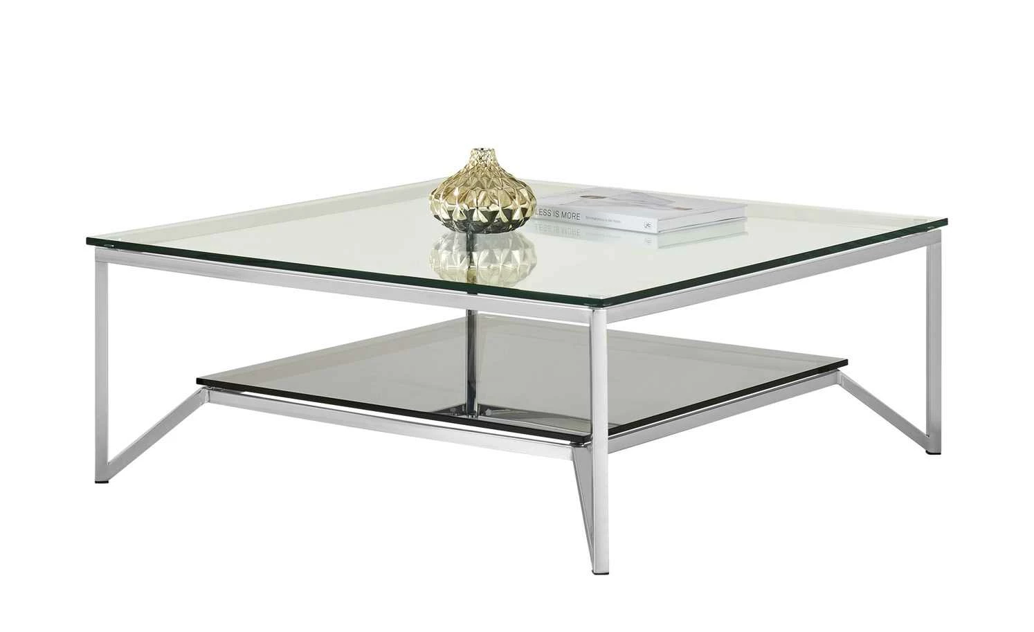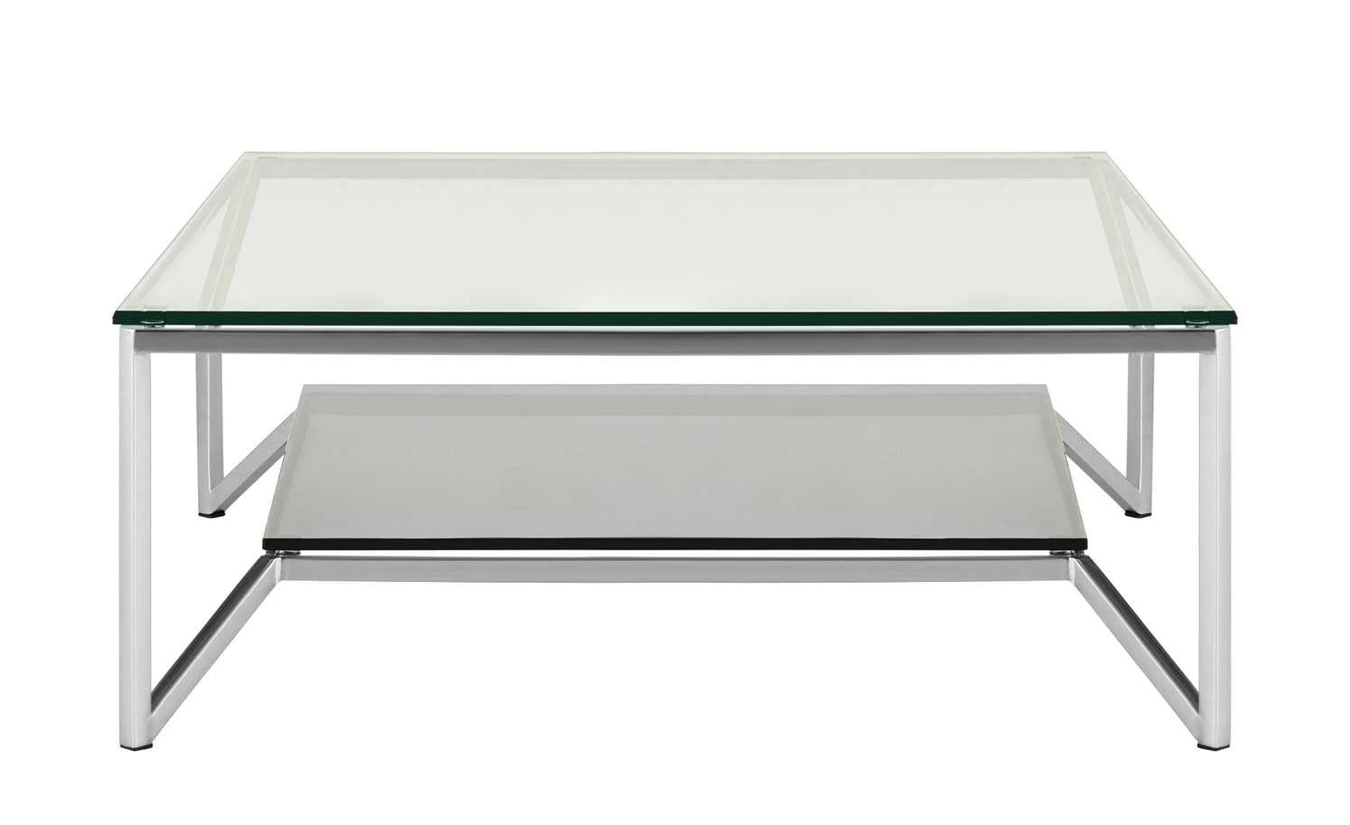 Der auffällig designte Couchtisch Toralf besteht aus einem modernen Materialmix. Die Tischplatte und Ablage sind quadratisch und aus stabilem Glas. Die Tischplatte ist klar, die Ablage hingegen grau, allerdings trotzdem transparent. Das polierte Metallgestell setzt glänzende Akzente. Es fällt durch sein besonderes Design ins Auge.