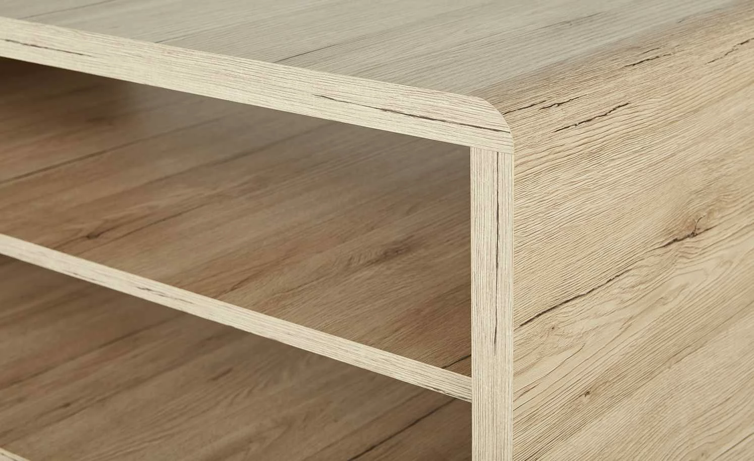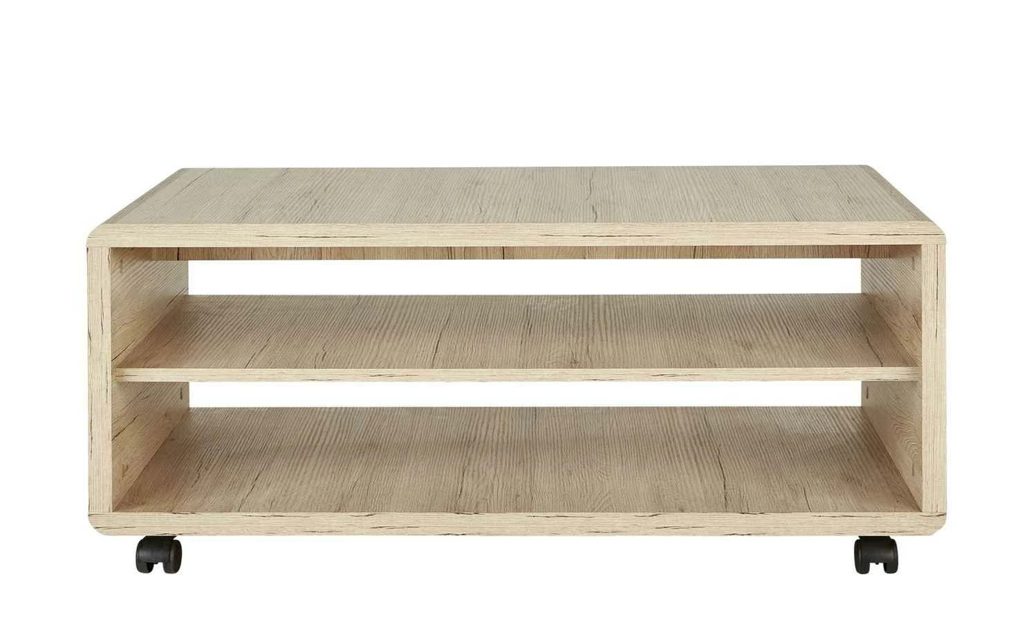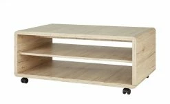 Der Couchtisch Turino ist ein praktisches Highlight. Neben einer großen rechteckigen Tischplatte bietet er zwei geräumige offene Fächer. Anstelle von Füßchen ist Turino mit vier Rollen ausgestattet. Sie machen den Couchtisch richtig mobil. Bewegen Sie ihn einfach dorthin, wo Sie ihn brauchen. Tischplatte, Gestell und Ablagen haben ein Dekor in Eiche San Remo (Nachbildung). Es sorgt für natürlichen Charme, der mit dem modernen Gesamtlook harmoniert.
