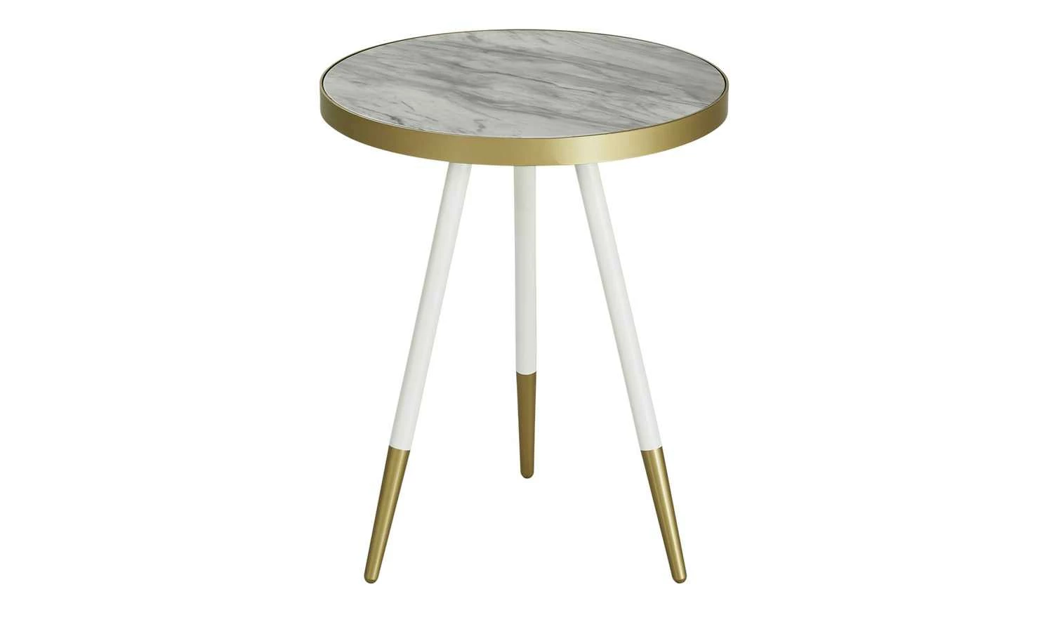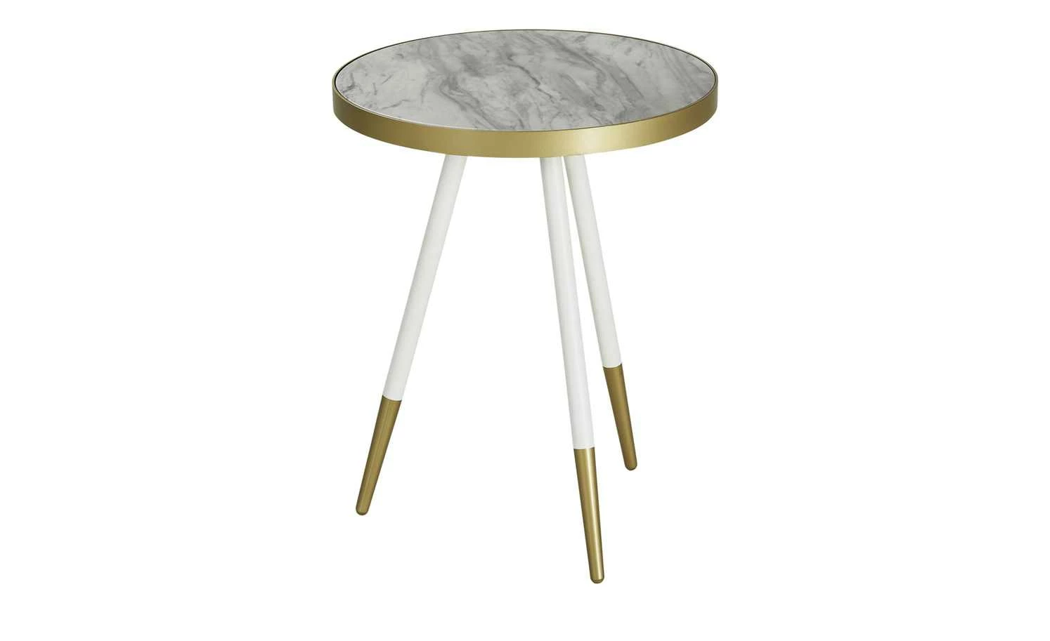 Marmor liegt wieder voll im Trend. Und wie klasse das Material wirkt, beweist auch der Couchtisch Ustica. Er hat eine ausgeprägt marmorierte runde Tischplatte in Marmor Weiß (Nachbildung). Sie wird von einem Rand in Goldoptik abgesetzt. Dieses Finish wiederholt sich an den weißen Tischbeinen. Sie sind am unteren Ende ebenfalls in Goldoptik abgesetzt. Alles zusammen ergibt einen tollen glamourösen Look.