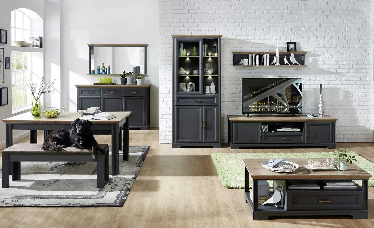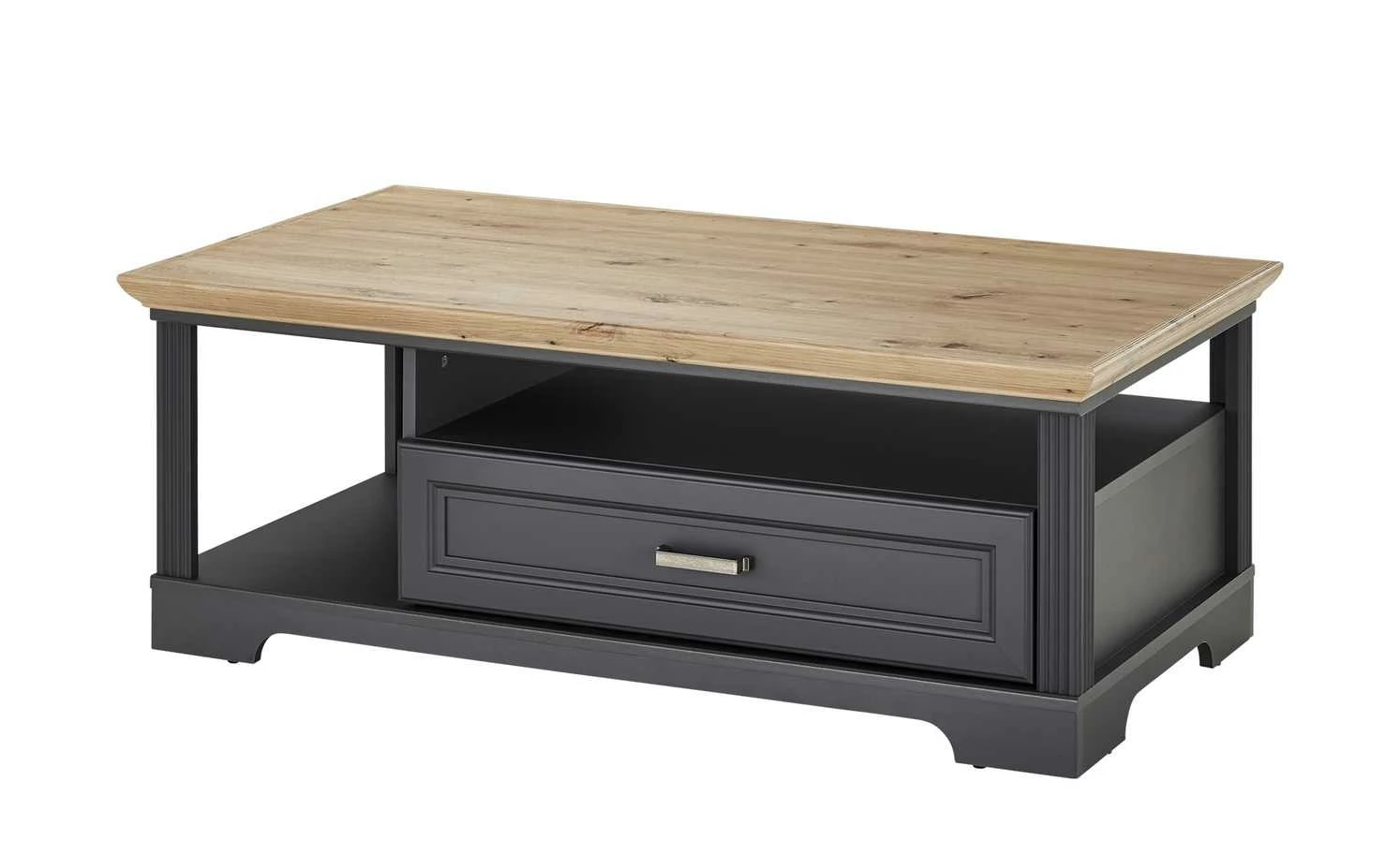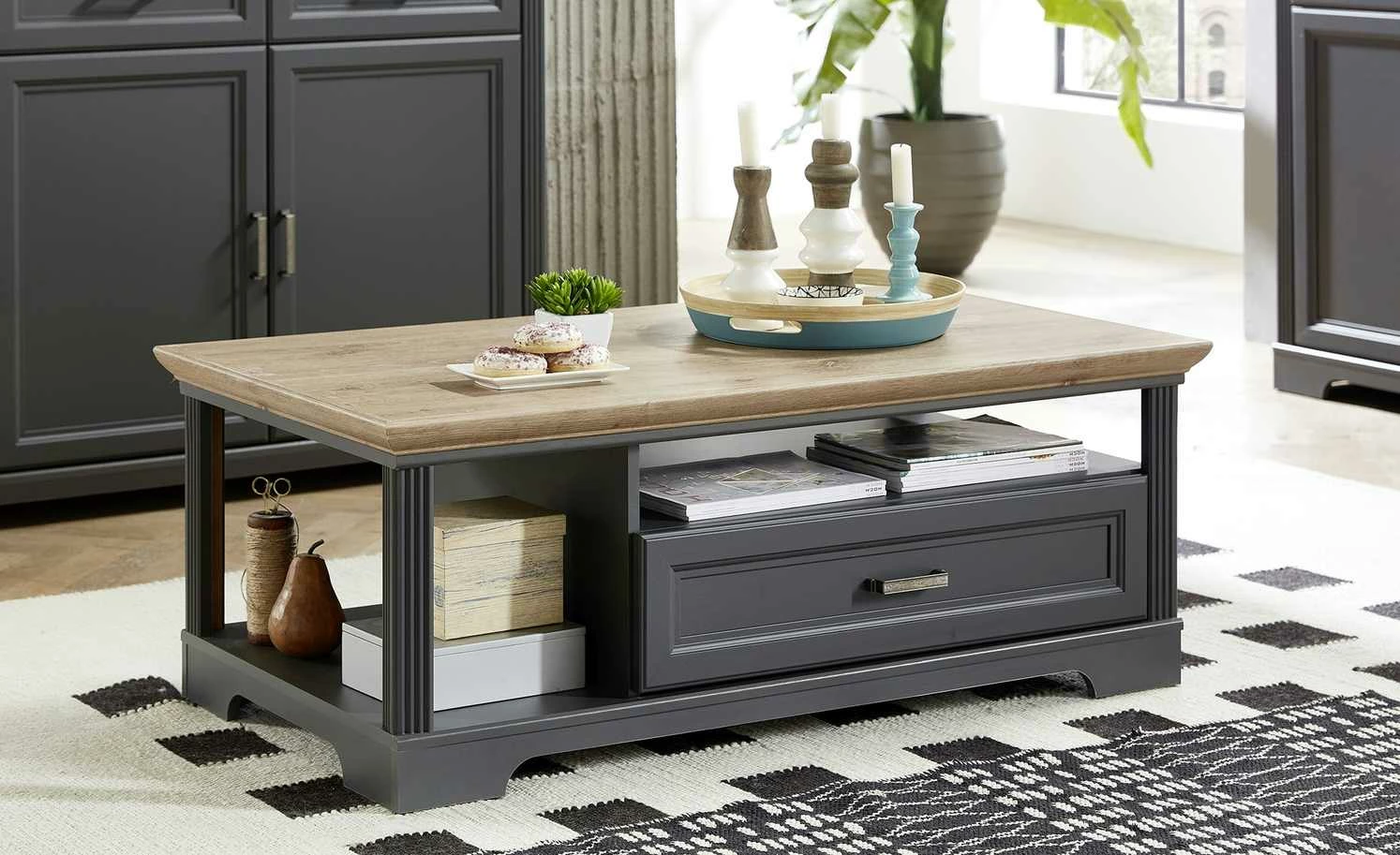 Der Couchtisch Varese zaubert Landhauscharme vor das Sofa. Er passt zu gleichnamigen Serie, kann aber auch mit anderen Möbeln kombiniert werden. Die Tischplatte hat ein rustikales Dekor in Asteiche (Nachbildung) und setzt sich damit vom graphitgrauen Gestell ab. Varese verfügt unterhalb der Tischplatte über zwei Fächer und eine geräumige Schublade. Letztere schließt dank der Soft-Close-Ausstattung leise und ist mit einem Selbsteinzug ausgestattet.