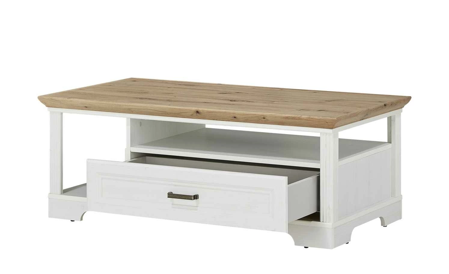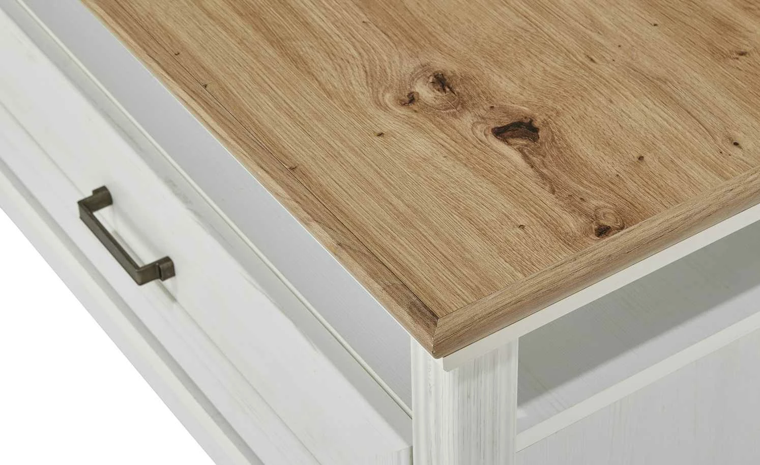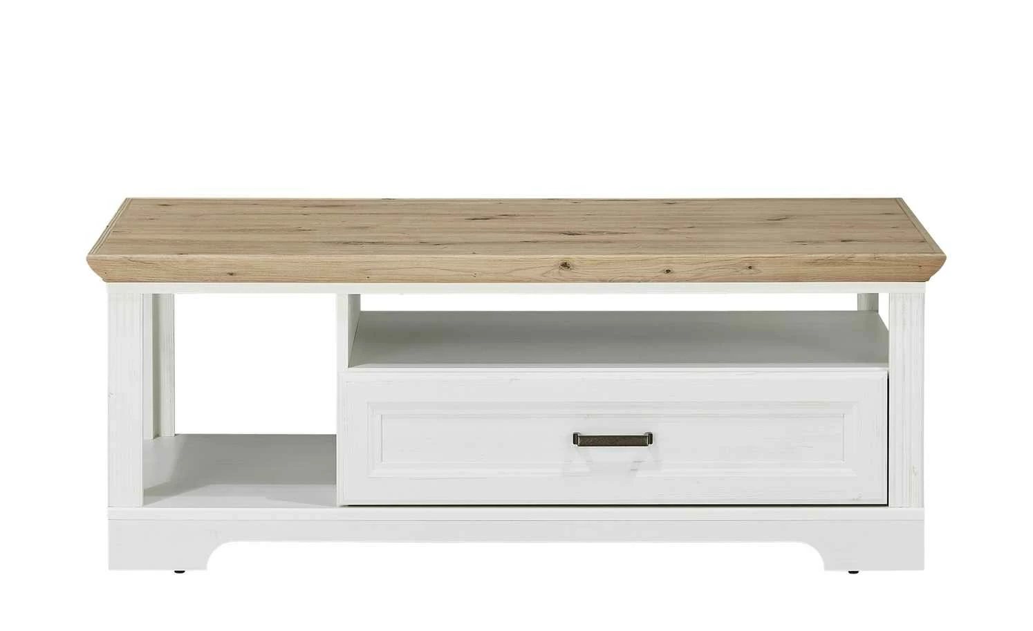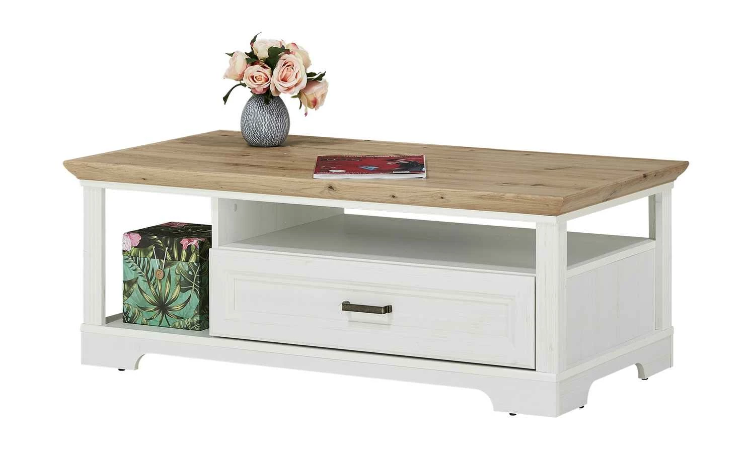 Der Couchtisch Varese zaubert Landhauscharme vor das Sofa. Er passt zu gleichnamigen Serie, kann aber auch mit anderen Möbeln kombiniert werden. Die Tischplatte hat ein rustikales Dekor in Asteiche (Nachbildung) und setzt sich damit vom Gestell in Pinie hell (Nachbildung)ab. Varese verfügt unterhalb der Tischplatte über zwei Fächer und eine geräumige Schublade. Letztere schließt dank der Soft-Close-Ausstattung leise und ist mit einem Selbsteinzug ausgestattet.