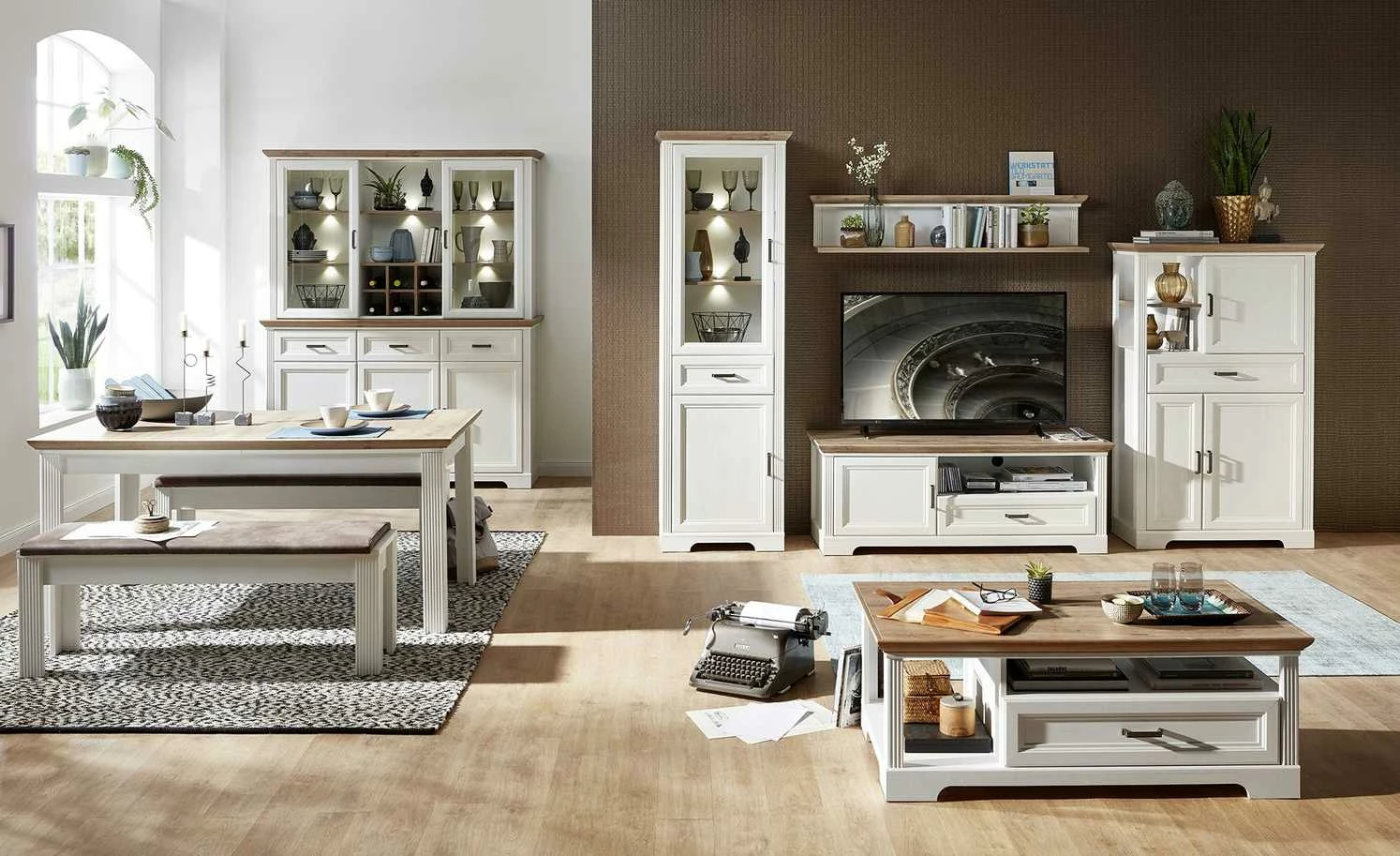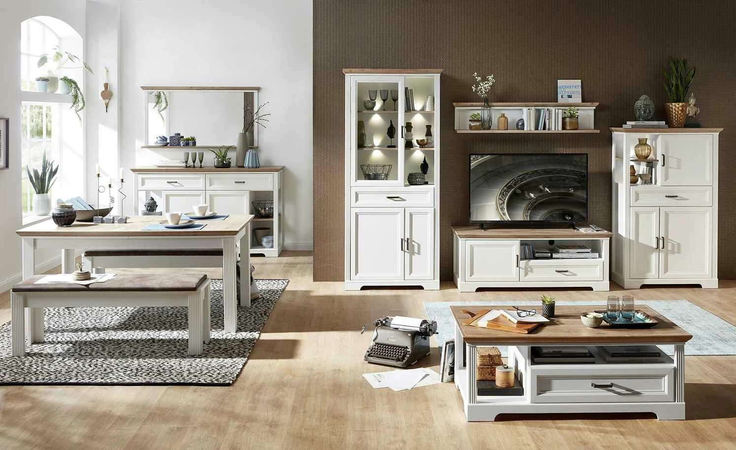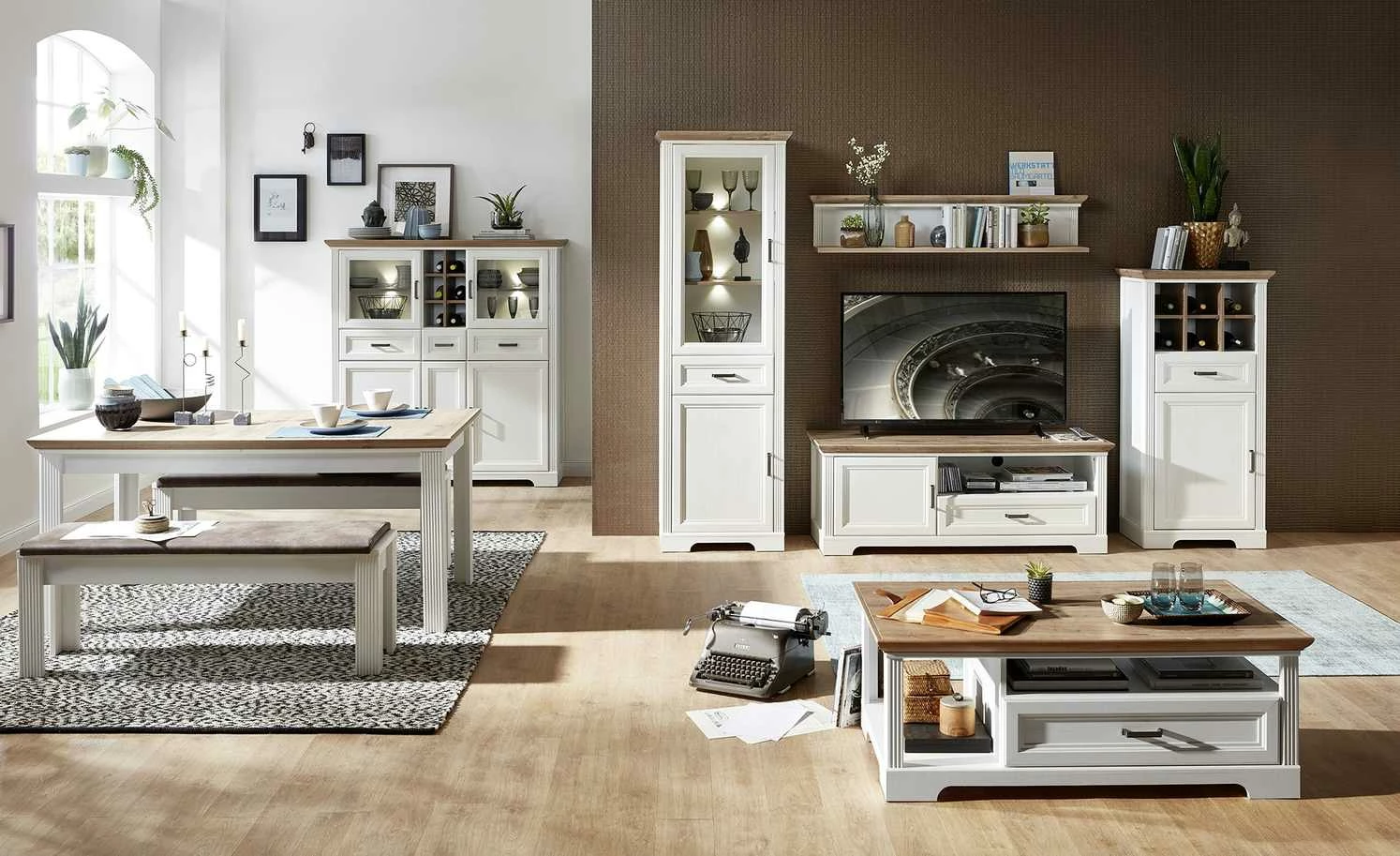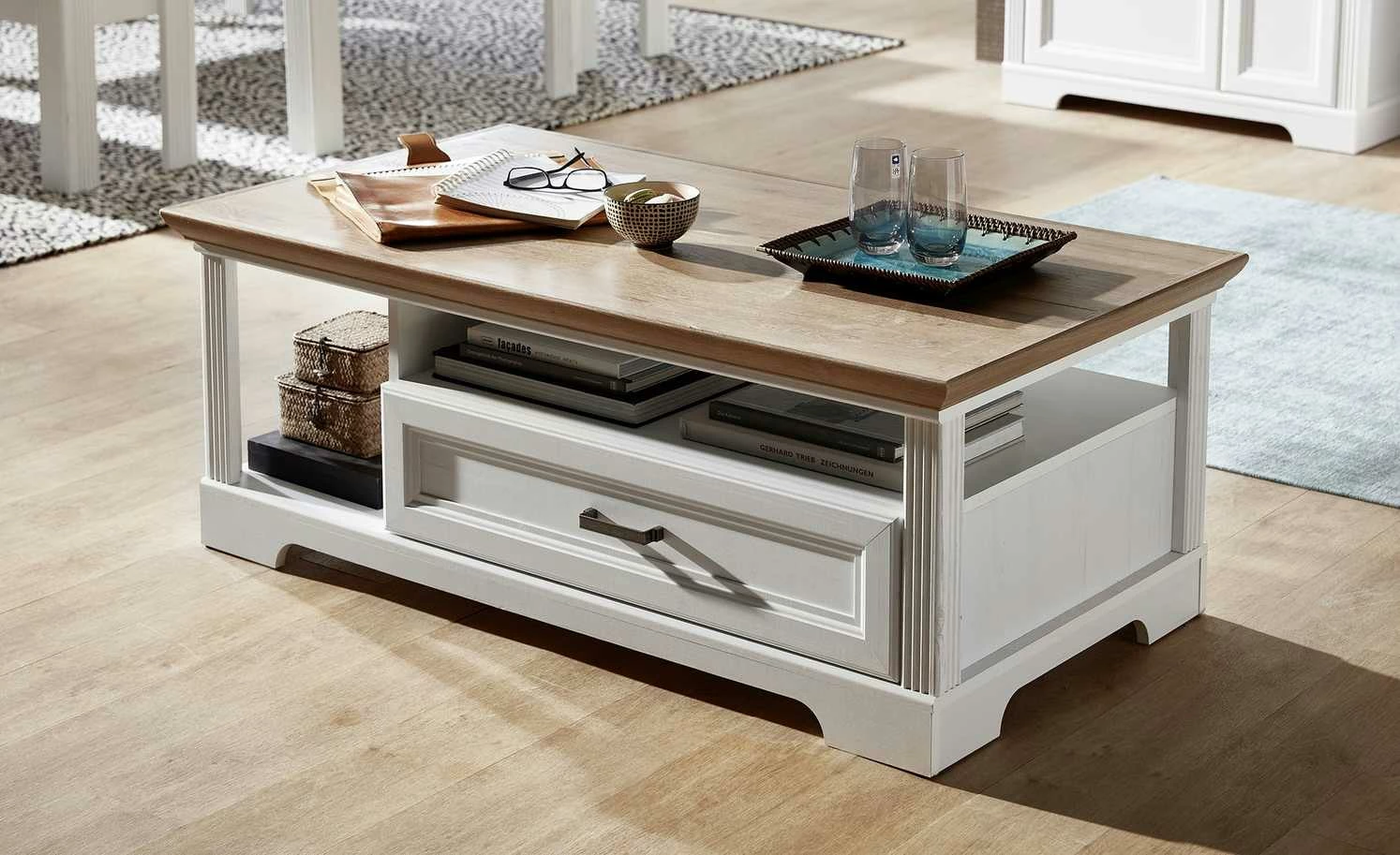 Der Couchtisch Varese zaubert Landhauscharme vor das Sofa. Er passt zu gleichnamigen Serie, kann aber auch mit anderen Möbeln kombiniert werden. Die Tischplatte hat ein rustikales Dekor in Asteiche (Nachbildung) und setzt sich damit vom Gestell in Pinie hell (Nachbildung)ab. Varese verfügt unterhalb der Tischplatte über zwei Fächer und eine geräumige Schublade. Letztere schließt dank der Soft-Close-Ausstattung leise und ist mit einem Selbsteinzug ausgestattet.
