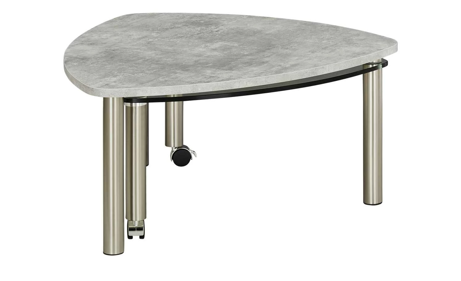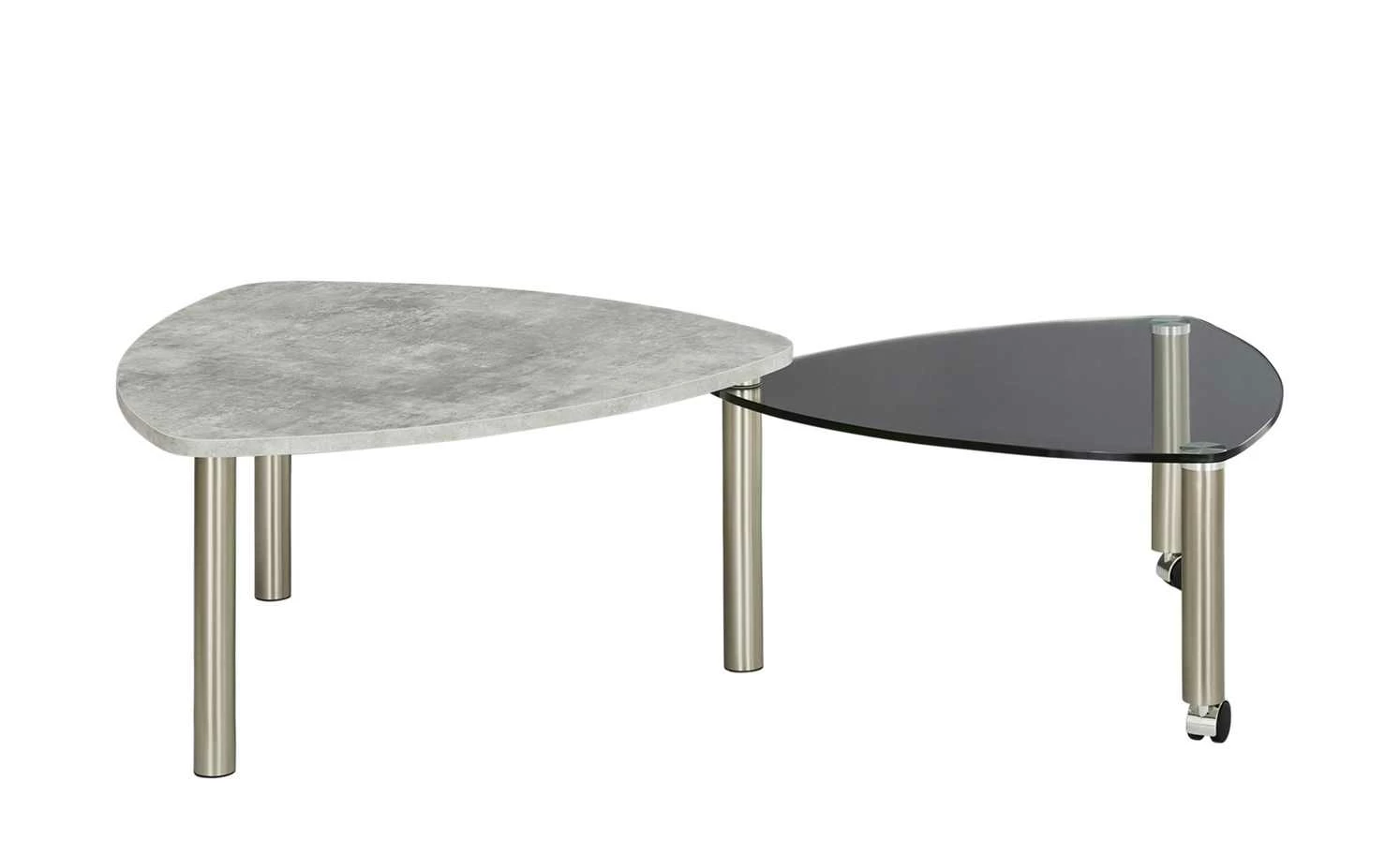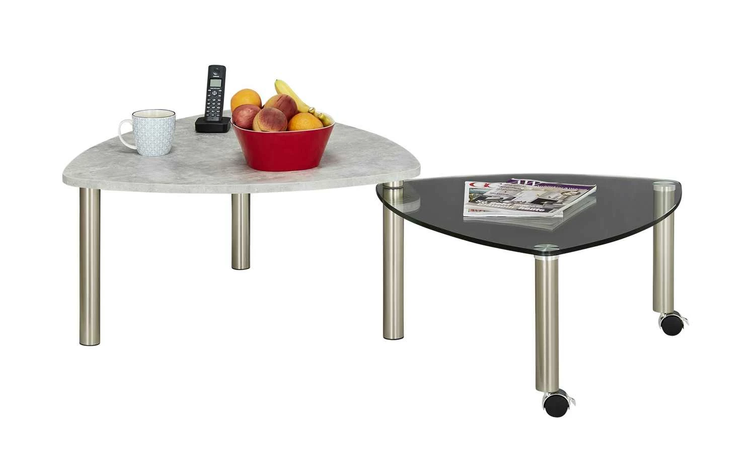 Der Couchtisch Vöhringen besteht aus zwei Teilen, die miteinander an einem Bein verbunden sind. Der kleinere Tisch ist mit zwei Rollen ausgestattet. So können Sie ihn leicht unter den größeren Tisch schieben und auch wieder hervorrollen. Die Tischplatte hat die Form eines abgerundeten Dreiecks und fällt zudem durch ihre Betonoptik auf. Für die Ablage ist schwarzes ESG-Sicherheitsglas verwendet worden.