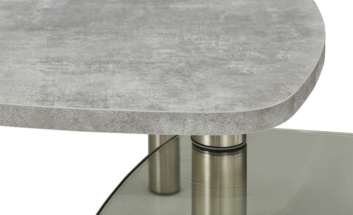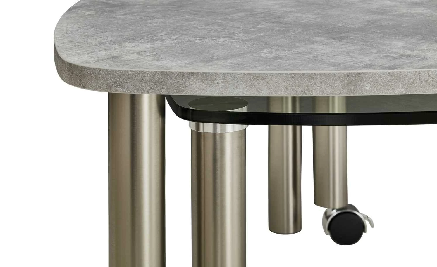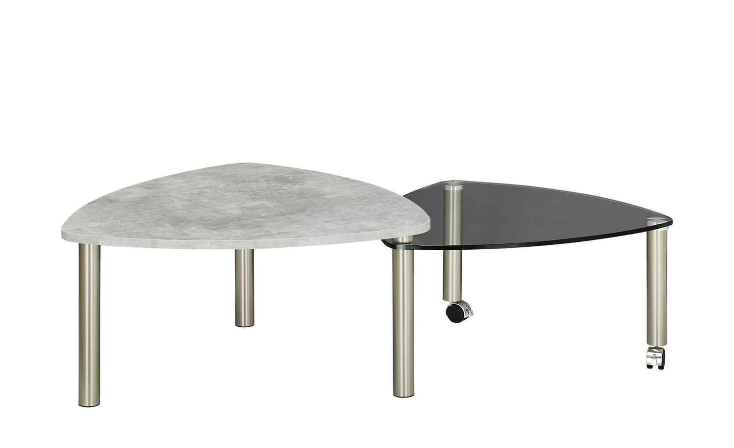 Der Couchtisch Vöhringen besteht aus zwei Teilen, die miteinander an einem Bein verbunden sind. Der kleinere Tisch ist mit zwei Rollen ausgestattet. So können Sie ihn leicht unter den größeren Tisch schieben und auch wieder hervorrollen. Die Tischplatte hat die Form eines abgerundeten Dreiecks und fällt zudem durch ihre Betonoptik auf. Für die Ablage ist schwarzes ESG-Sicherheitsglas verwendet worden.
