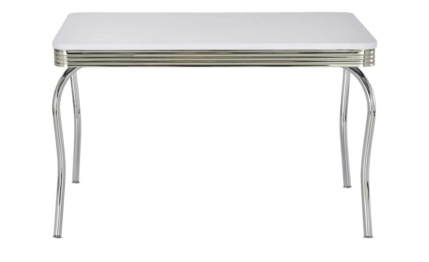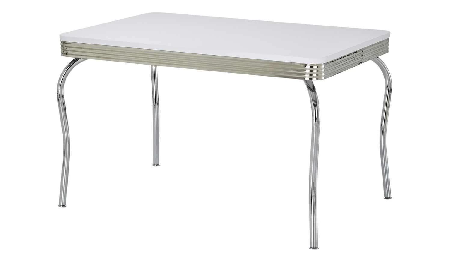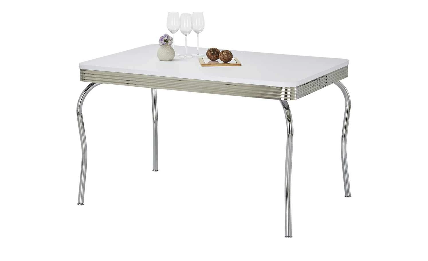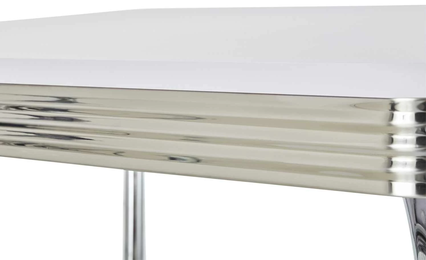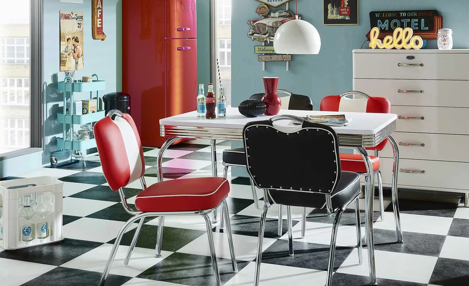 Der Esstisch American Diner lässt die Herzen von 50er-Jahre-Fans höher schlagen. Wie der Name schon verrät ist er im Stil amerikanischer Diner designt. Die Tischplatte ist in einem schlichten Weiß gehalten, wird aber an den Seite von verchromtem Metall in Rillenoptik abgesetzt. Auch die geschwungenen Beine sind verchromt und fallen durch ihren Glanz auf. Der Tisch kann für sechs Personen eingedeckt werden.