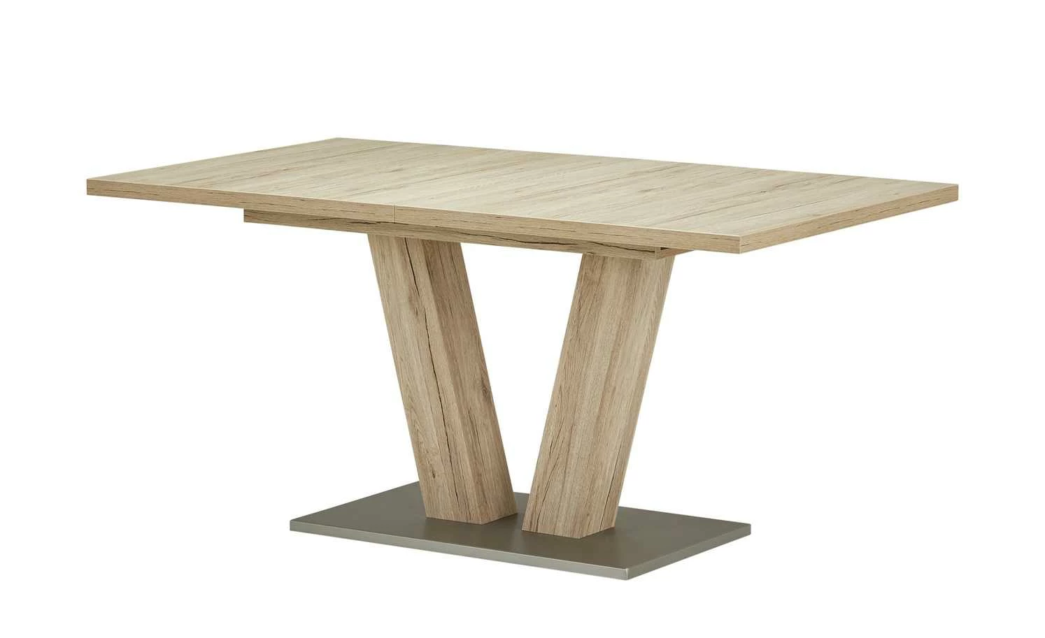 Und plötzlich kommen mehr Gäste als gedacht. Mit dem Esstisch 1063 finden Sie Platz für alle. Der Tisch kann bei Bedarf einfach ausgezogen und mit zwei Platten à 40 cm erweitert werden. So können bis zu zehn Personen bequem an ihm sitzen. Tischplatte und Gestell sind melaminbeschichtet. Das macht die Oberflächen besonders robust und pflegeleicht. Die Holzoptik (Nachbildung) sieht natürlich aus. Ein Eyecatcher ist das Gestell in V-Form.