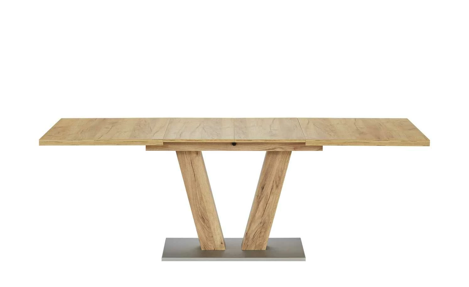 Und plötzlich kommen mehr Gäste als gedacht. Mit dem Esstisch 1063 finden Sie Platz für alle. Der Tisch kann bei Bedarf einfach ausgezogen und mit zwei Platten à 40 cm erweitert werden. So können bis zu zehn Personen bequem an ihm sitzen. Tischplatte und Gestell sind melaminbeschichtet. Das macht die Oberflächen besonders robust und pflegeleicht. Die Holzoptik (Nachbildung) sieht natürlich aus. Ein Eyecatcher ist das Gestell in V-Form.