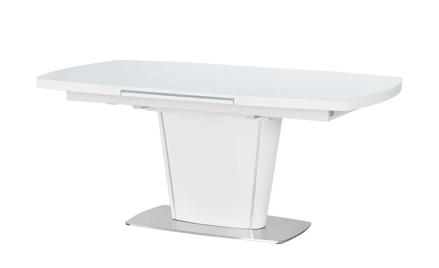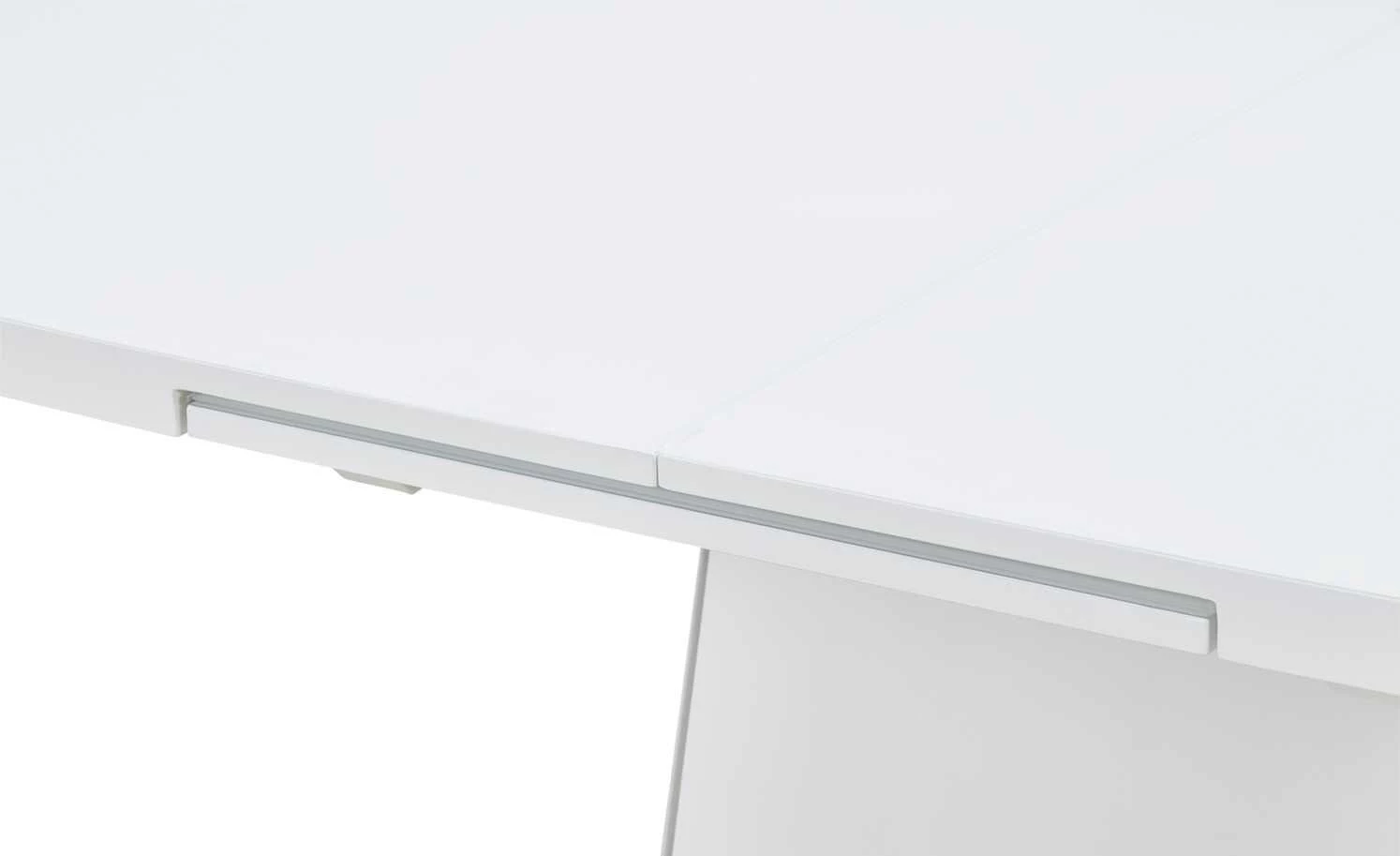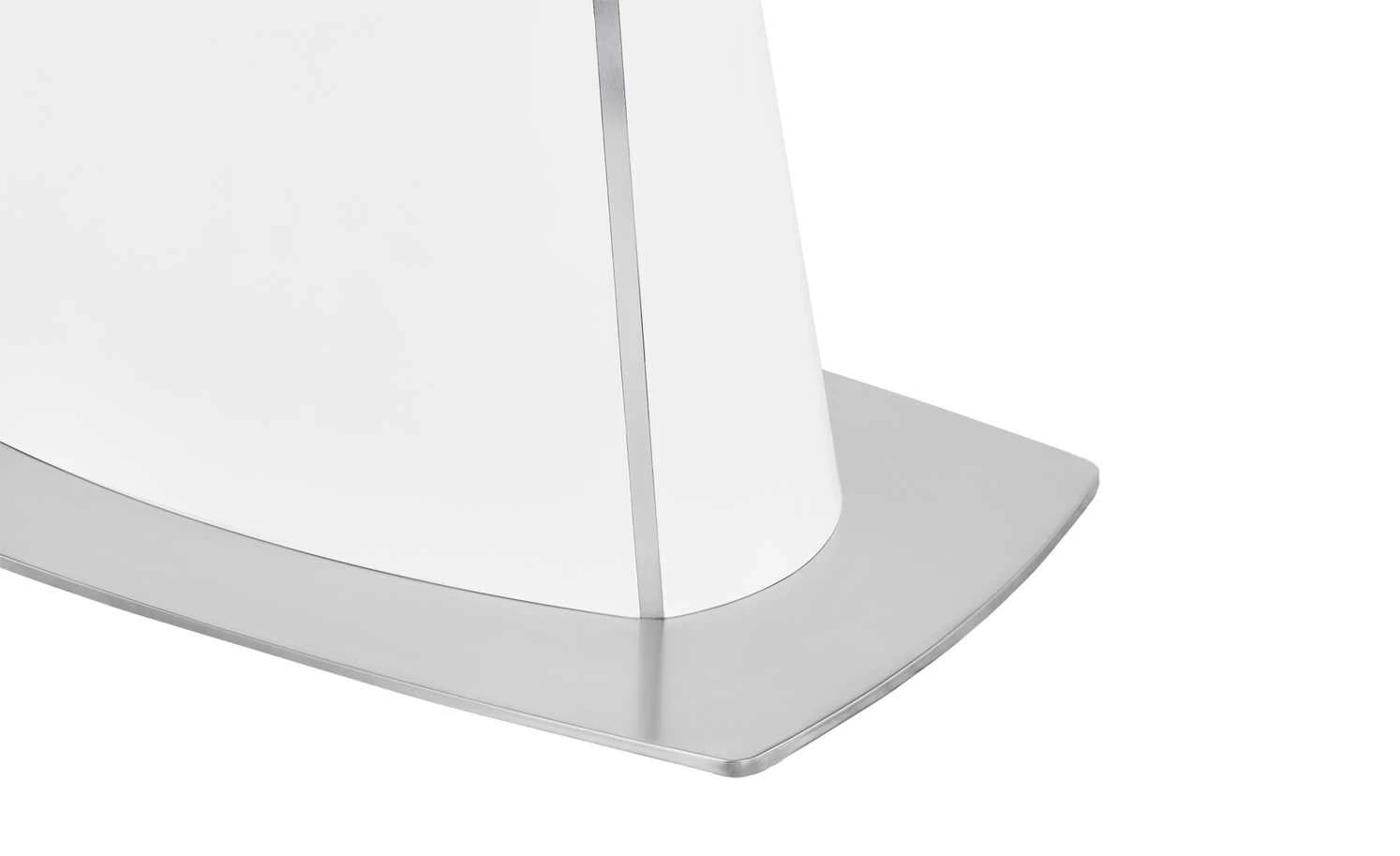 Damians weiße Tischplatte besitzt eine Glasplatte aus Sicherheitsglas, die bei Klecker-Unfällen leicht abgewischt werden kann. Abgerundete Ecken und Akzente in Edelstahl-Optik verleihen dem Tisch einen edlen Look. Übrigens: Beim Aufbau entscheiden Sie selbst, ob der Säulentisch die A- oder die V-Form haben soll. Beide Varianten können problemlos auf der Metall-Bodenplatte montiert werden.
