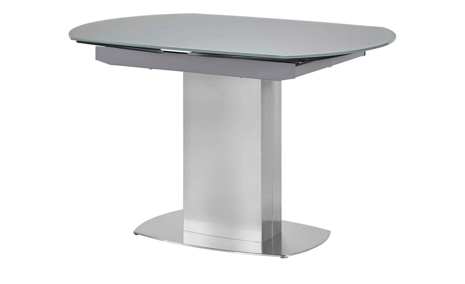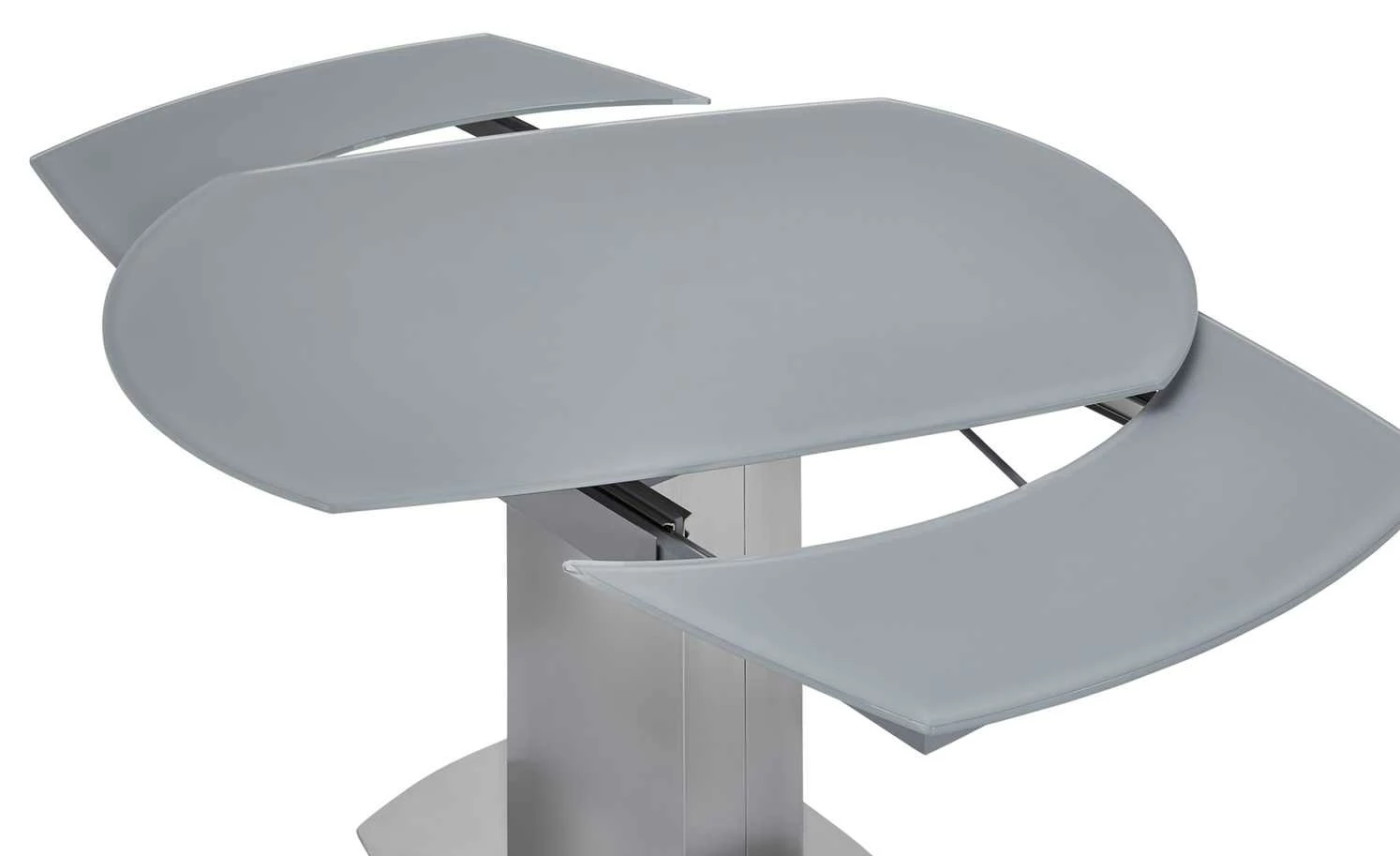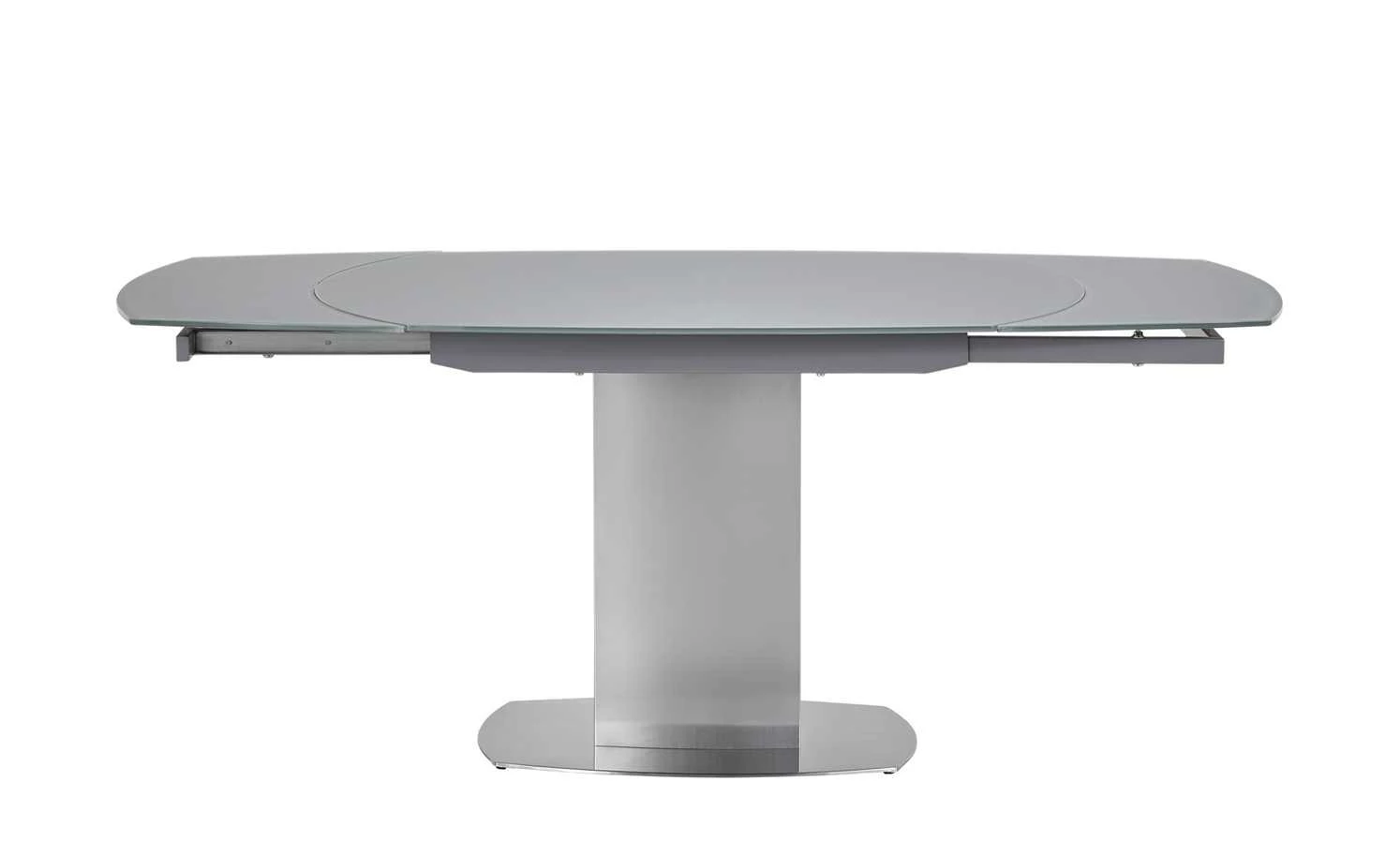 Grau und doch alles andere als unscheinbar: Der Esstisch Darian. Die ovale grau gestrahlte Glastischplatte wird von einem breiten Metallfuß in Edelstahl-Optik getragen. Er steht auf einer Bodenplatte und sorgt für die notwendige Stabilität. Darian kann durch die Auszugsfunktion ganz leicht erweitert werden. Der Verstellmechanismus ist leichtgängig und passt die Höhe gleich mit an. Je nach Bedarf können Sie so an Darian vier bis acht Personen platzieren. Der Esstisch Darian ist durch seine einfache Auszugsfunktion ideal für Menschen, die häufiger spontane Gäste haben.