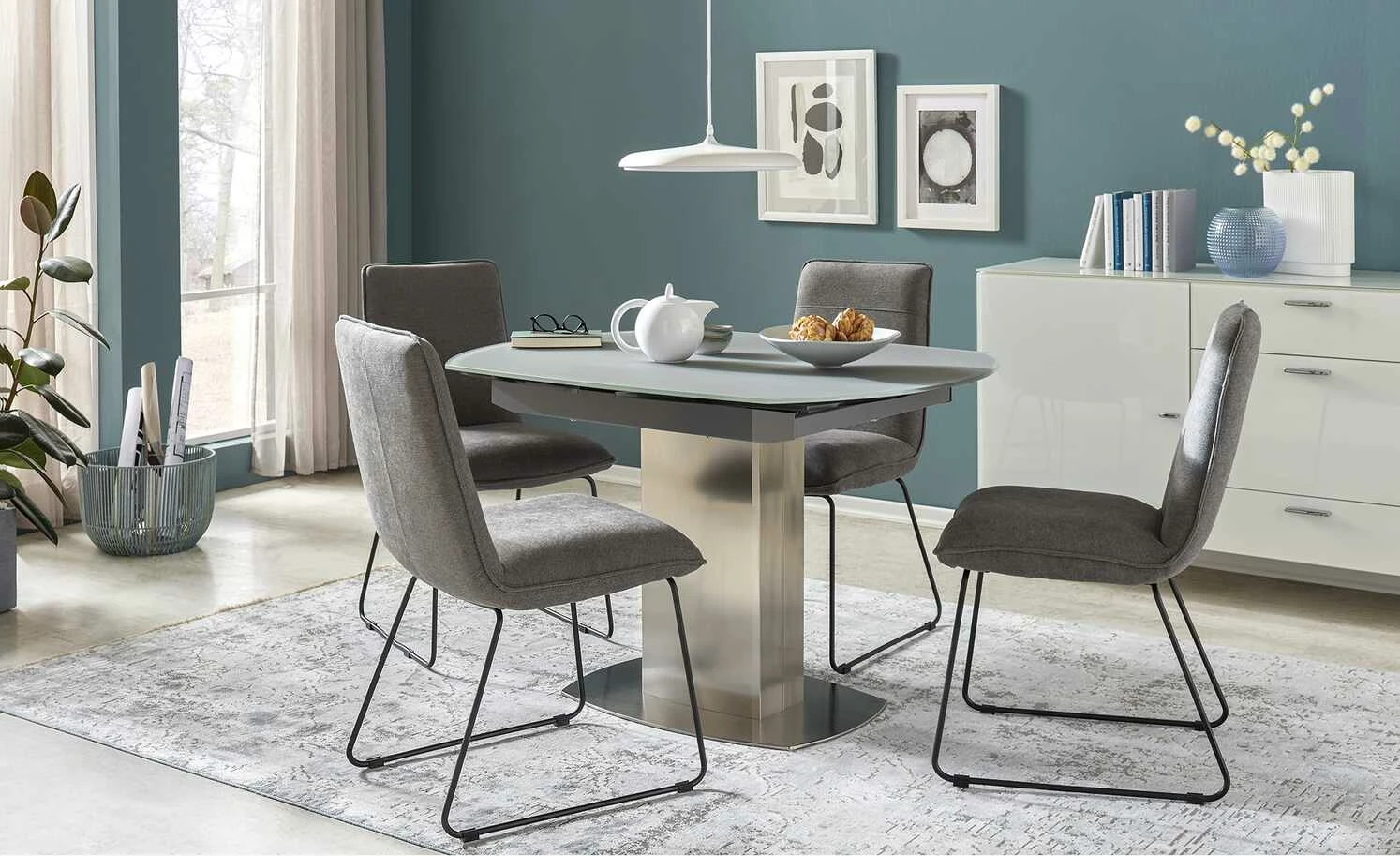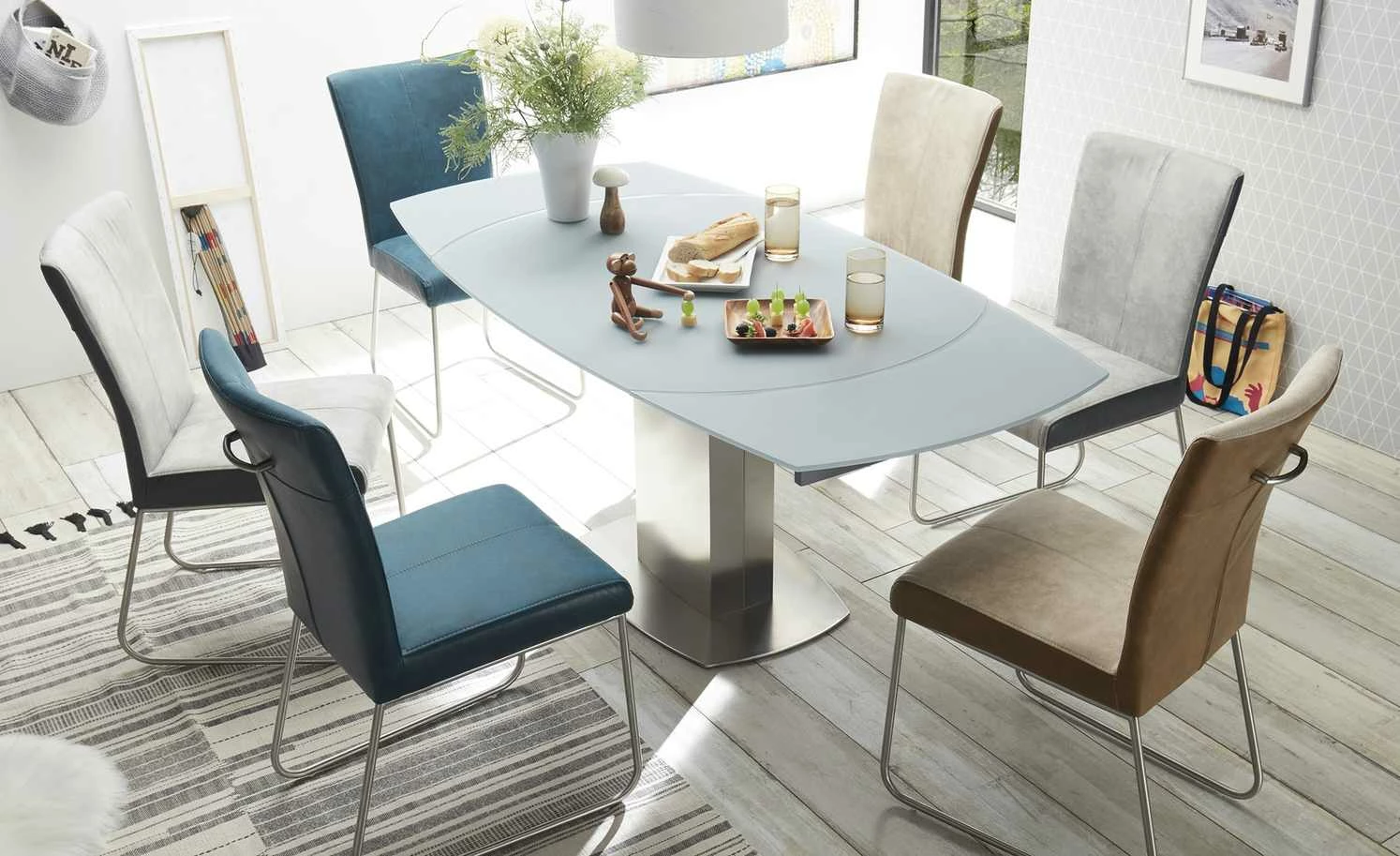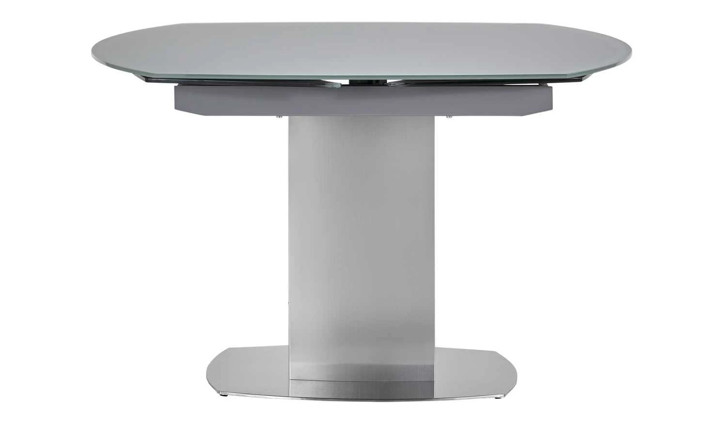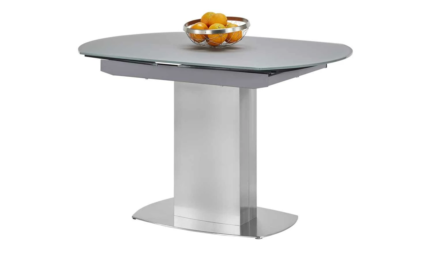Grau und doch alles andere als unscheinbar: Der Esstisch Darian. Die ovale grau gestrahlte Glastischplatte wird von einem breiten Metallfuß in Edelstahl-Optik getragen. Er steht auf einer Bodenplatte und sorgt für die notwendige Stabilität. Darian kann durch die Auszugsfunktion ganz leicht erweitert werden. Der Verstellmechanismus ist leichtgängig und passt die Höhe gleich mit an. Je nach Bedarf können Sie so an Darian vier bis acht Personen platzieren. Der Esstisch Darian ist durch seine einfache Auszugsfunktion ideal für Menschen, die häufiger spontane Gäste haben.