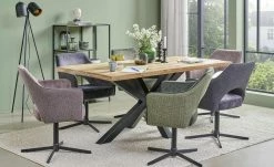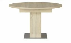 Mit dem Esstisch Harvey haben Sie einen größenverstellbaren Tisch, an dem je nach Bedarf bis zu 8 Personen komfortabel für gemeinsame Mahlzeiten Platz finden. Um den runden Esstisch in eine Tafel zu verwandeln, müssen Sie die geteilte Tischplatte nur an beiden Längsseiten auseinander ziehen. Schon kommt eine zusätzliche Platte zum Vorschein, die Sie mit wenigen Handgriffen in der Mitte einsetzen können. Die moderne Optik mit dem einzelnen, weißlackierten Standbein und dem Fuß aus Chrom steht in angenehmem Kontrast zur Tischplatte in Eiche sägerau (Nachbildung), die dem Esstisch einen rustikalen Akzent verleiht.