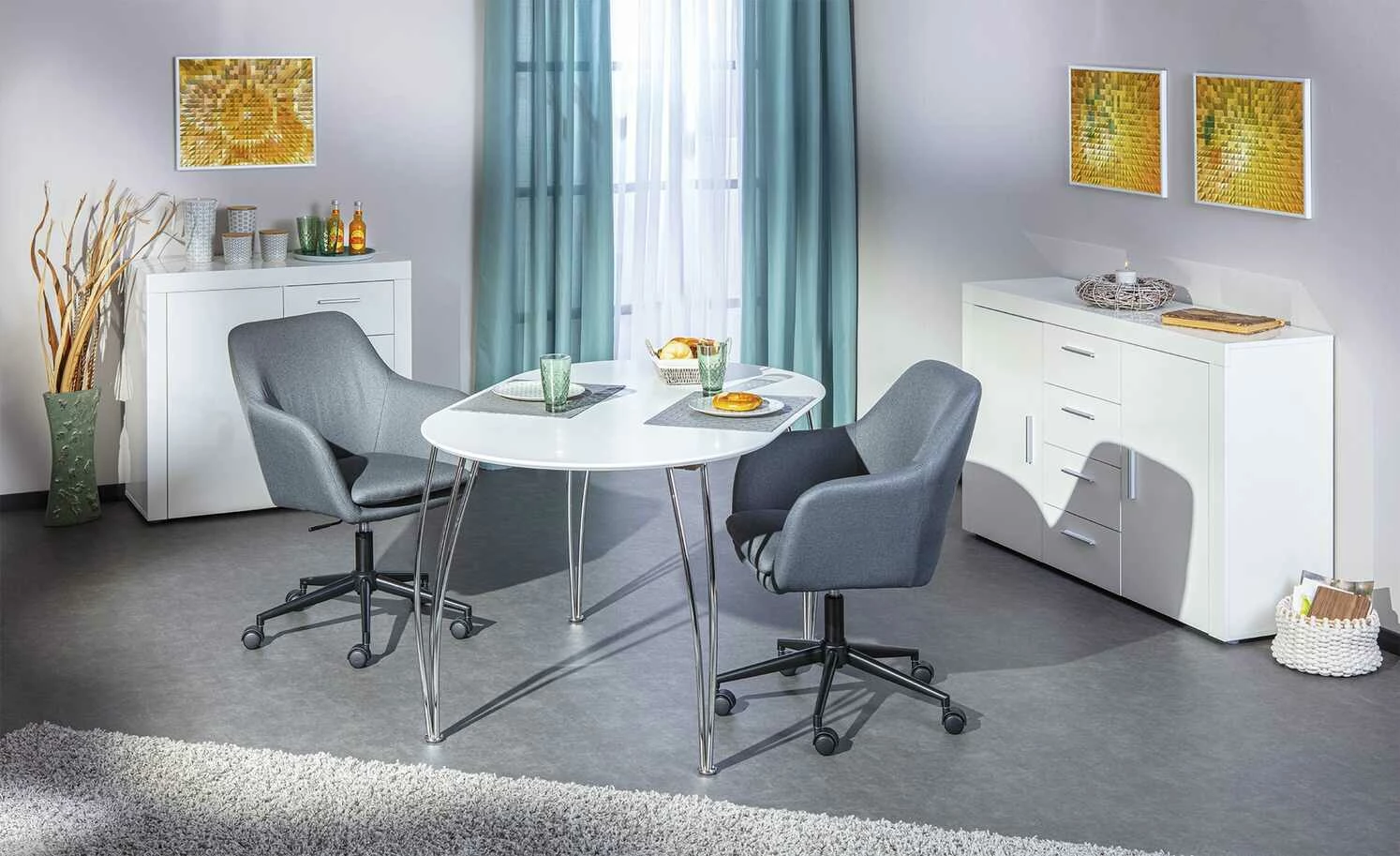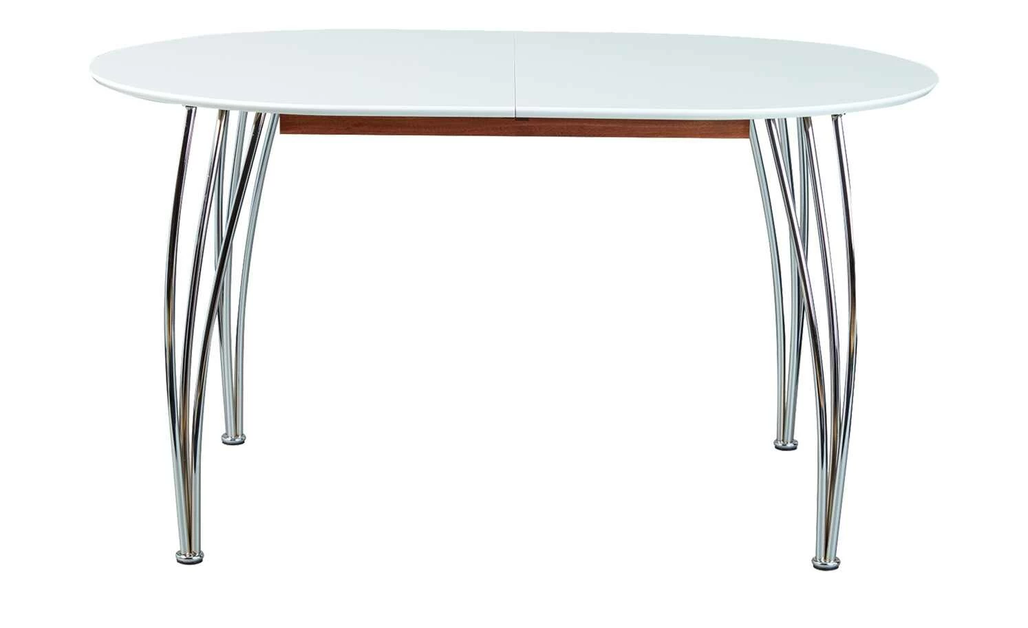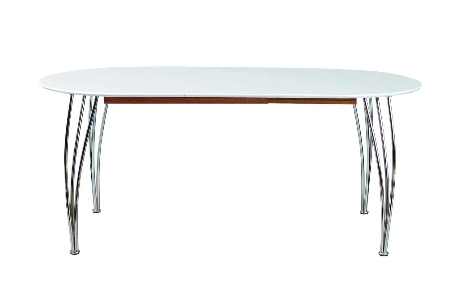 Idris ist ein moderner Tisch, der praktischen Nutzen mit Design vereint. Die vier verchromten Metallfüße splitten sich zur Tischplatte hin in drei elegante Einzelstränge und lassen den Tisch damit luftig leicht erscheinen. Die ovale Tischplatte ist in zeitlosem, kombinationsfreudigem Weiß gehalten und harmoniert dadurch wunderbar mit den Füßen. An dem Esstisch finden bis zu sechs Personen Platz. Bei Bedarf kann die Tischplatte mit nur wenigen Handgriffen ausgezogen werden. Dann finden zwei weitere Gäste Platz.