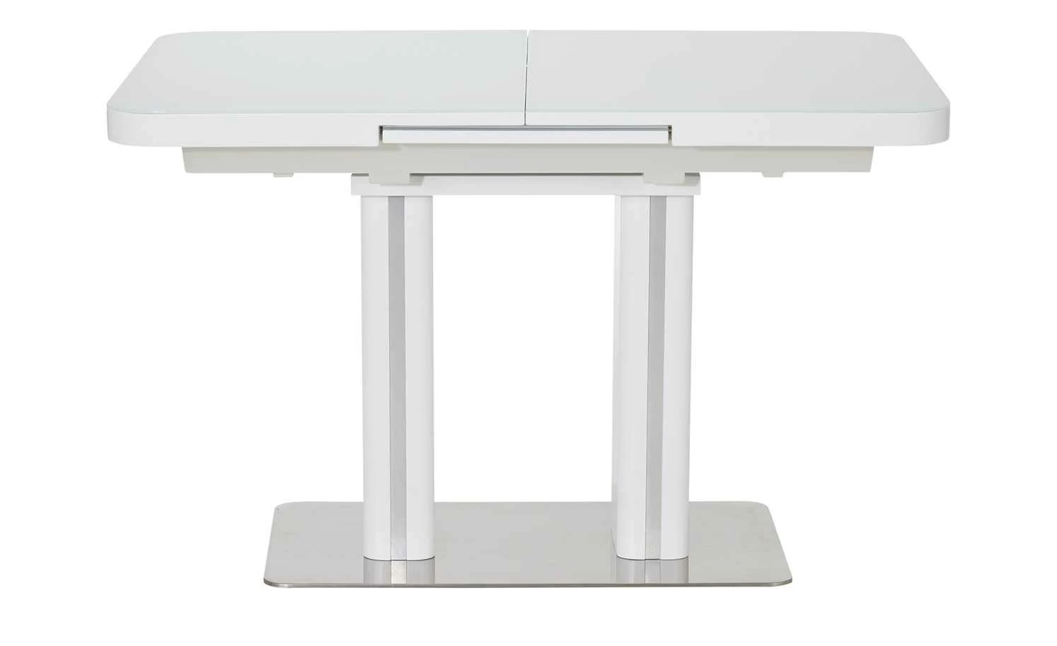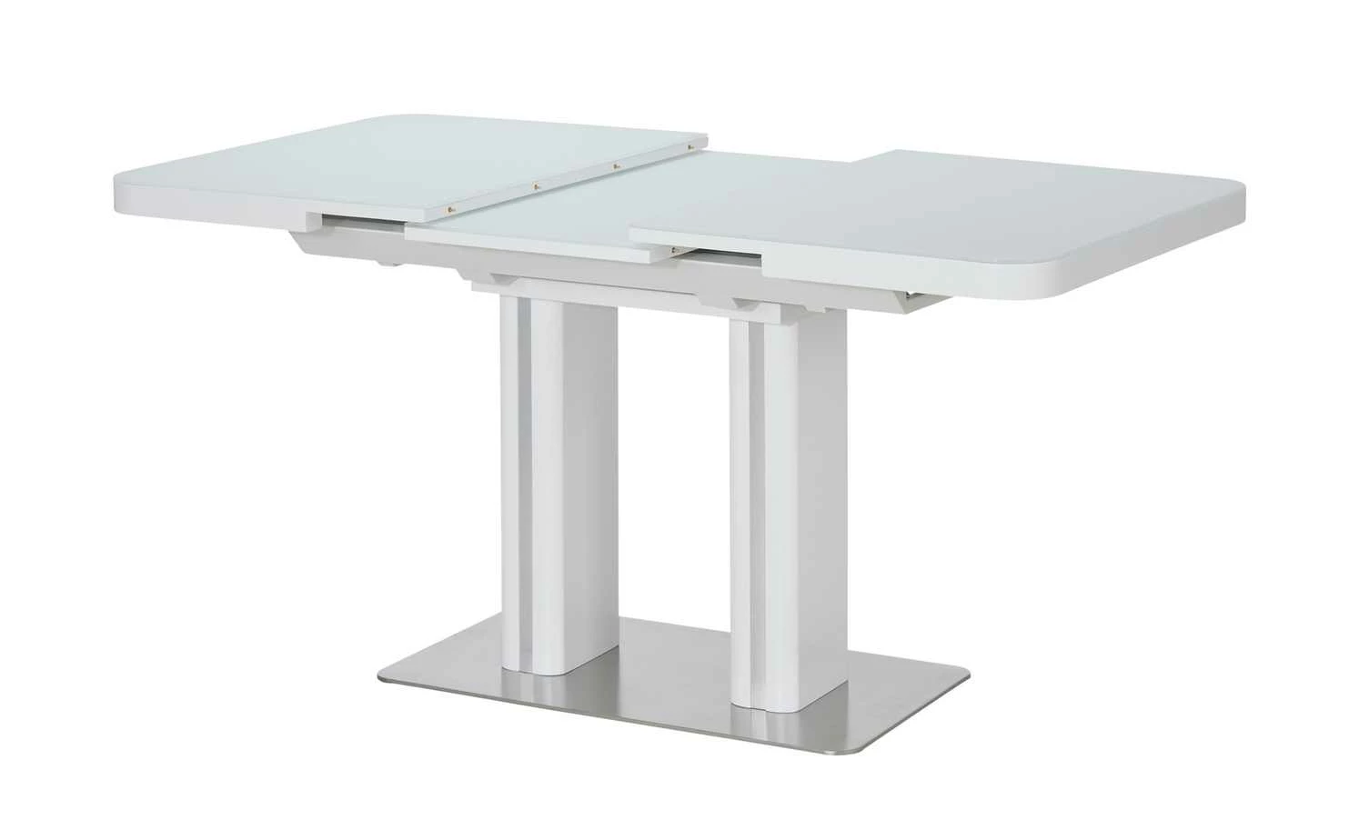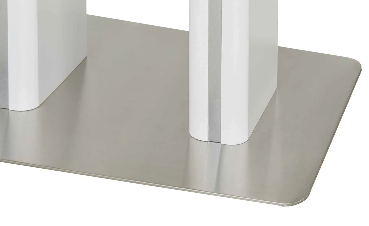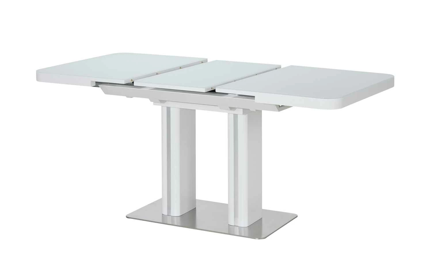 Modern und funktional: Der Esstisch Tizian in Weiß mit dekorativen Elementen in Edelstahl-Optik. Tizian ist ein ausziehbarer Esstisch und lässt sich durch den integrierten Mittelauszug kinderleicht auf 160 Zentimeter erweitern. Bei Bedarf bietet er dann Platz für bis zu acht Personen. Die weiße Tischplatte hat eine Glasoberfläche und lässt sich dadurch besonders einfach abwischen. Die beiden eckigen Säulentischbeine stehen auf einer Bodenplatte aus Edelstahl und sorgen für ein Plus an Stabilität. Tizian verleiht Ihrem Esszimmer ein modernes und leicht futuristisches Aussehen.