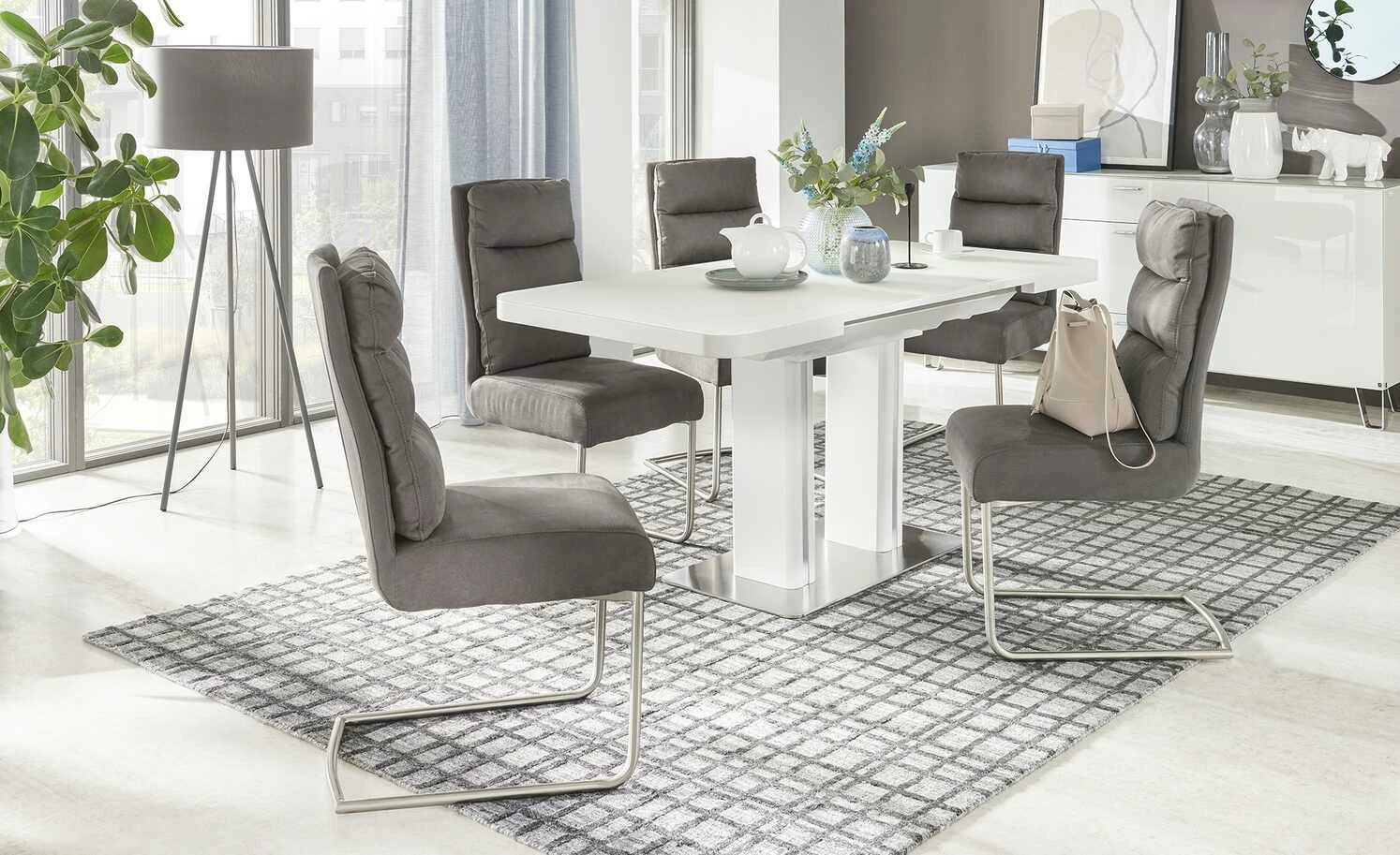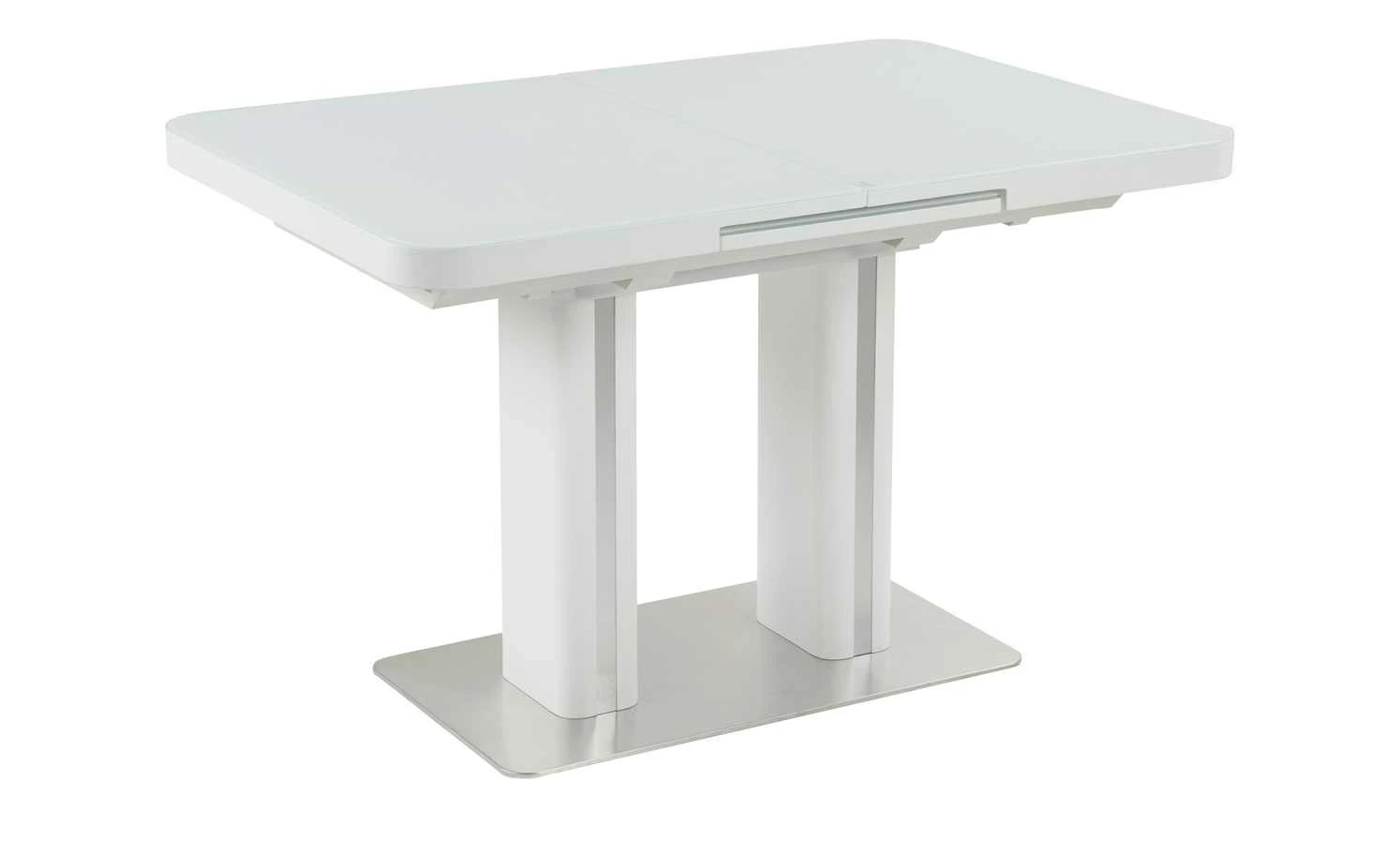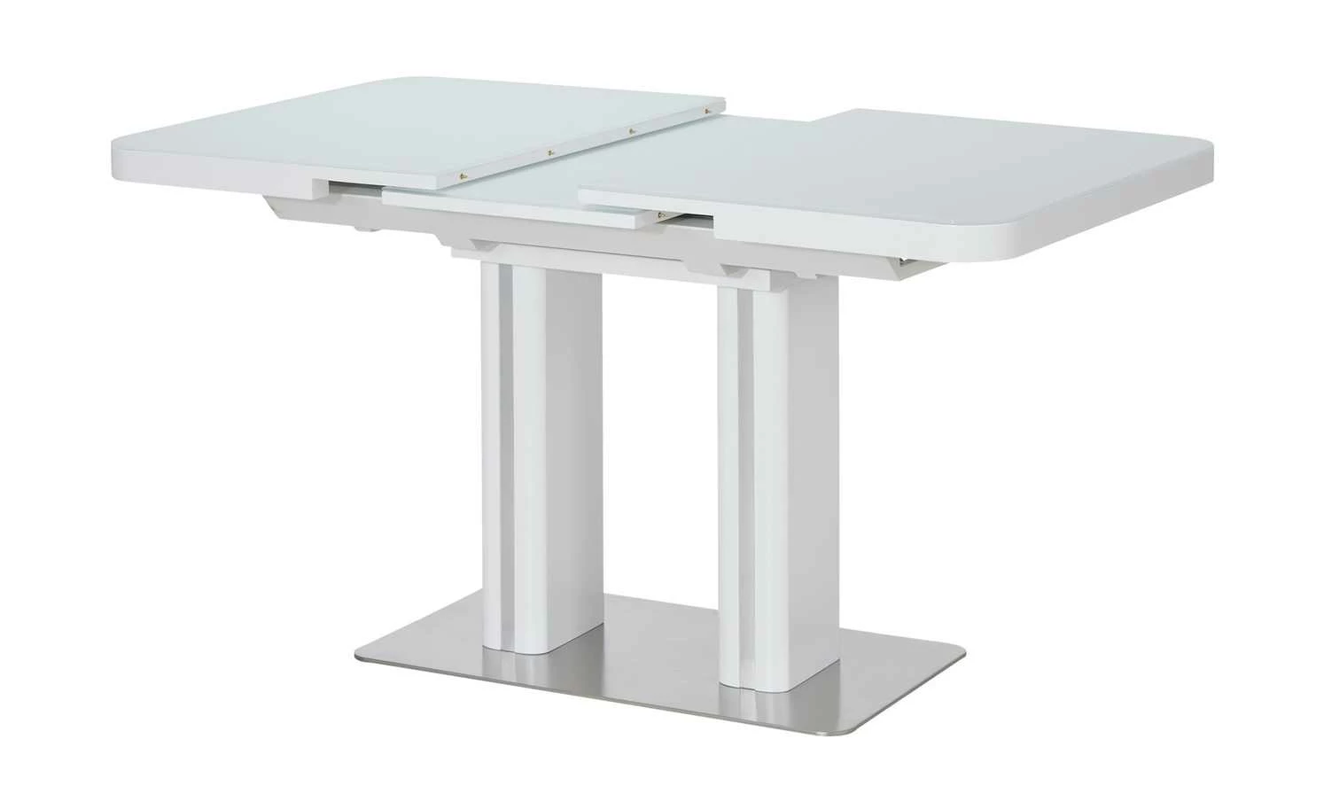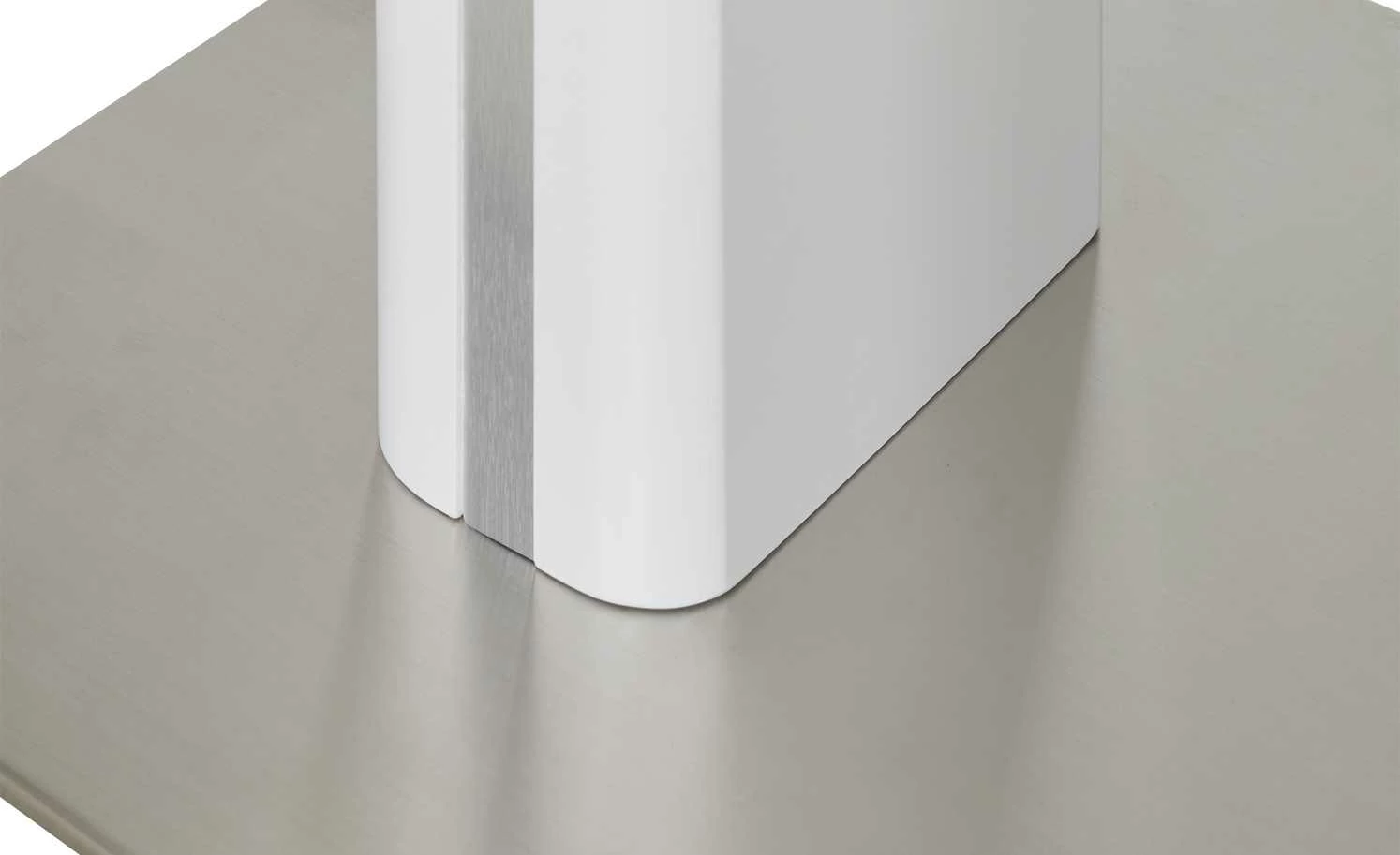 Modern und funktional: Der Esstisch Tizian in Weiß mit dekorativen Elementen in Edelstahl-Optik. Tizian ist ein ausziehbarer Esstisch und lässt sich durch den integrierten Mittelauszug kinderleicht auf 160 Zentimeter erweitern. Bei Bedarf bietet er dann Platz für bis zu acht Personen. Die weiße Tischplatte hat eine Glasoberfläche und lässt sich dadurch besonders einfach abwischen. Die beiden eckigen Säulentischbeine stehen auf einer Bodenplatte aus Edelstahl und sorgen für ein Plus an Stabilität. Tizian verleiht Ihrem Esszimmer ein modernes und leicht futuristisches Aussehen.