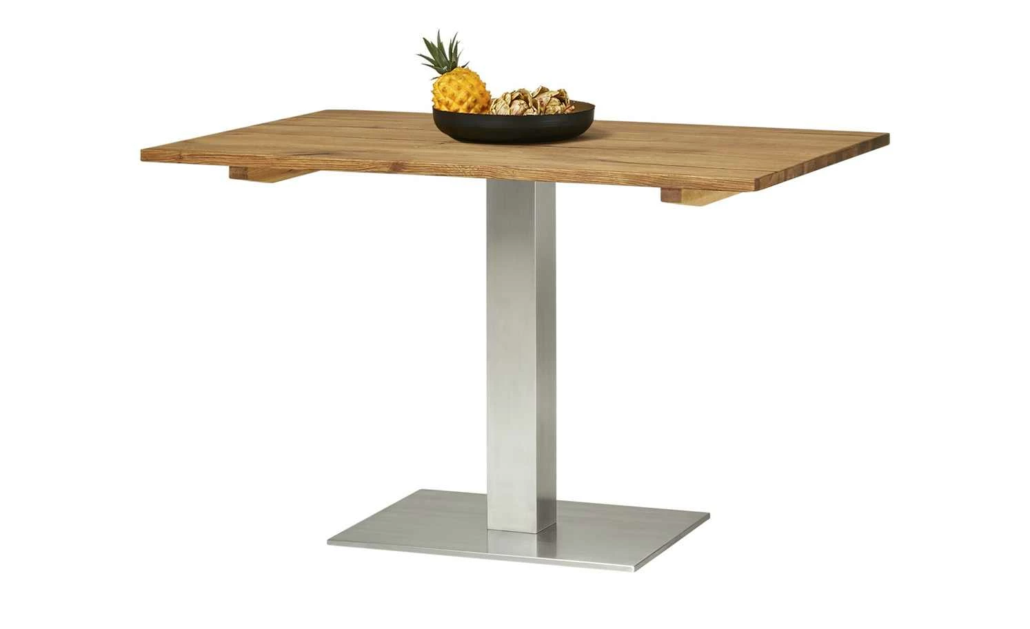 Massivholz und Metall lassen sich toll kombinieren. Das beweist der Esstisch Ferry. Die Tischplatte ist aus massivem Eichenholz. Die Oberfläche wurde geölt, um das Holz besser zu schützen. Die natürliche Maserung und Struktur sind dennoch gut zu erkennen. Unebenheiten und Risse im Holz sind gewollt und machen den besonderen Charme aus. Einen totalen Kontrast stellt das Gestell in Säulenform dar. Die Säule und die Bodenplatte sind beide aus gebürstetem Edelstahl.