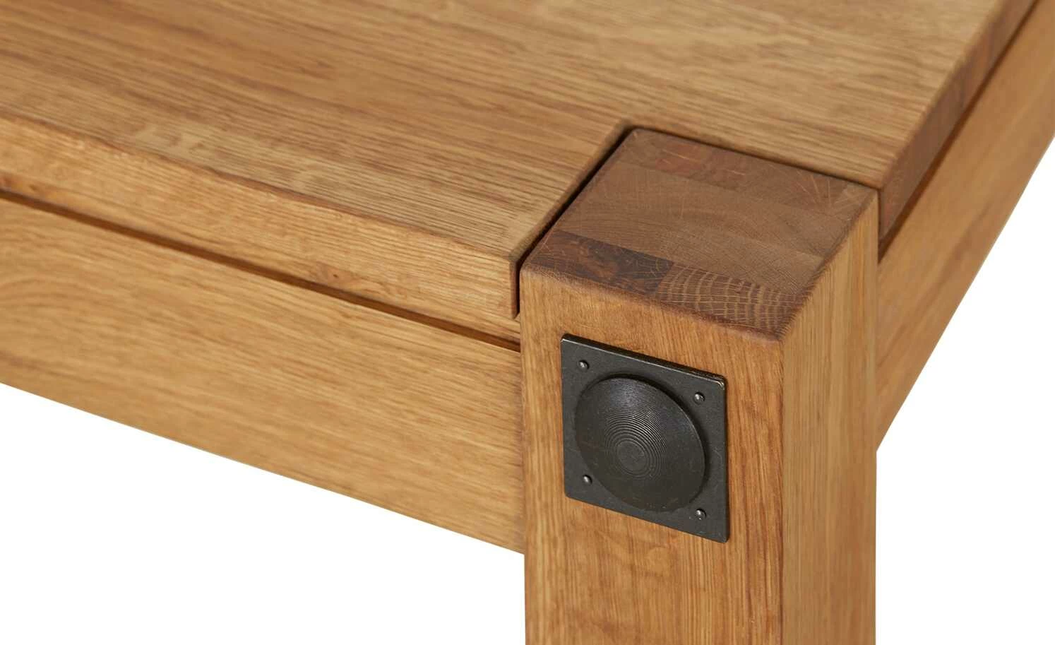 Der robuste Esstisch aus der Serie Freddy bietet Ihnen Platz für vier Personen. Die Oberfläche wurde geölt, um dem Tisch eine antik-wirkende Optik zu verleihen. Die natürliche Struktur des Holzes mit Rissen, Unebenheiten und der typischen Maserung ist dennoch gut zu erkennen. Am oberen Ende der Tischbeine in Höhe der Tischplatte sind dunkle Eisenbeschläge angebracht, die dem Tisch eine rustikale Note verleihen.