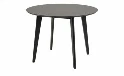 Komplett in schlichtem Schwarz gehalten, fügt sich der Esstisch Robin in nahezu alle Einrichtungsstile problemlos ein. Die runde Tischplatte besitzt einen Durchmesser von 105 Zentimetern und bietet bequem für vier Personen Platz. Das Tischgestell mit den vier Beinen ist aus Massivholz und damit besonders robust. Alle Oberflächen sind lackiert, sodass Sie Flecken ganz leicht abwischen können.