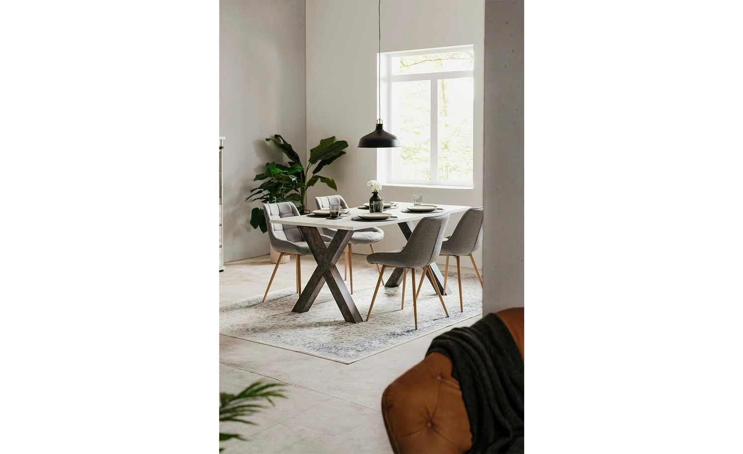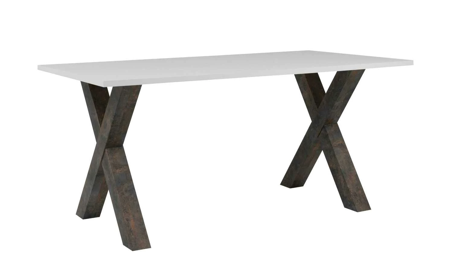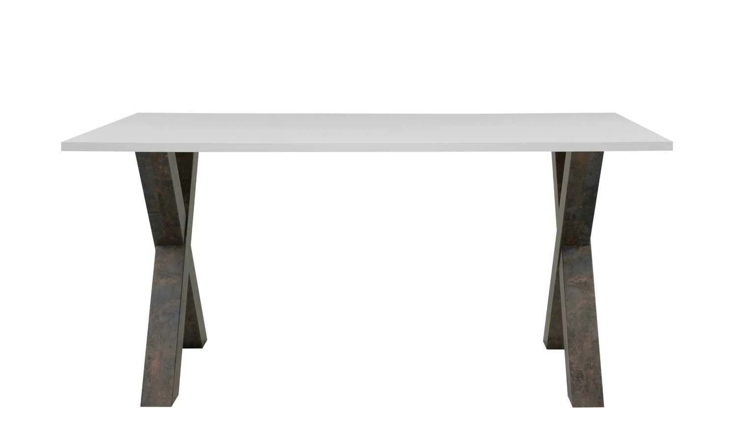 Der Esstisch Seviso besticht mit seinen auffälligen, x-förmigen Füßen. Sie besitzen eine attraktive Oberfläche in Rost-Optik und passen somit zur gleichnamigen Möbelserie. Die Kreuz-Füße tragen eine 90 x 160 Zentimeter große Tischplatte in Weiß, zu der Sie problemlos bunte Tischläufer und Platz-Sets kombinieren können.