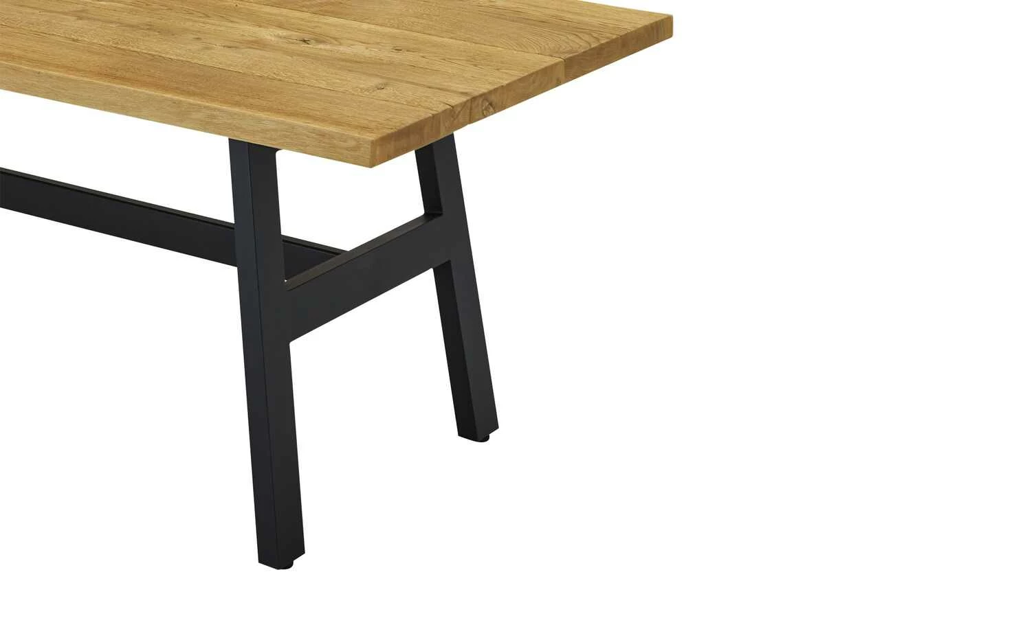 - Mehr zur Ausführung: Mit Baumkante – jeder Tisch ein Unikat!, Tischplatte aus Barock-Eiche massiv, Derbe Eiche mit Plankenkerbe, sowie urwüchsigen Ästen und Strukurmerkmalen, Eisen H-Gestell mit Steg