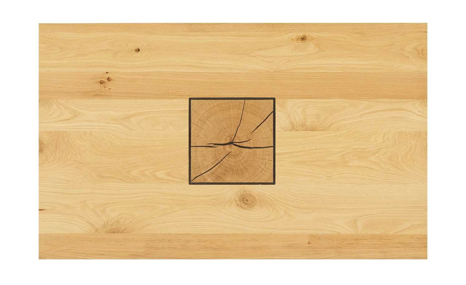 - Mehr zum Material: Bodenplatte: Metall Schwarz lackiert, Tischplatte und Säule: Wildeiche furniert, geölt