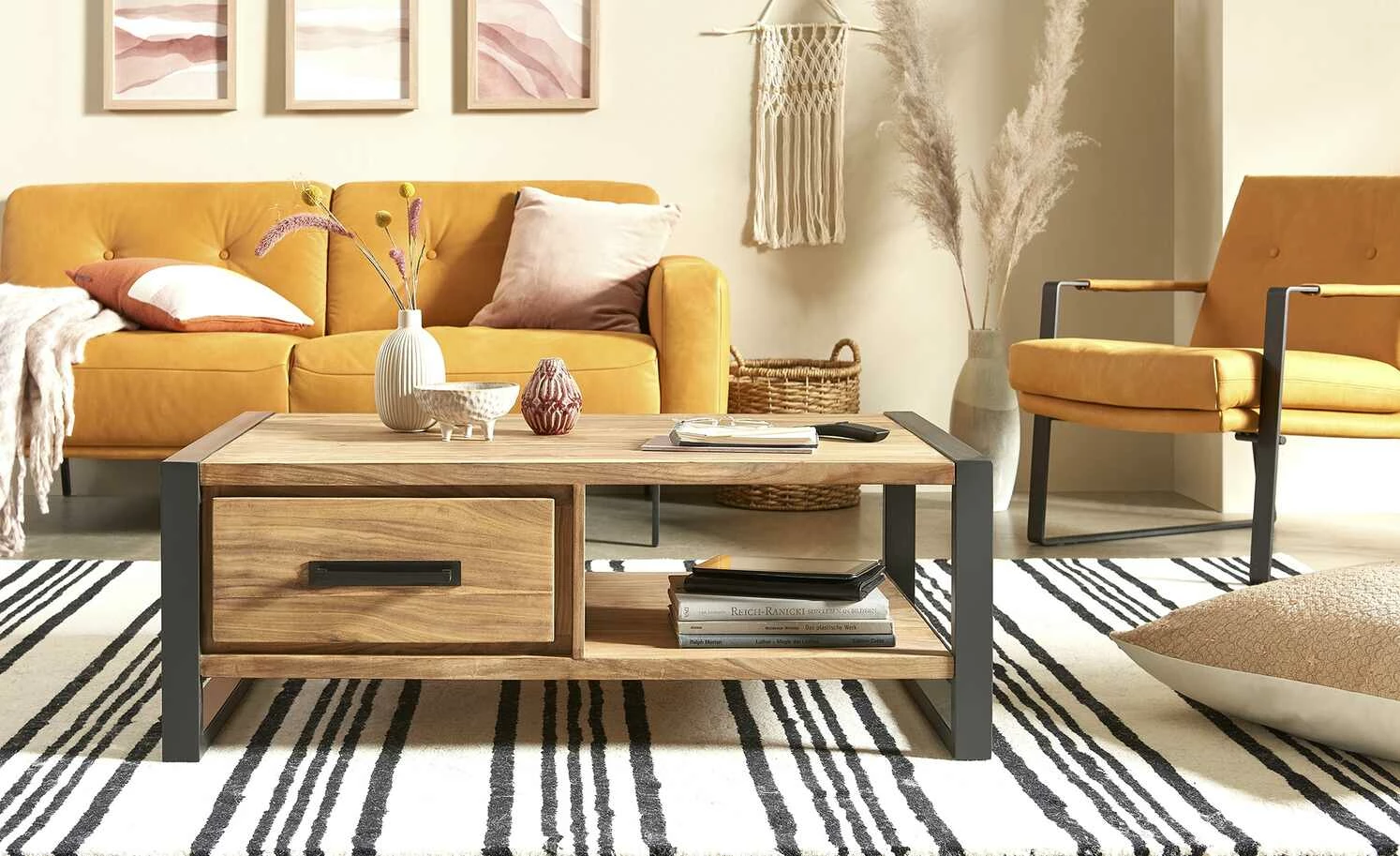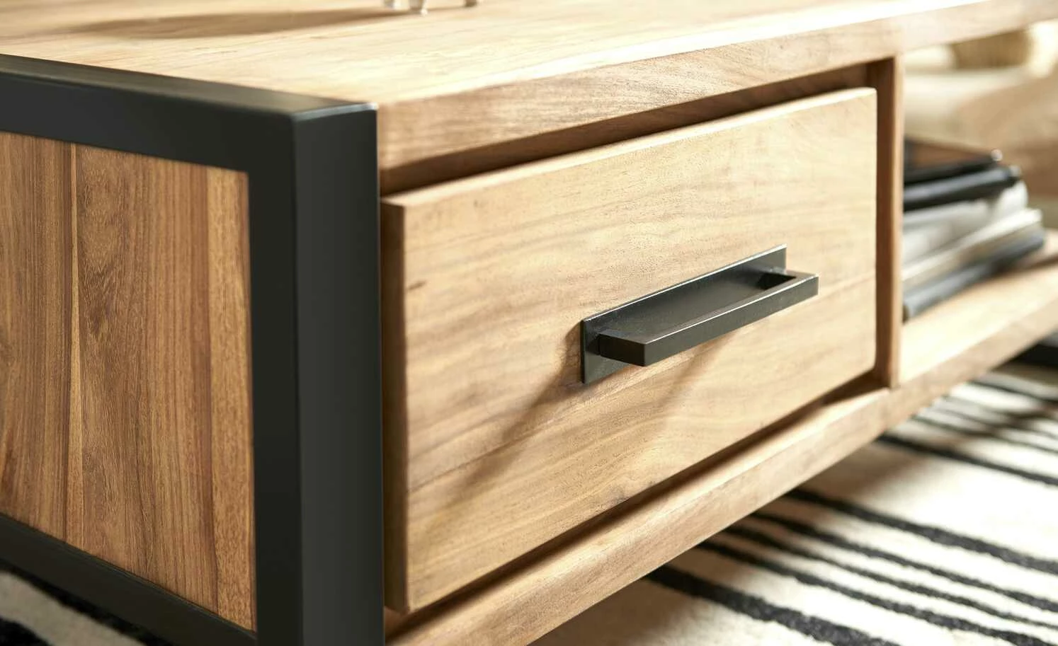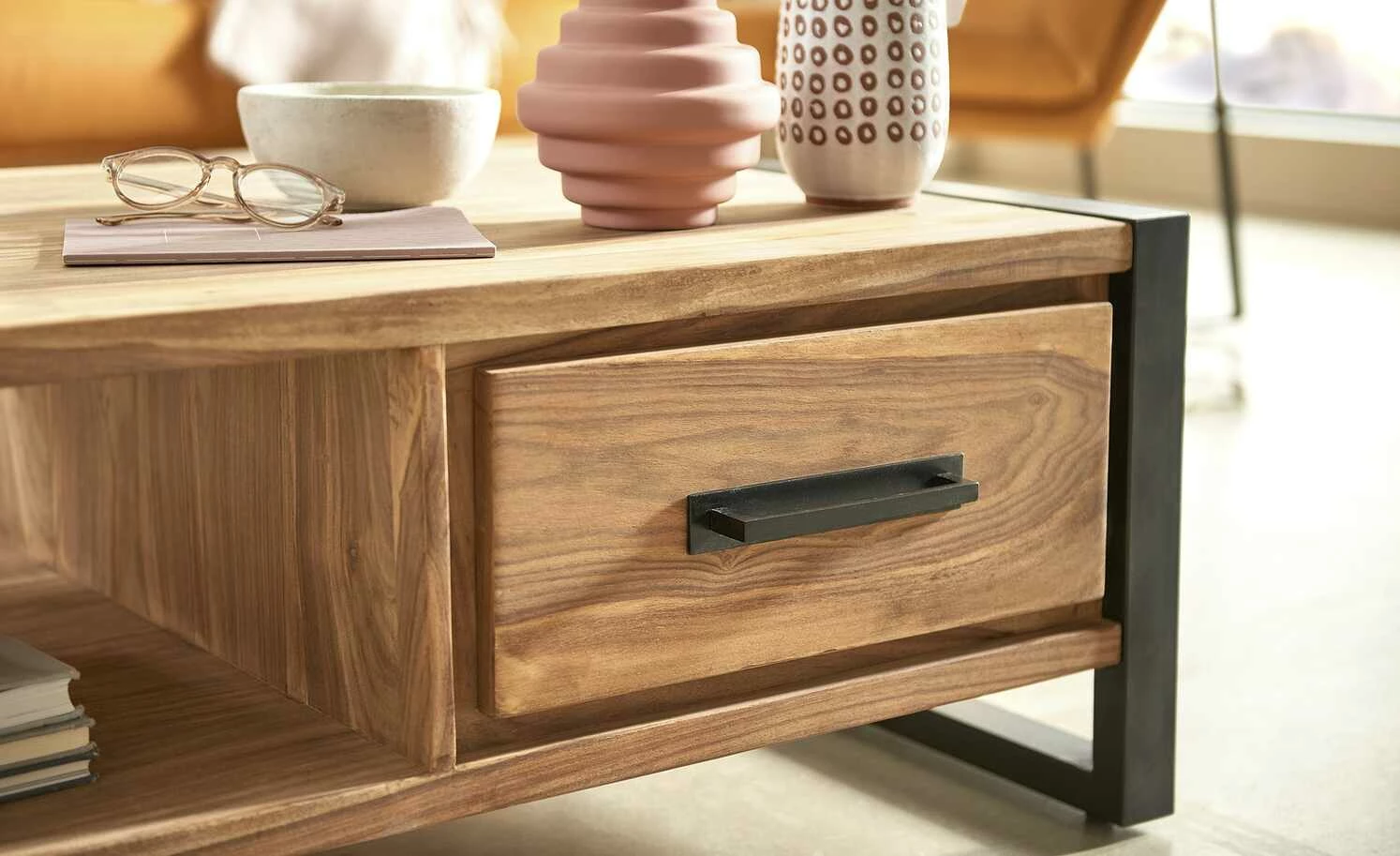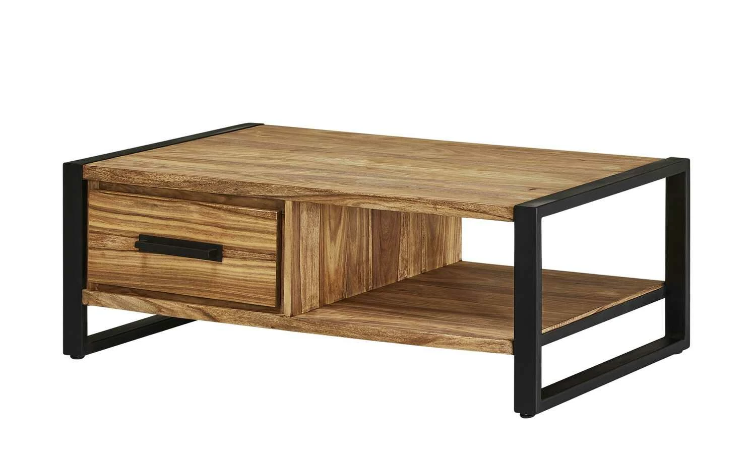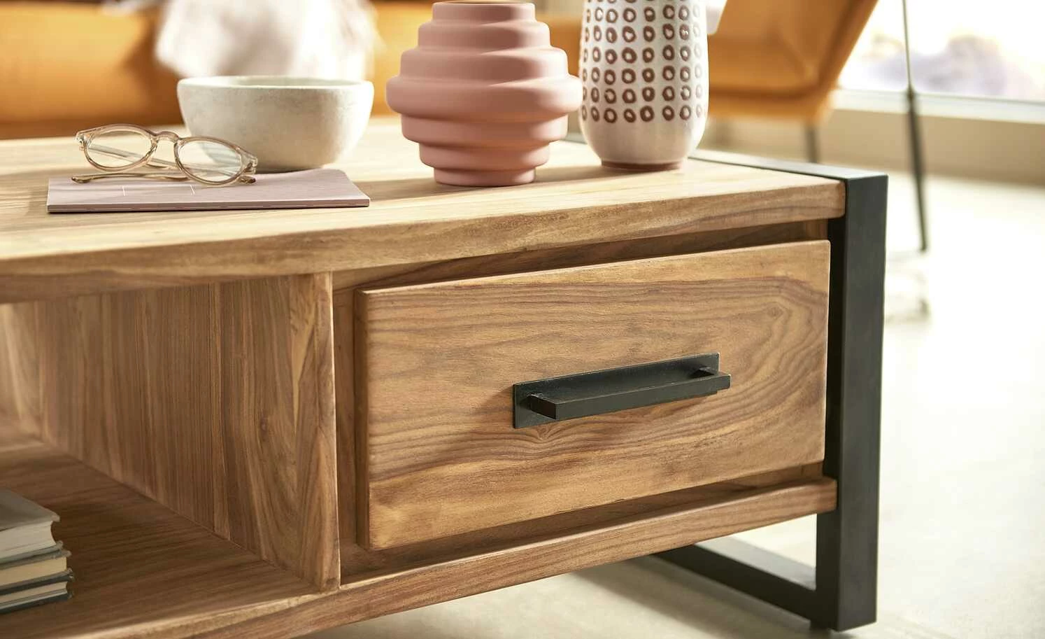 Der Couchtisch Tierra Fuego One von Gray & Jones bietet Ablageflächen und Stauraum. Unterhalb der Tischplatte verfügt er über ein Fach und zwei Schubladen. Letztere sind mit einer Soft-Close-Funktion ausgestattet, die für ein leises Schließen sorgt. Der Tisch ist mit Sheesham furniert, wobei das Holz bewusst unbehandelt belassen worden ist. Dadurch kommt die ausgeprägte Maserung toll zur Geltung, sie ist ein besonderer Eyecatcher. Das Gestell und der Griff setzen sich kontrastreich ab. Sie bestehen aus schwarz lackiertem Eisen.