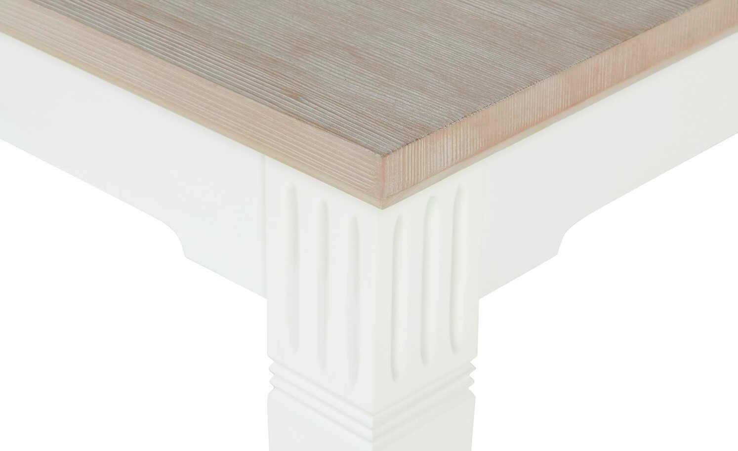 - Mehr zum Material: Gestell: MDF (Mitteldichte Faserplatte) lackiert in Weiß, Tischplatte: Fichte furniert, gebürstet und gekälkt in Antik Braun