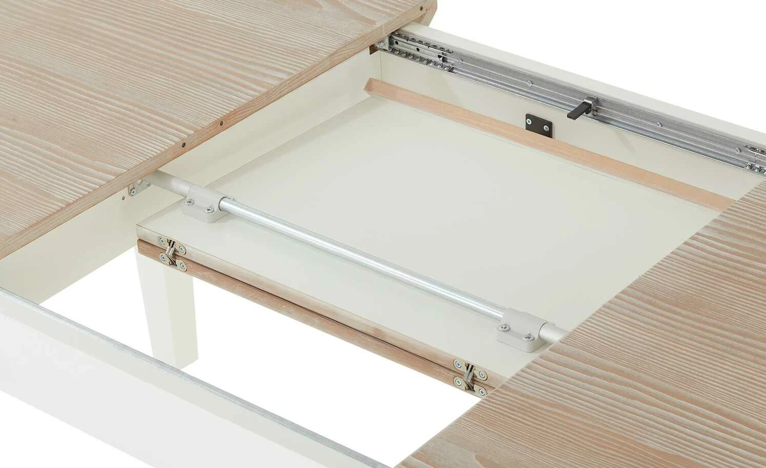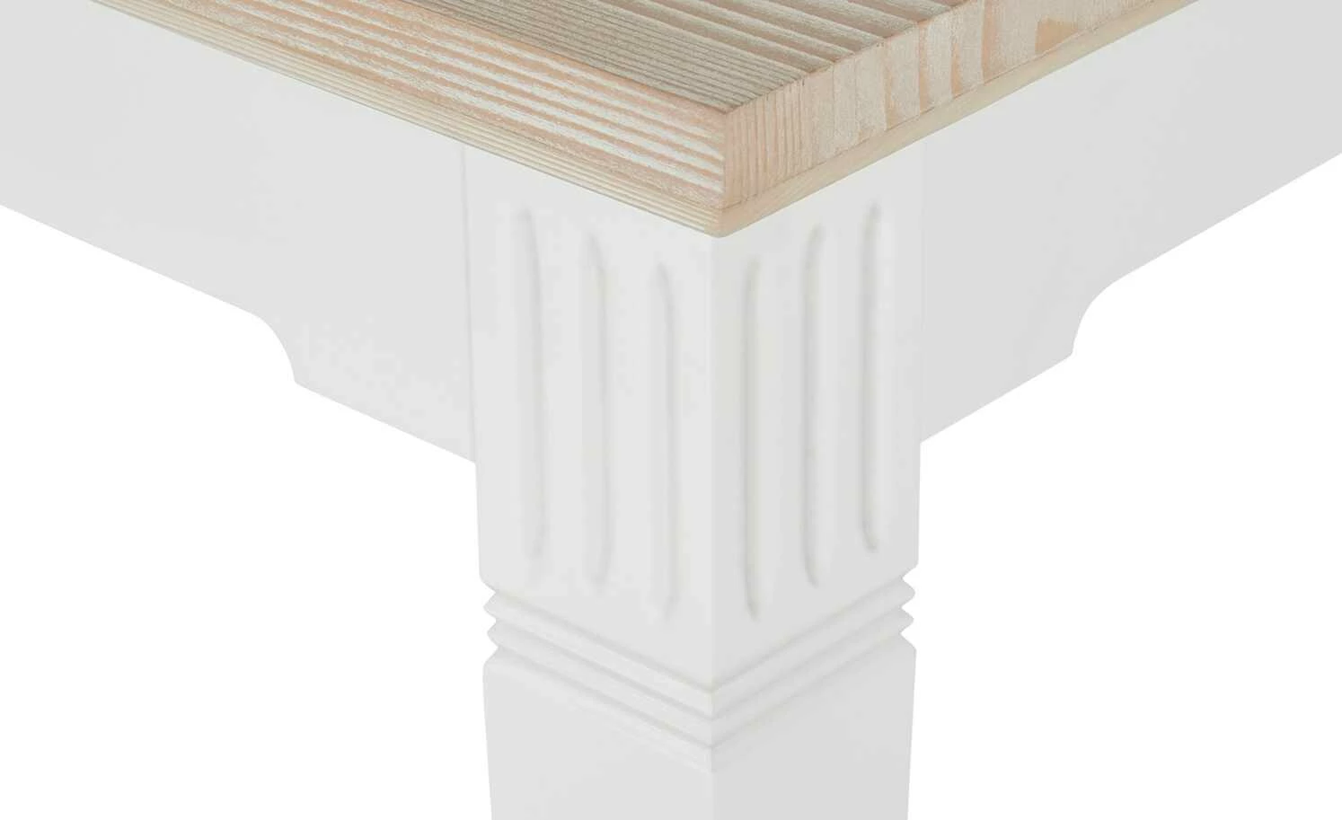 - Mehr zum Material: Gestell: MDF (Mitteldichte Faserplatte) lackiert in Weiß, Tischplatte: Fichte furniert, gebürstet und gekälkt in Antik Braun