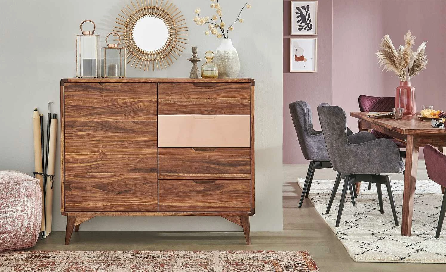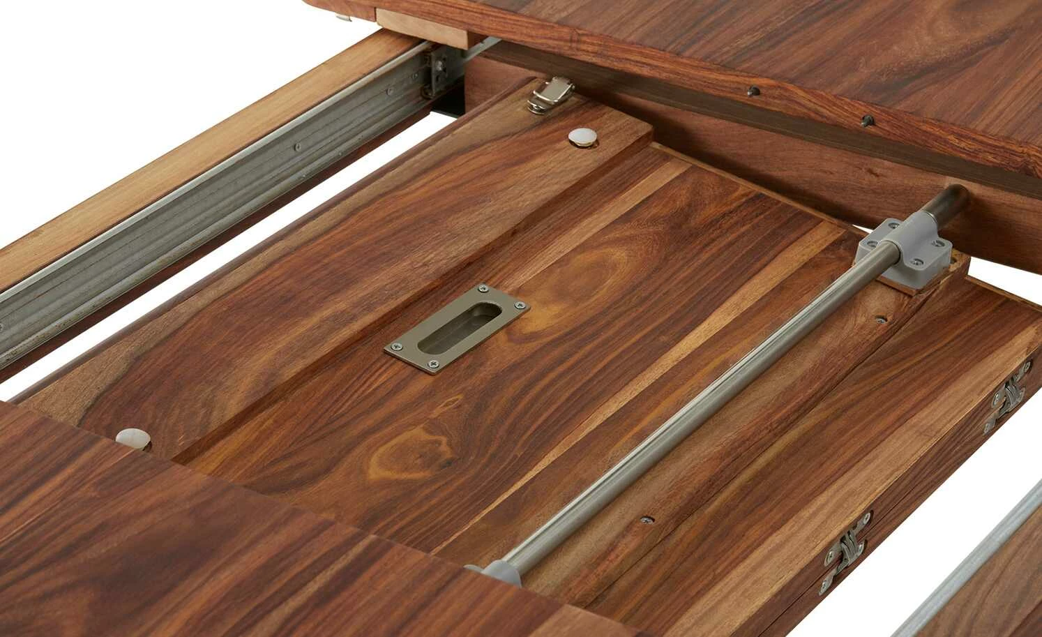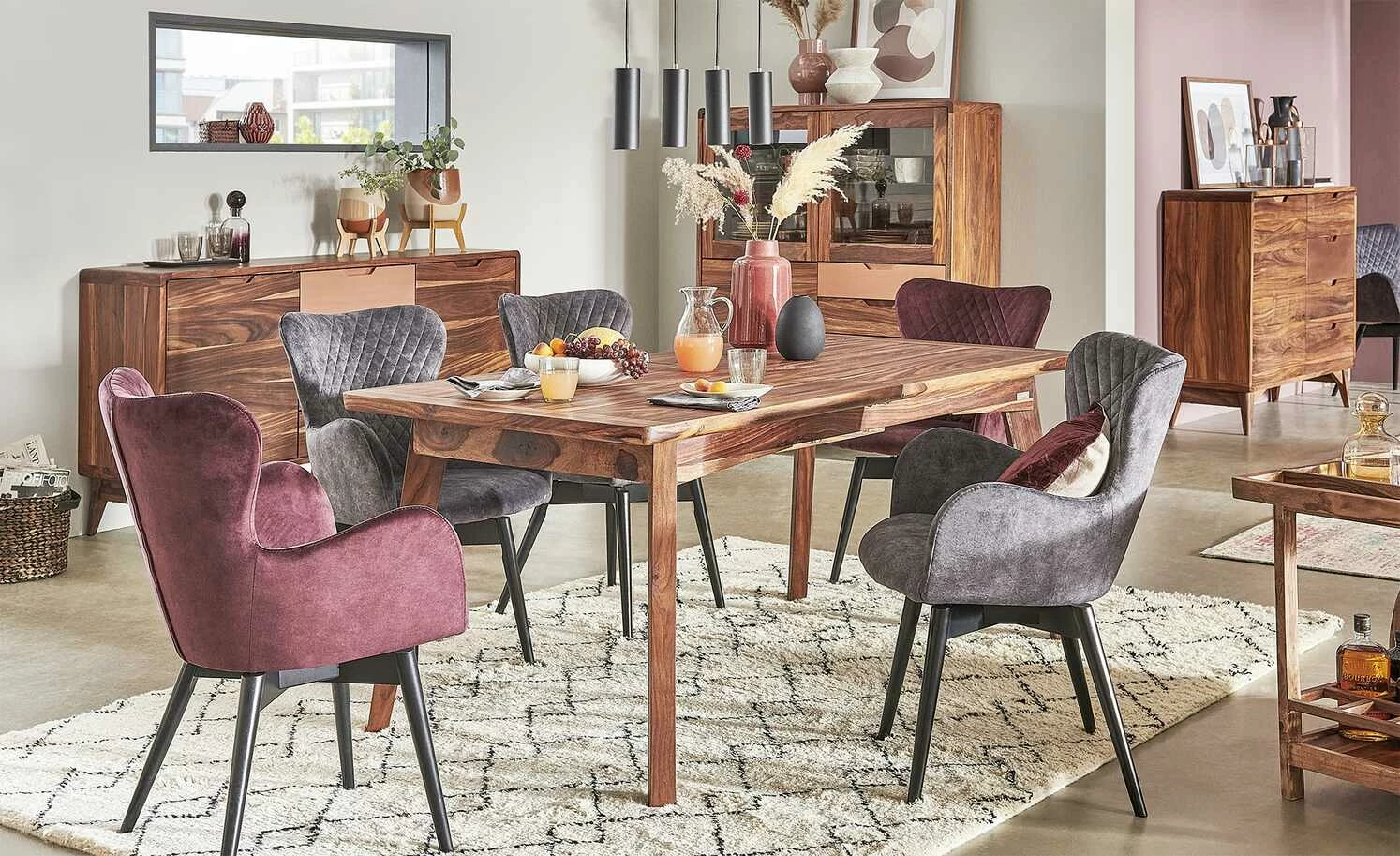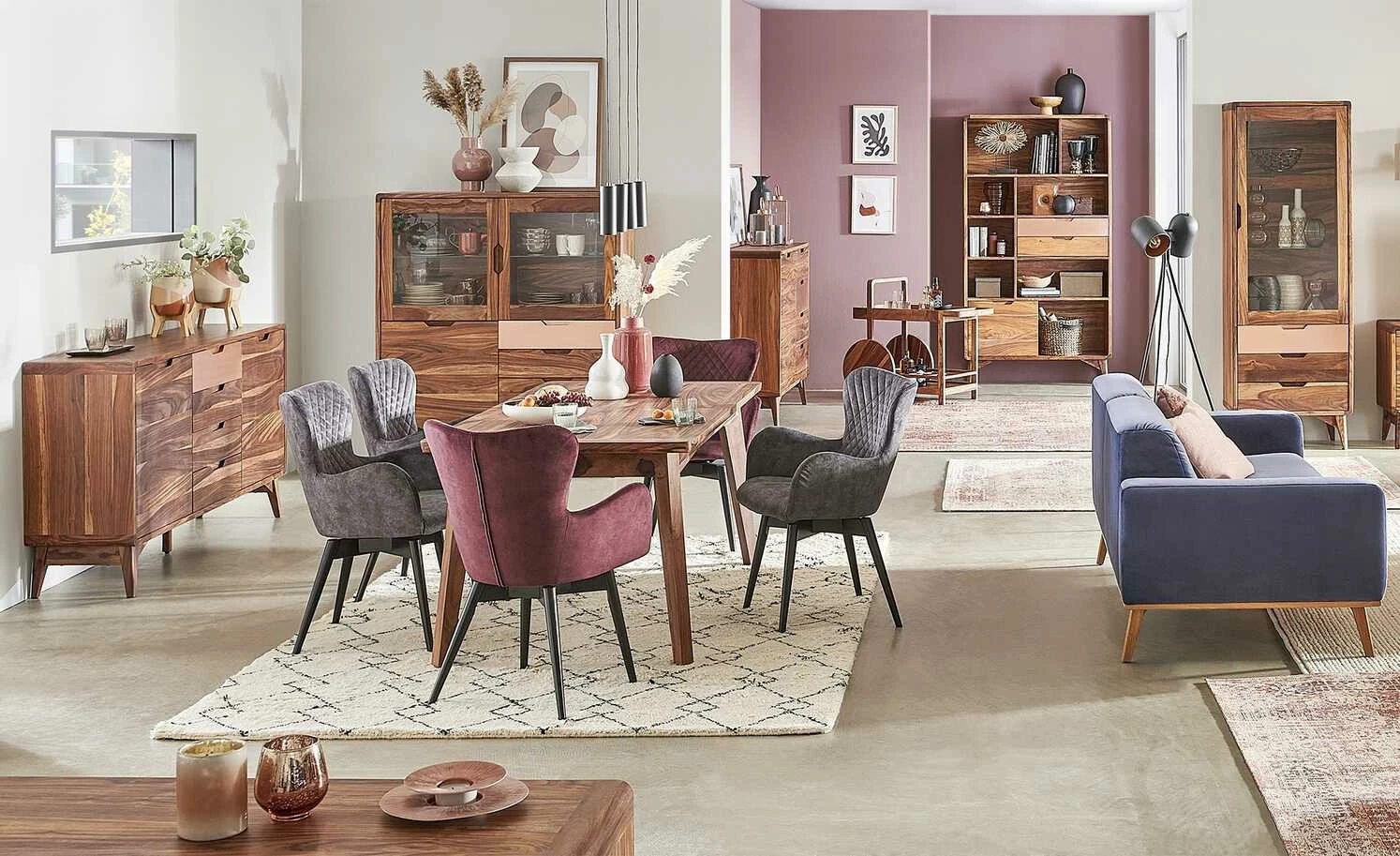 - Mehr zum Material: Tischplatte und Gestell in Sheesham furniert, Lackbeschichtung Natur