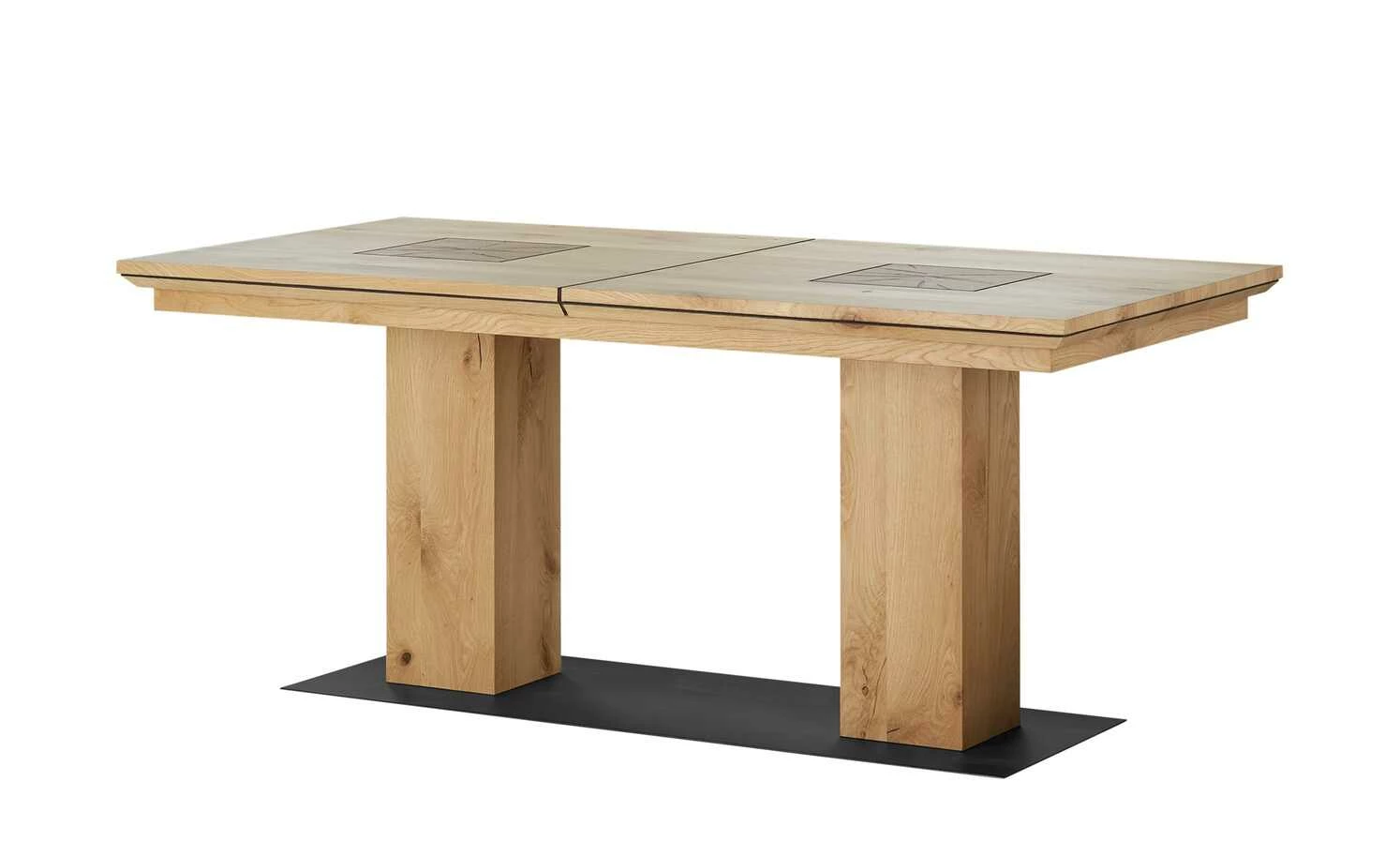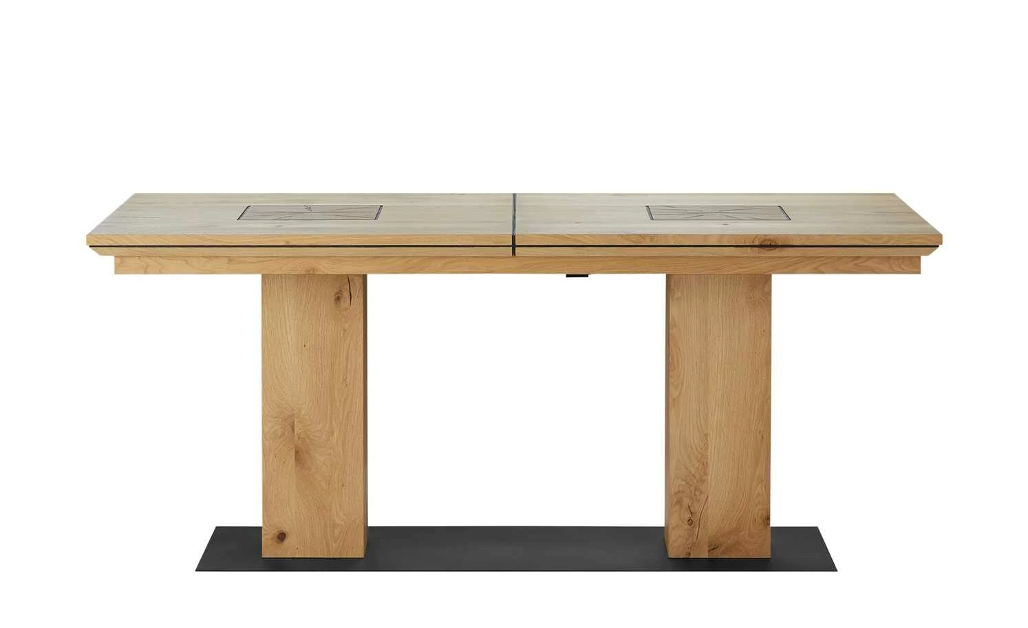 - Mehr zum Material: Bodenplatte: Metall Schwarz lackiert, Tischplatte und Säulen: Wildeiche furniert, geölt