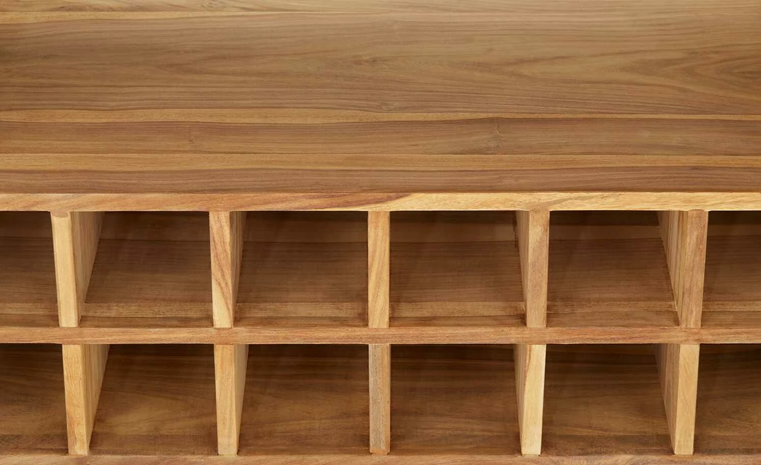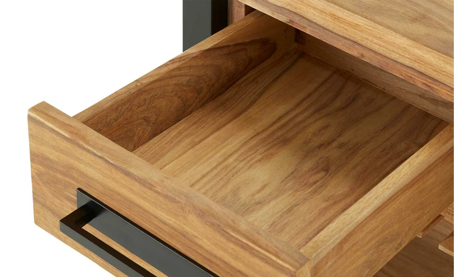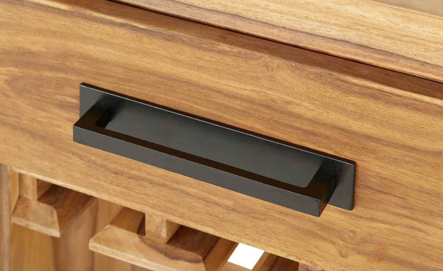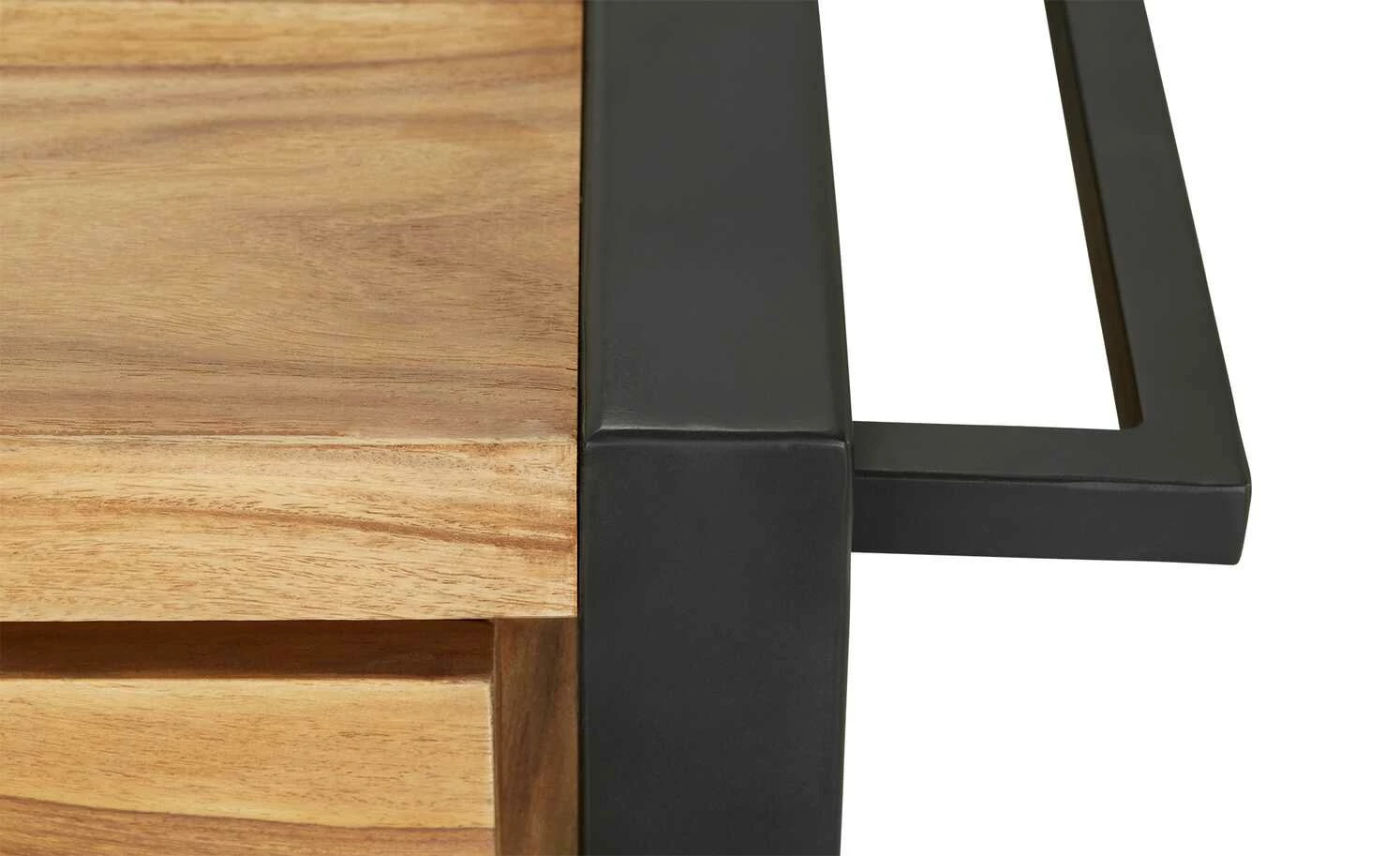 - Mehr zum Material: Gestell: Eisen Schwarz lackiert, Tischlerplatte: Vollholz-Platte mit zwei Schichten aus Sheeshamfurnier und einer mittleren Schicht aus Kiefer-Massivholz-Leisten, Korpus, Front & Tischplatte: Tischlerplatte Sheesham furniert, natur