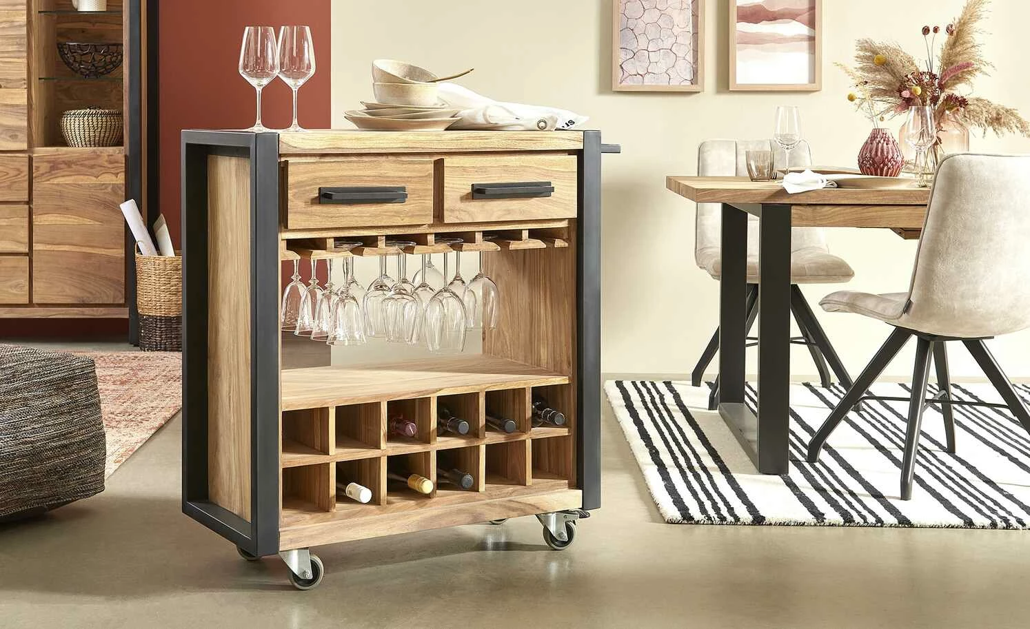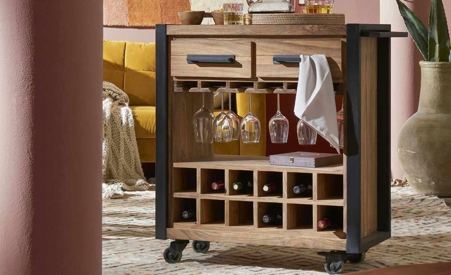 Zum Servieren, Aufbewahren und als Eyecatcher eignet sich der Servierwagen Tierra Fuego One von Gray & Jones. Er hat eine erstklassige Qualität und ist mit Sheeshamholz furniert. Für das Gestell ist stabiles, langlebiges Eisen verwendet worden. Der Wagen ist mit zwei Schubladen und einem großen Fach ausgestattet. Im Flaschenregal können Sie zwölf edle Tropfen oder auch andere Flaschen unterbringen. Die Glashalterung eignet sich für acht Stielgläser. Dank der Rollen ist Tierra Fuego One leicht beweglich. Der Griff kann zeitgleich als Handtuchhalterung verwendet werden.